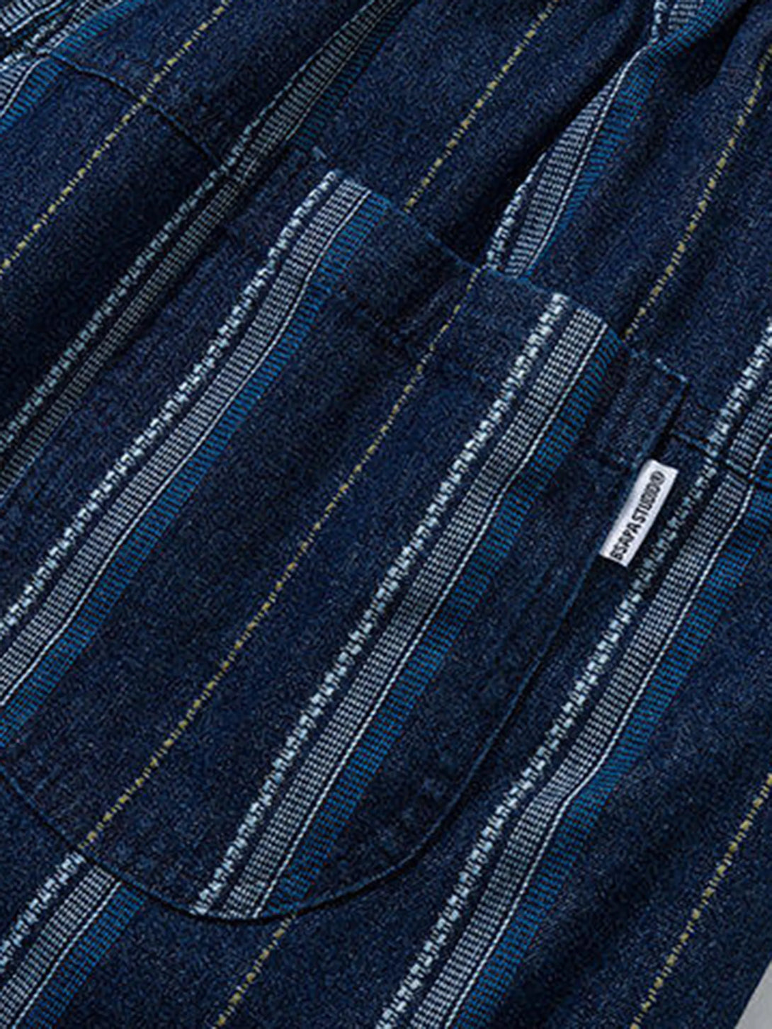 80%コットン×20%ポリエステルのストライプ生地をヴィンテージライクにウォッシュ加工し、程よい色落ち感と柔らかな風合いを実現。ウエストは伸縮性のあるゴム&ドローストリングでフィット感を自由に調整でき、両サイドの大きめポケットと右サイドのツールループが機能性をプラス。ゆったりしたワイドシルエットはどんなトップスにもマッチし、タウンからアウトドアまで幅広く活躍します。