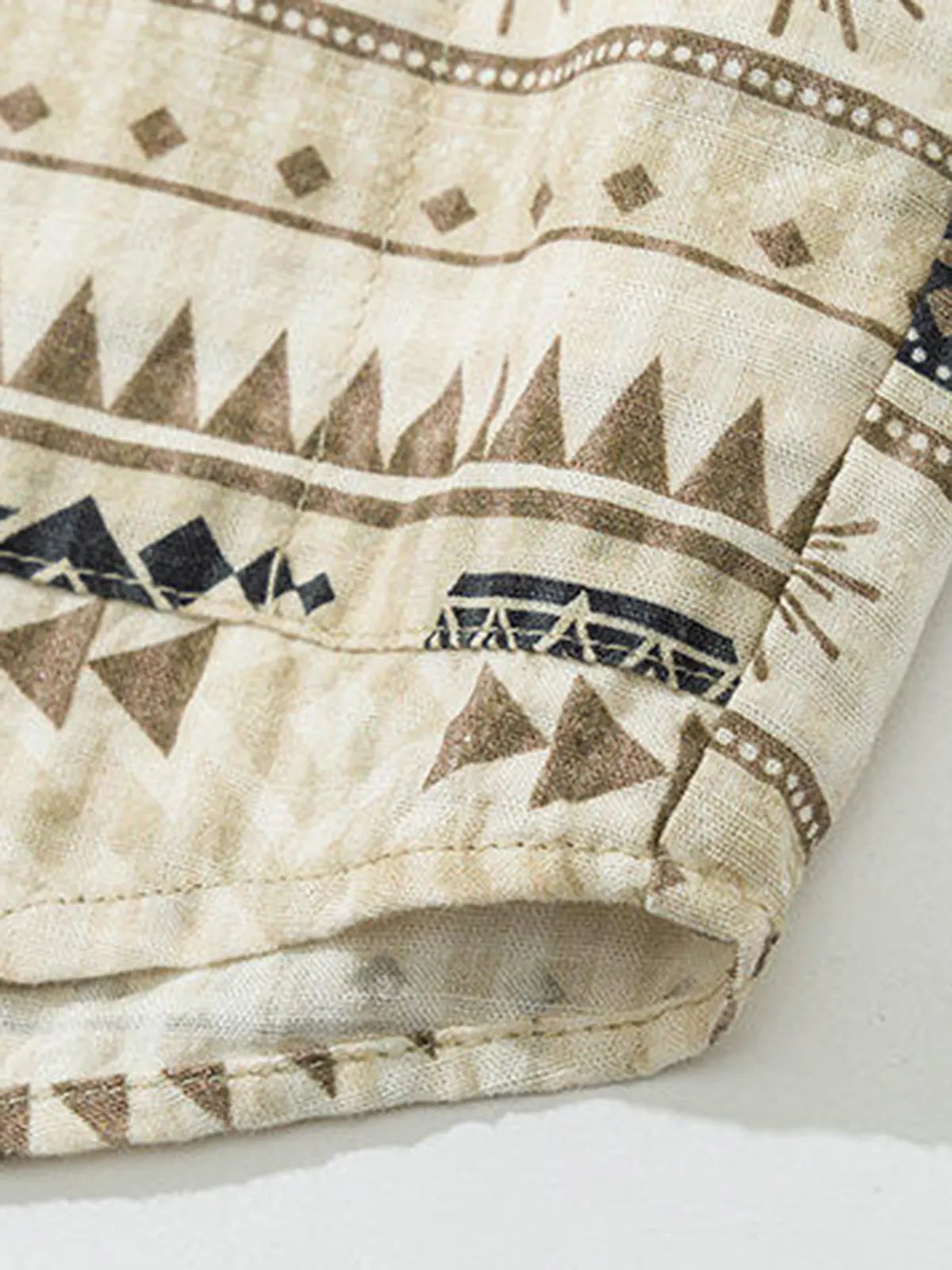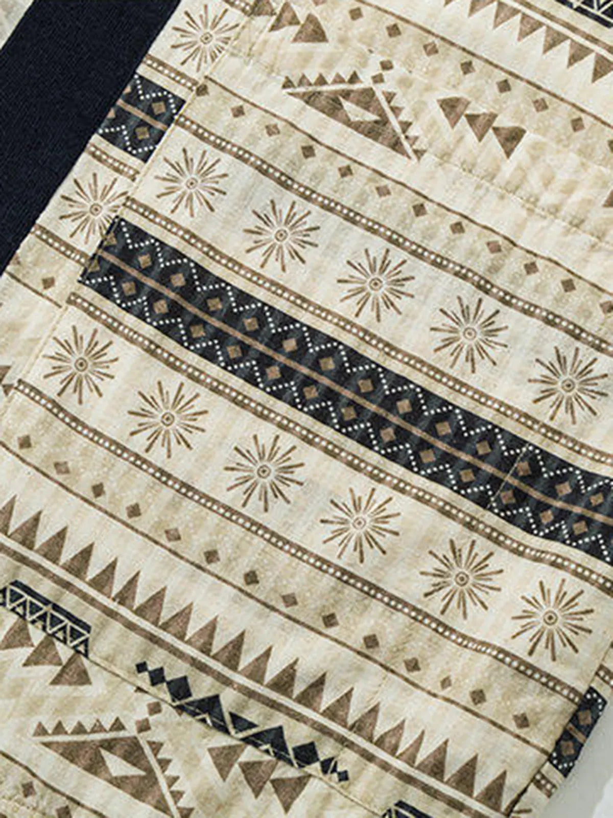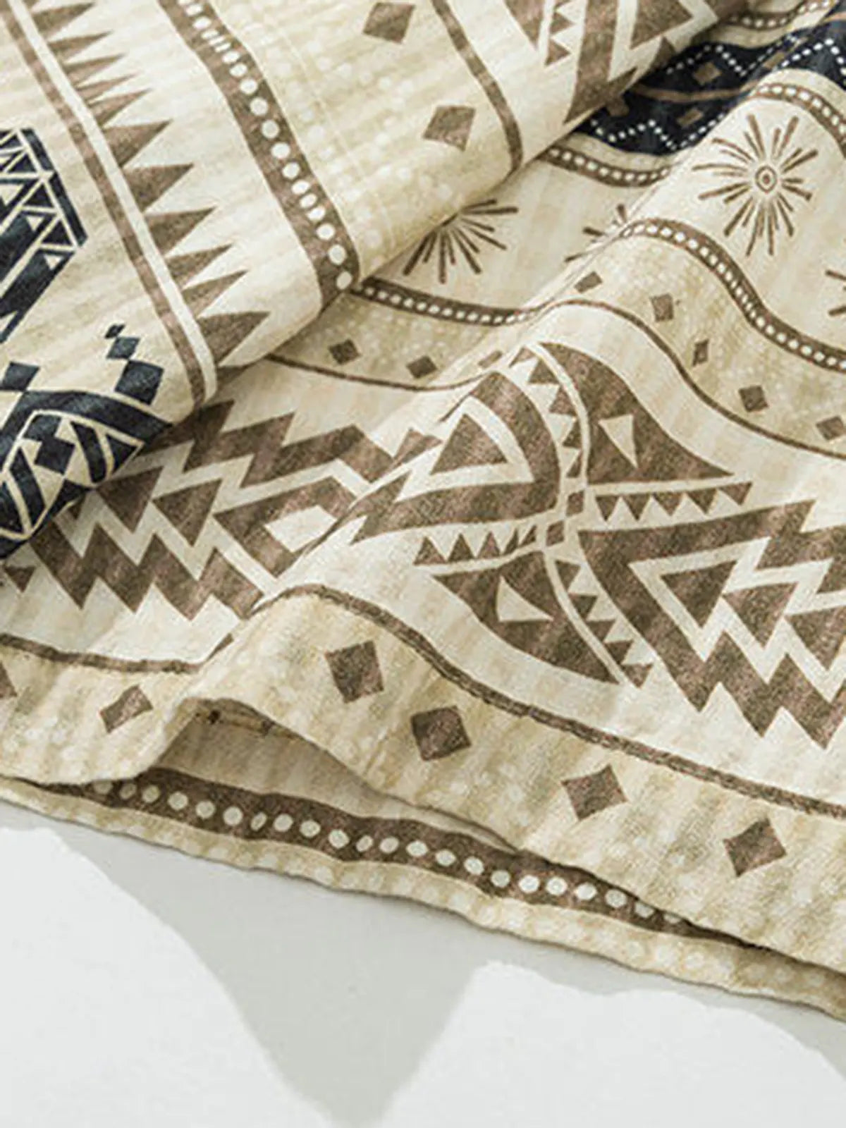 伝統的なネイティブ柄をあしらい、涼感あふれる薄手生地で仕立てた着流し襟スタイルの半袖シャツ。