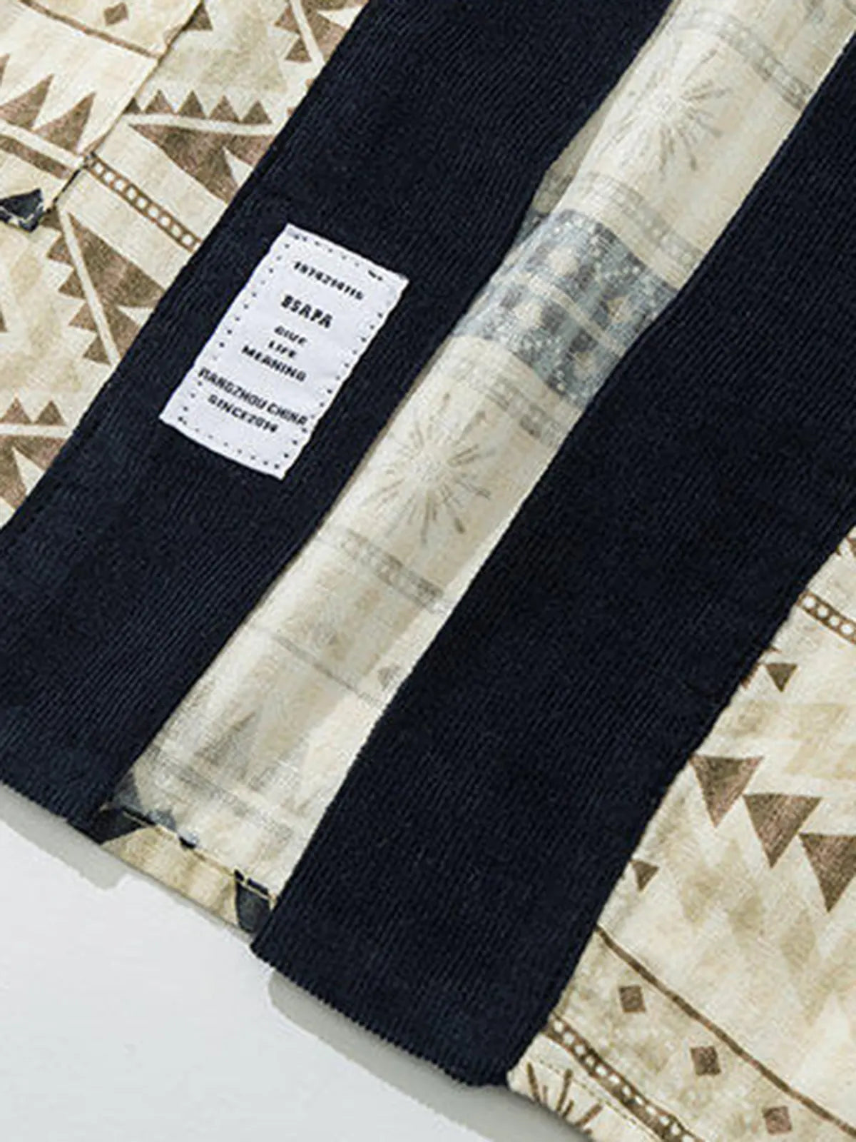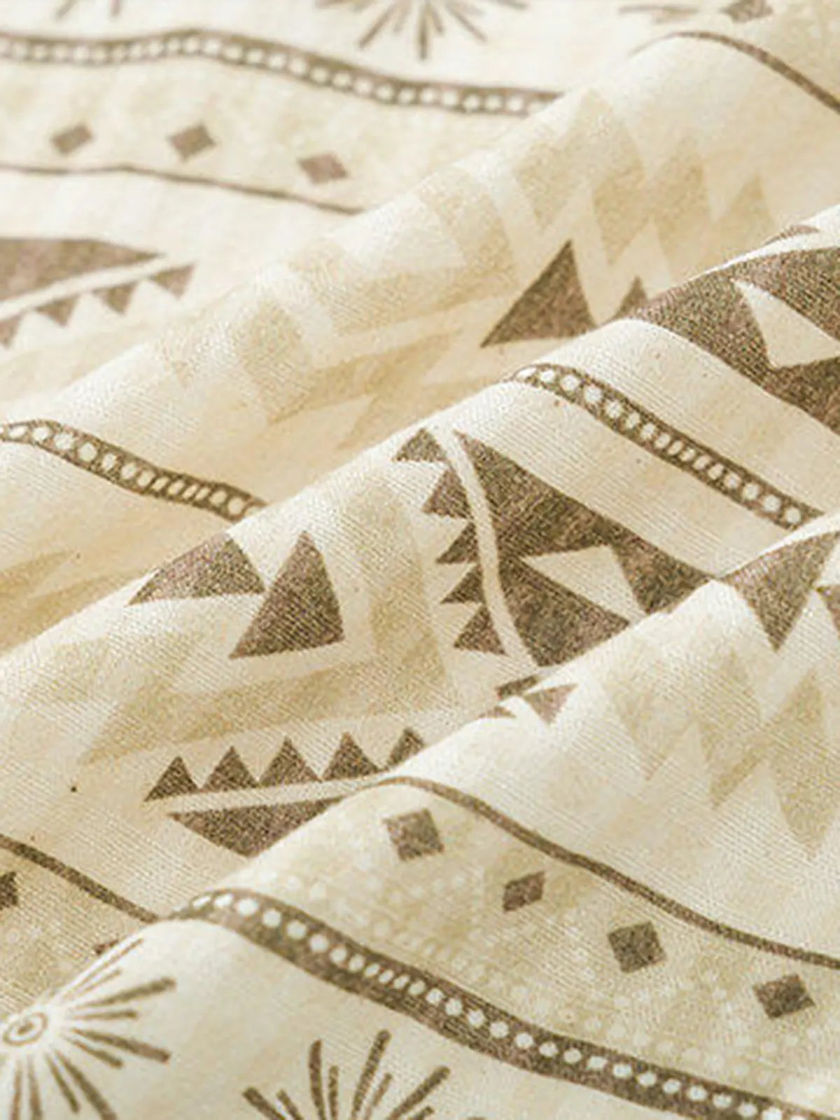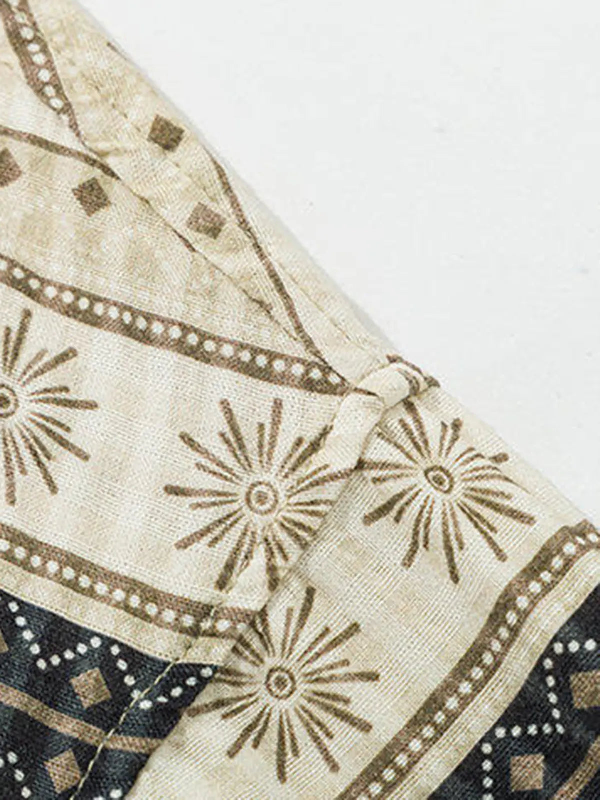 伝統的なネイティブ柄をあしらい、涼感あふれる薄手生地で仕立てた着流し襟スタイルの半袖シャツ。