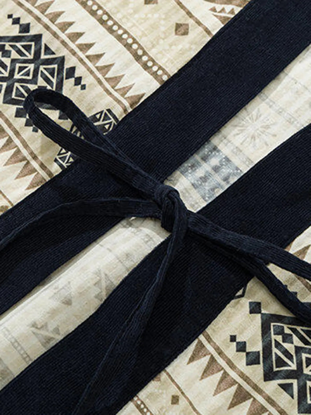 エスニックテキスタイルの象徴的なグラフィックを全面に配し、古来より儀式衣装として親しまれた着流し襟をモダンにアレンジ;通気性に優れた薄手の織り地は夏でもさらりと快適で、袖のゆったりとしたシルエットが風通しを高めます;フロントのリボンタイは着脱を容易にしつつ、腰元までカバーするレングスがリラックススタイルを完成;デニムやリネンパンツと合わせれば、リゾートからタウンまで幅広いコーディネートに対応します。