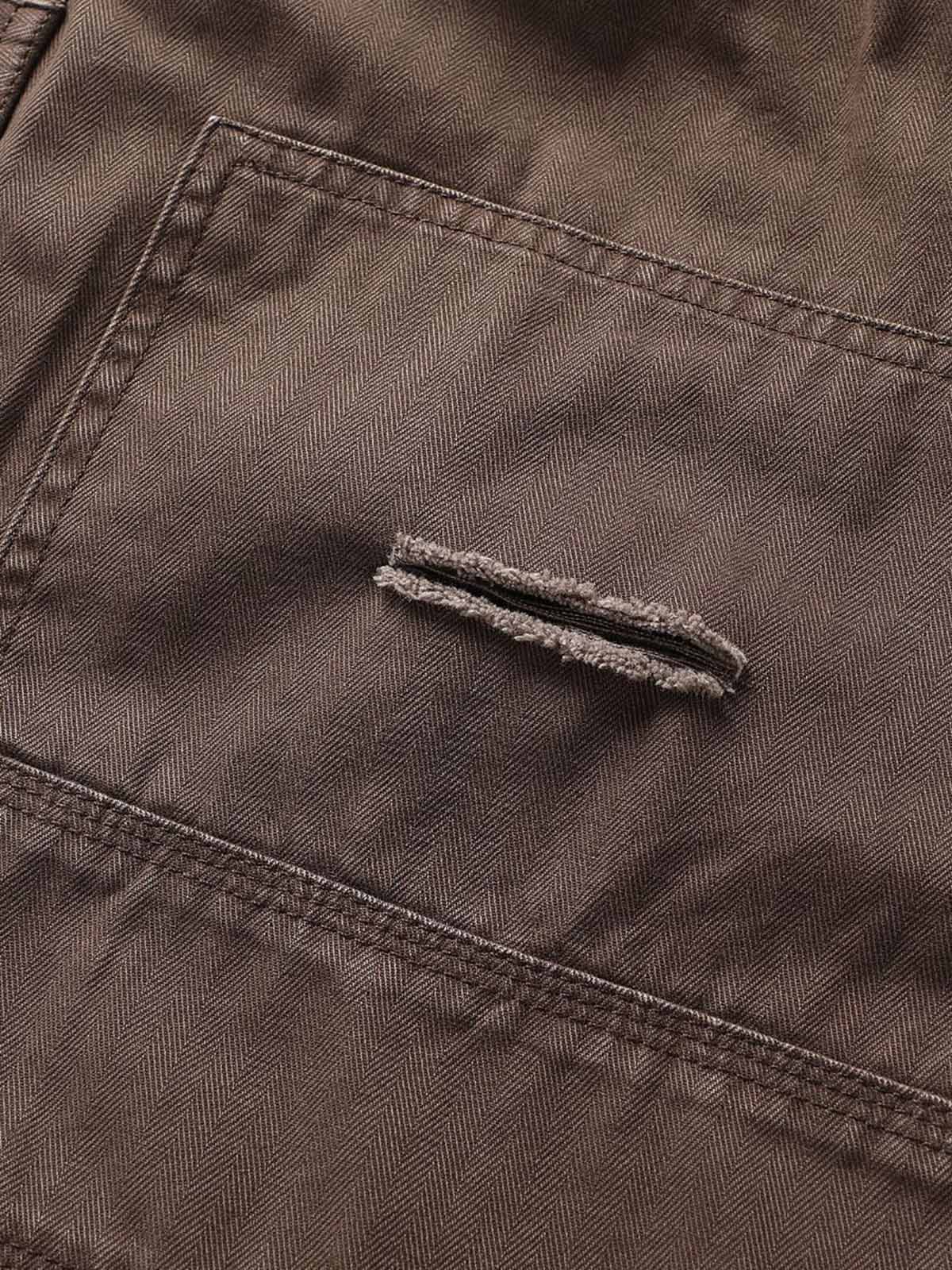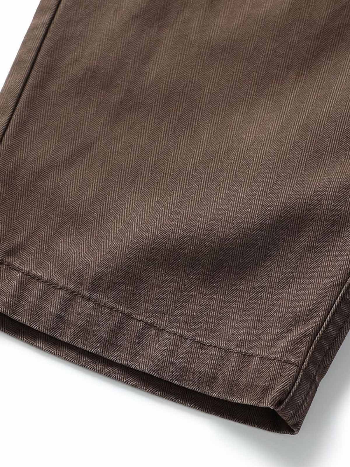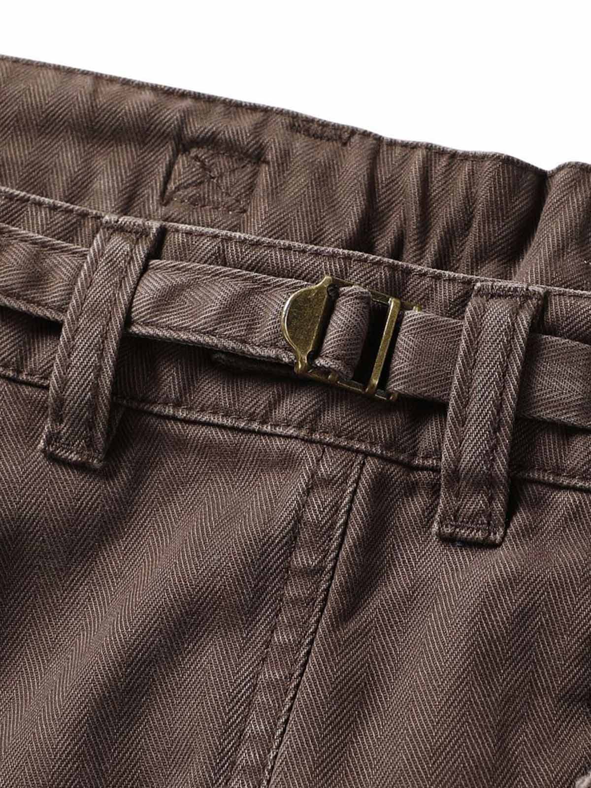 本パンツは20世紀初頭のアメリカの伐採作業員向けワークパンツに着想を得、実用性と耐摩耗性を重視したデザインとなっています。ウエストおよびレッグはルーズなカッティングで動きやすさを確保し、膝部とヒップにはパッチワークや補強加工を施すことで耐久性とヴィンテージ感を強調。アウトドアやストリートシーンで、ワークジャケットやヴィンテージシャツと合わせて着用することで、硬派でありながら自由なスタイルを楽しむことができます。