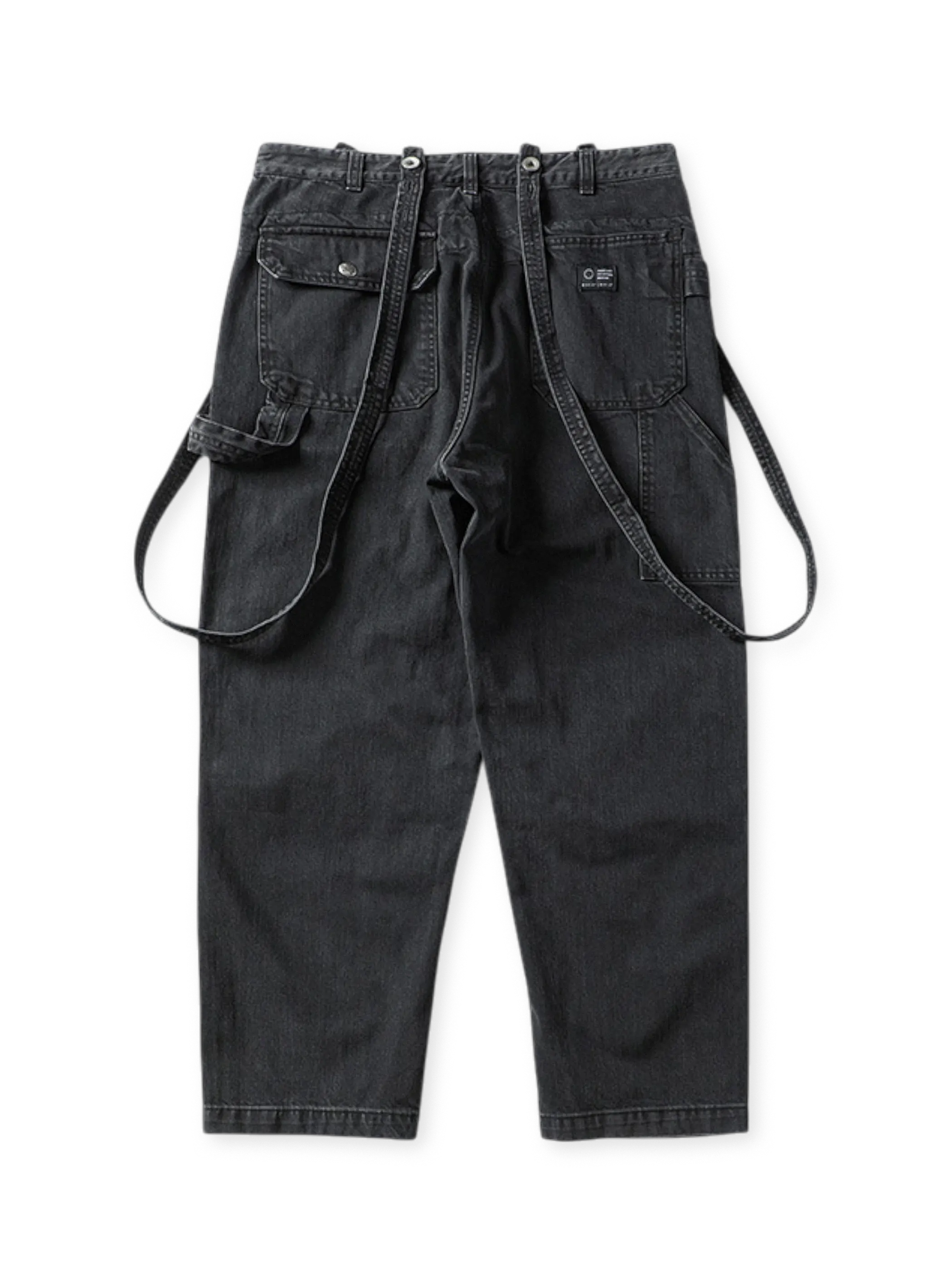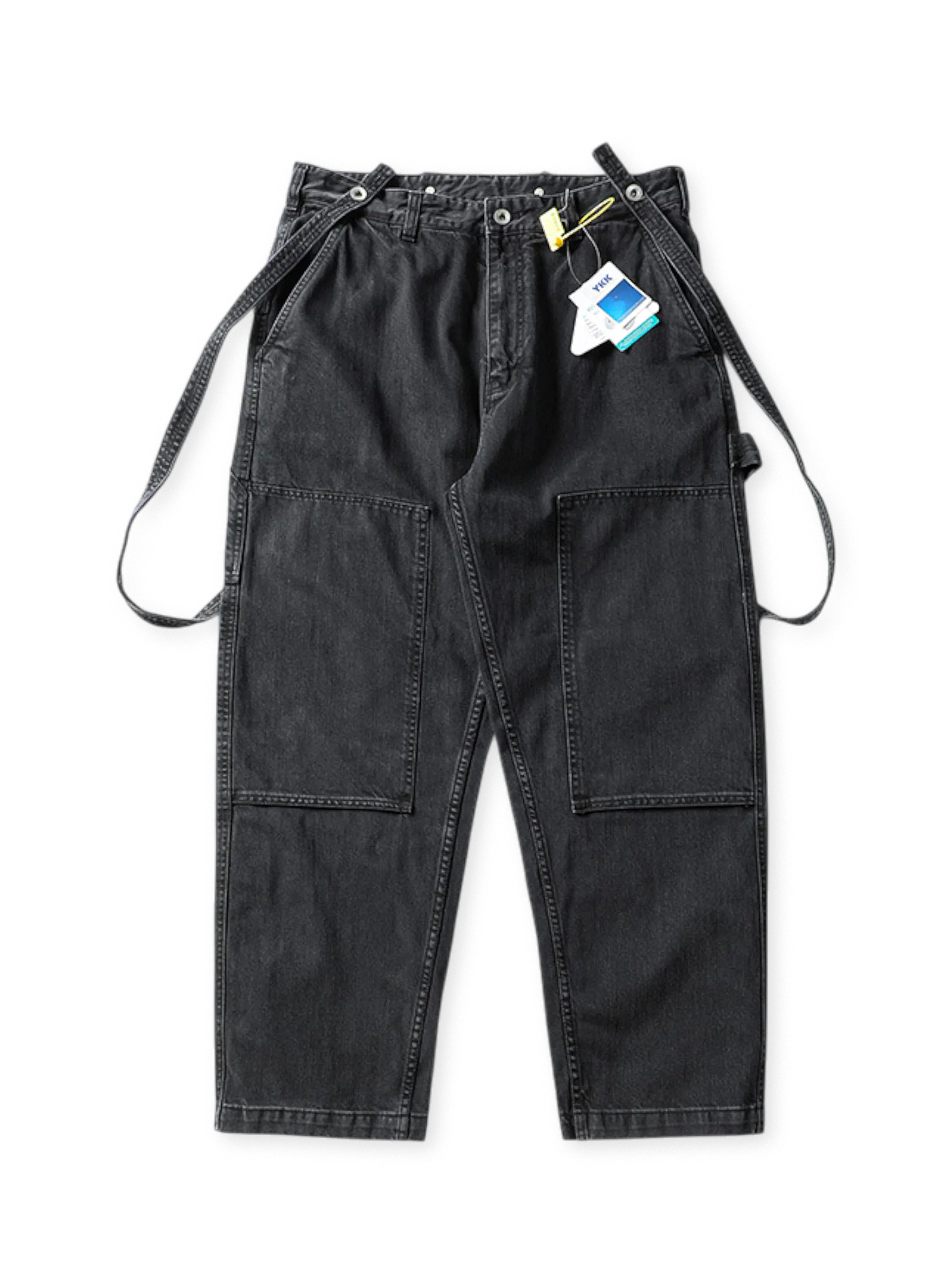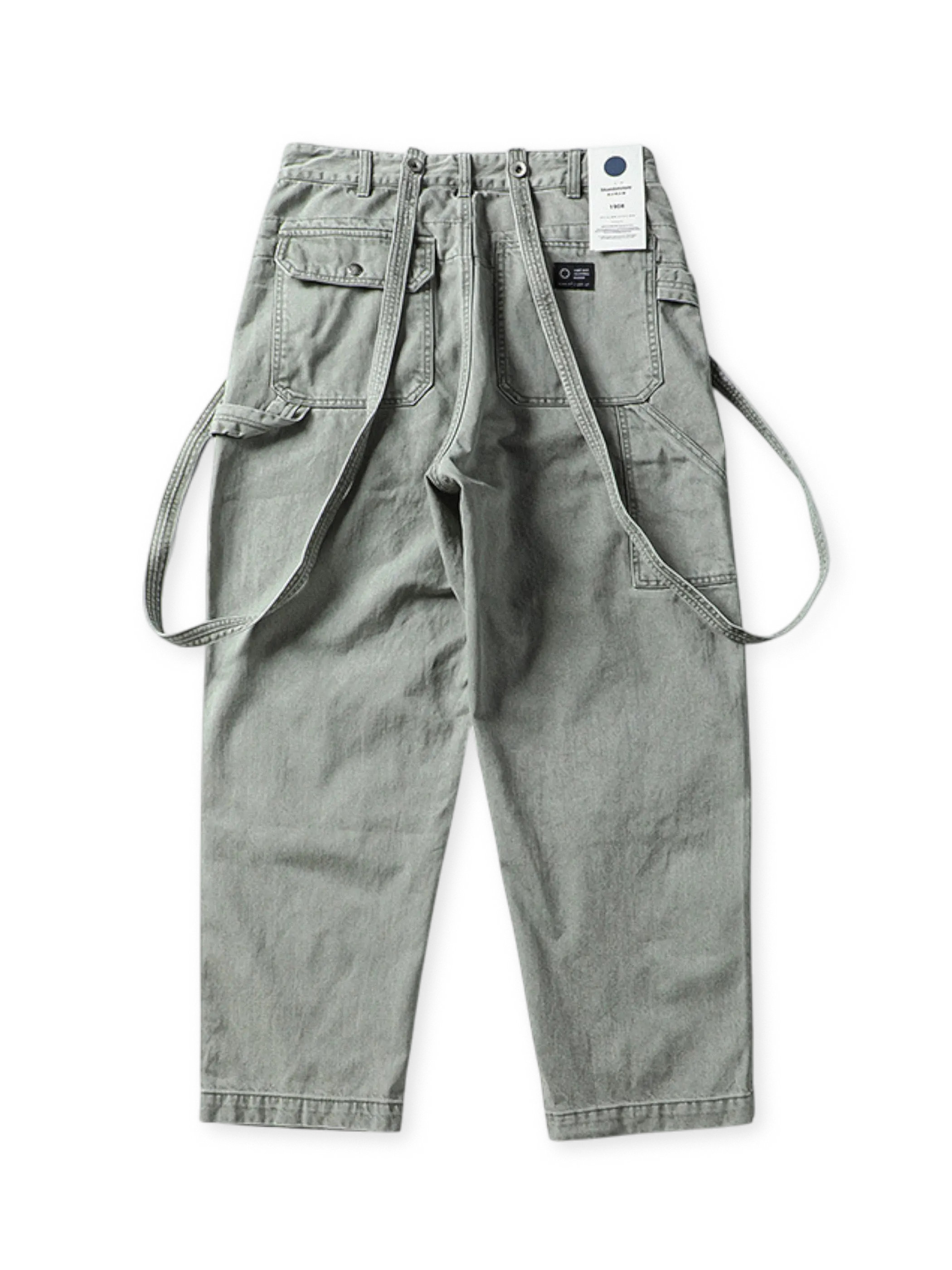 アメリカンなカーキテイストと日本ヴィンテージ感を融合した、サスペンダー付き&大きなパッチポケットを備えたルーズなストレートシルエットのワークパンツです。