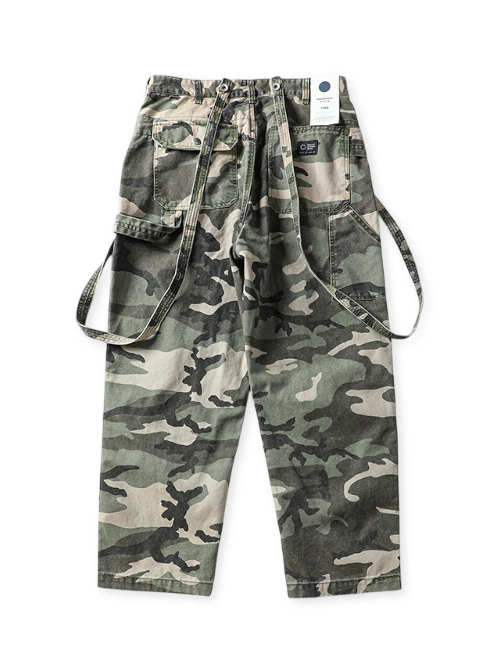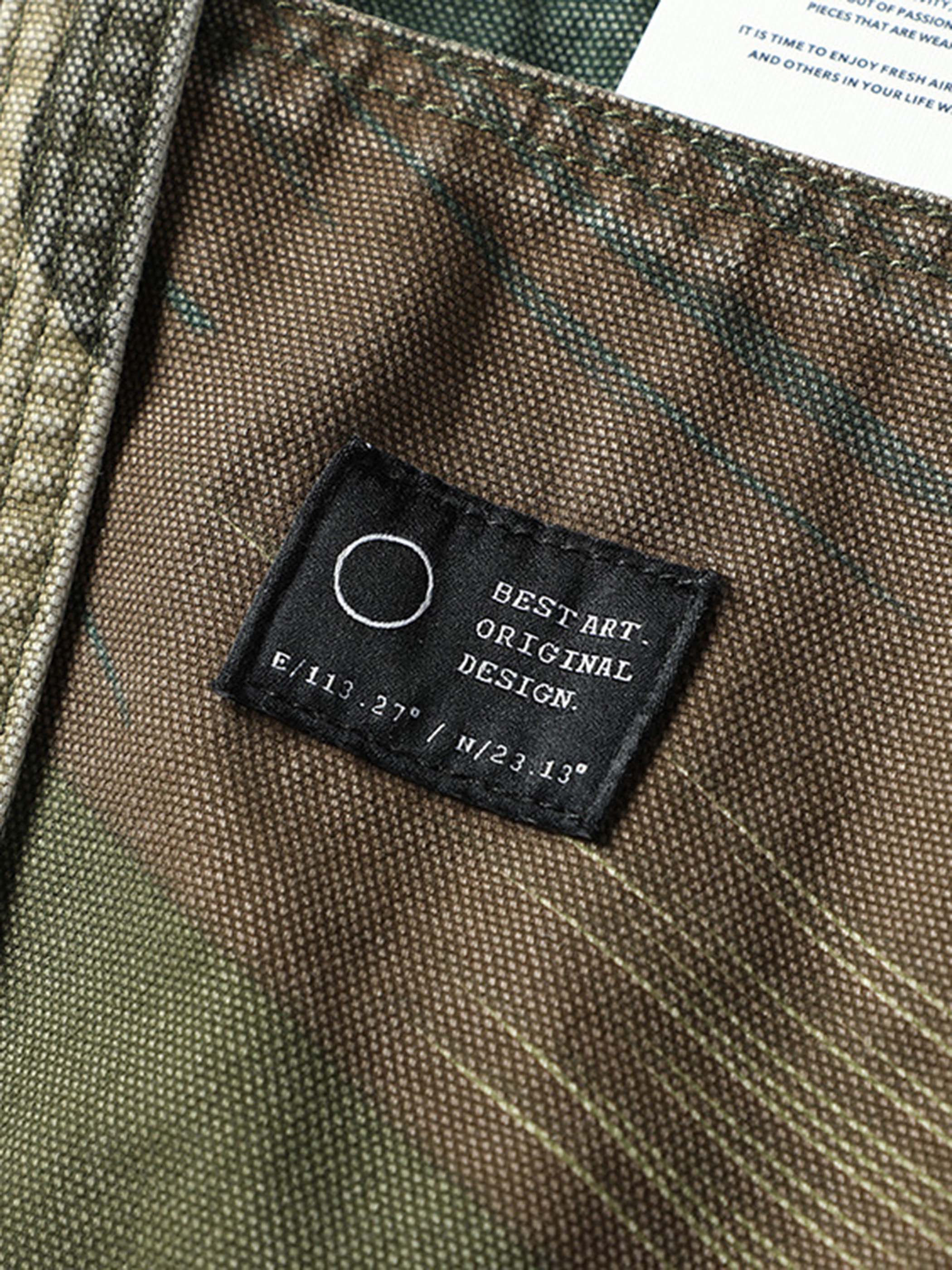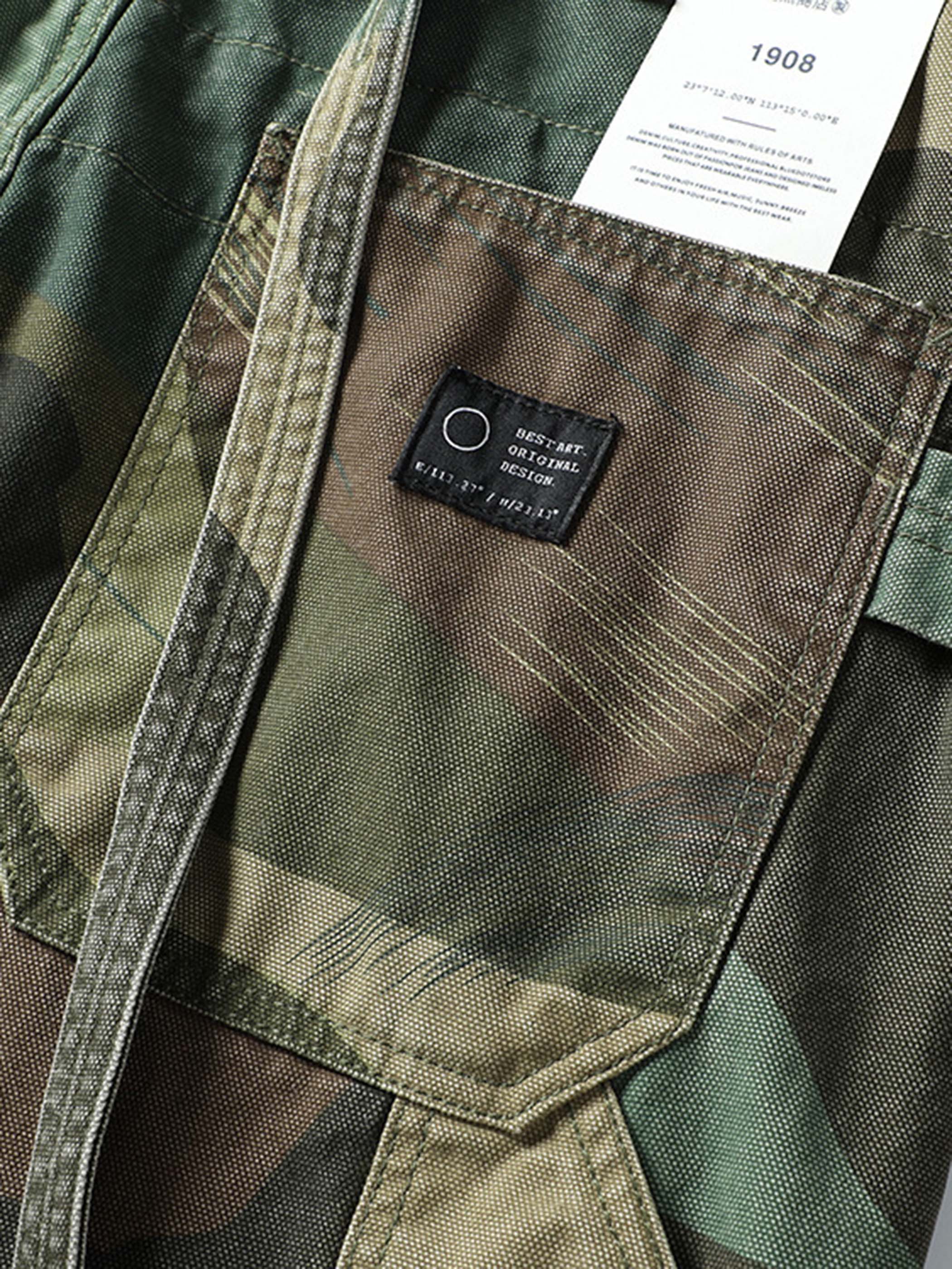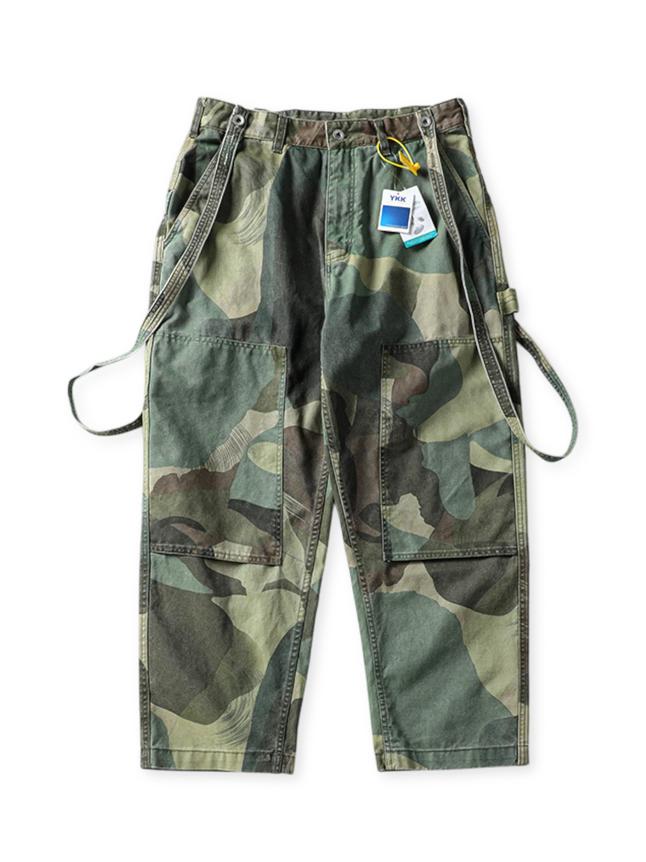 このワークパンツは、高密度で重量感のあるコットン素材を使用し、耐久性と快適な着心地を実現しています。背面とフロントをつなぐサスペンダーデザインが目を引き、アメカジ風のカーキテイストと日系ヴィンテージの雰囲気が同時に楽しめるデザインです。ルーズなストレートシルエットが脚まわりをしっかりカバーしつつ、動きやすさを確保。大きなパッチポケットや複数のポケット配置により、スマートフォンや財布などの日常必需品をまとめて収納可能です。カラーはブラック、ヴィンテージグリーン、ライトカモ、ダークカモの4色展開で、色ごとに異なる雰囲気を楽しむことができ、アウトドアからストリートまで幅広いシーンに対応する一着です。