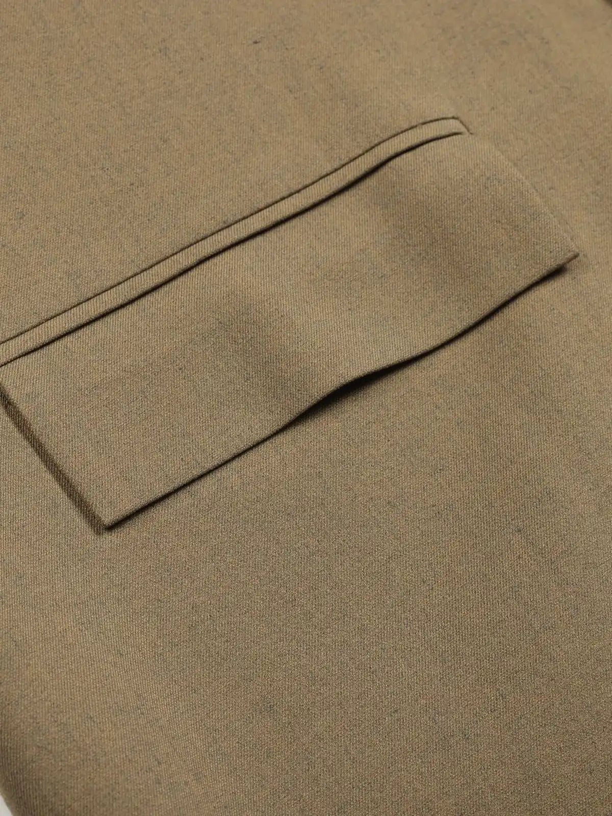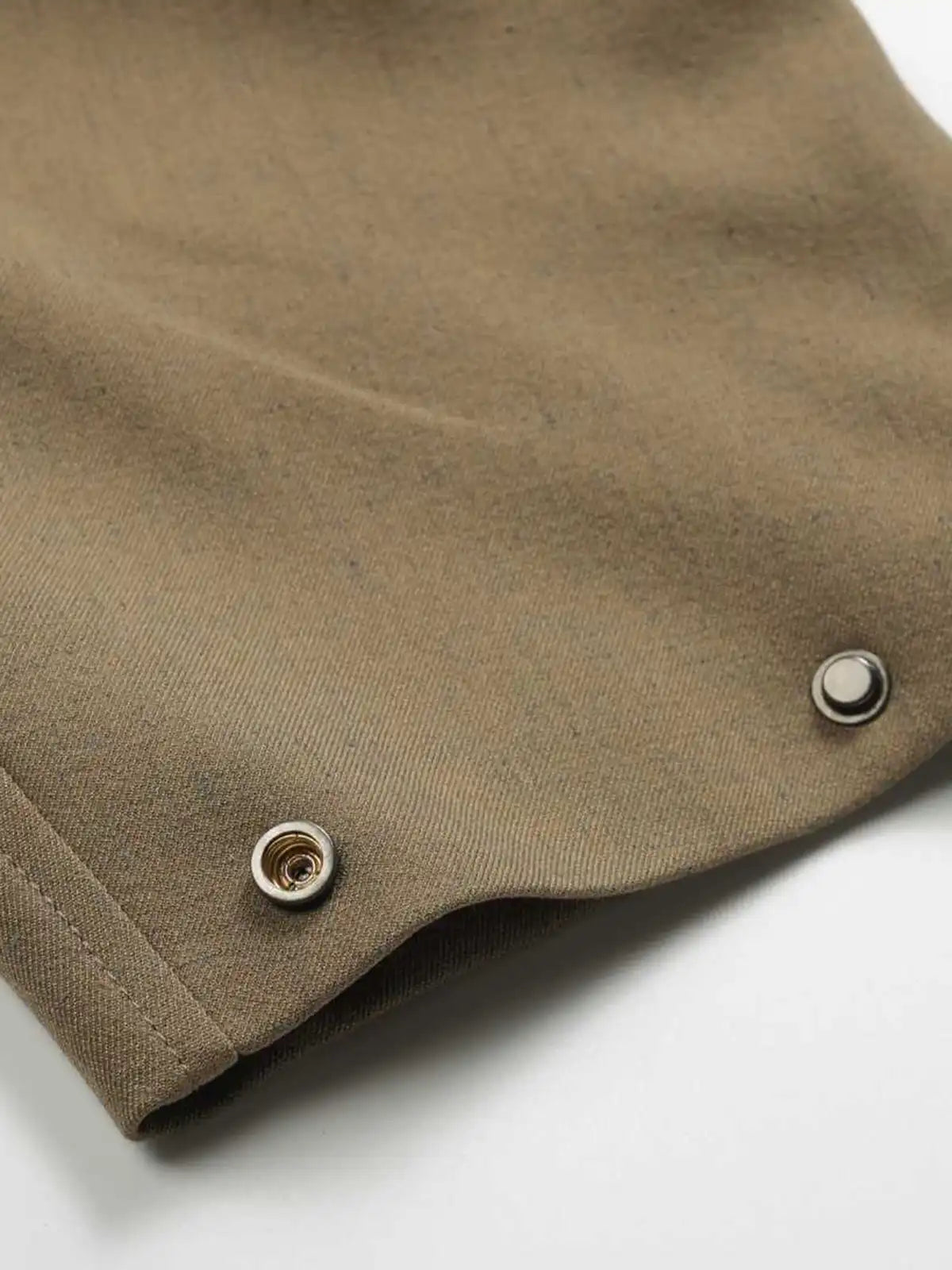 海軍のダブルブレストコート由来のクラシックな佇まいを、ポリエステルの軽快さと現代的なゆったりシルエットで再解釈したショートジャケットです。