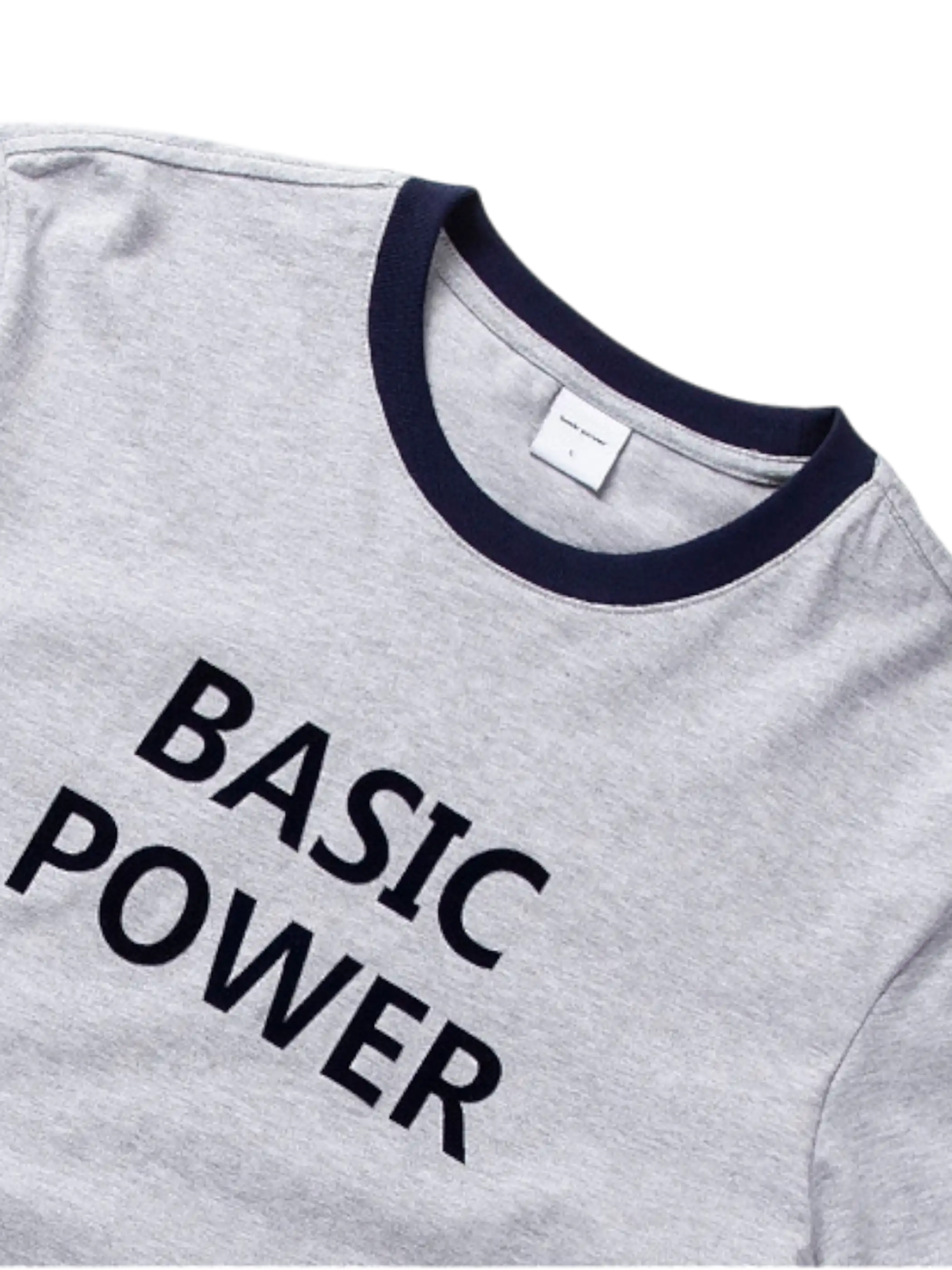 100%コットン生地を使用し、柔らかい肌触りと優れた通気性を実現。胸元の「BASIC POWER」プリントが程よい存在感を放ち、首元と袖口のカラー切り替えによって単調さを打ち破り、コーディネートに立体感と活気をもたらします。ベーシックながらもさりげないアクセントを求める方に最適で、カジュアルからスポーティーまで幅広いスタイルに合わせやすい一着です。