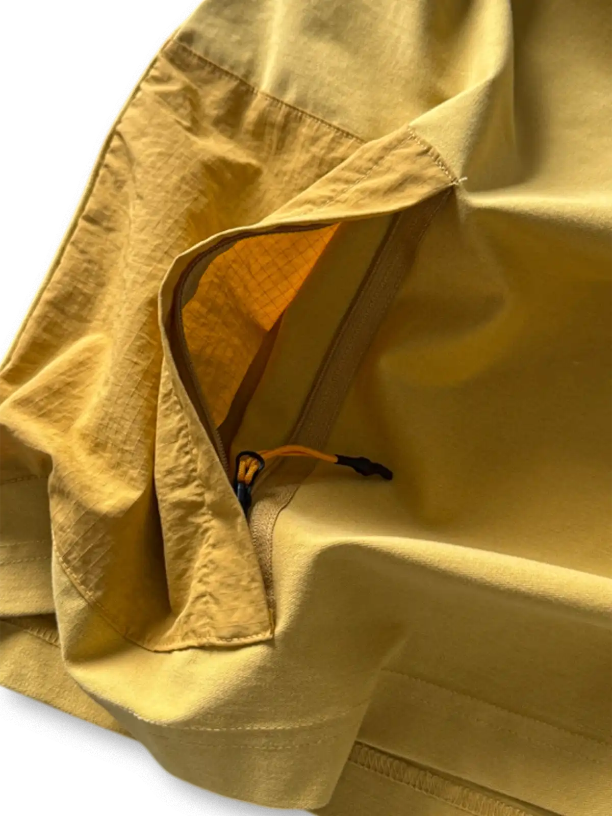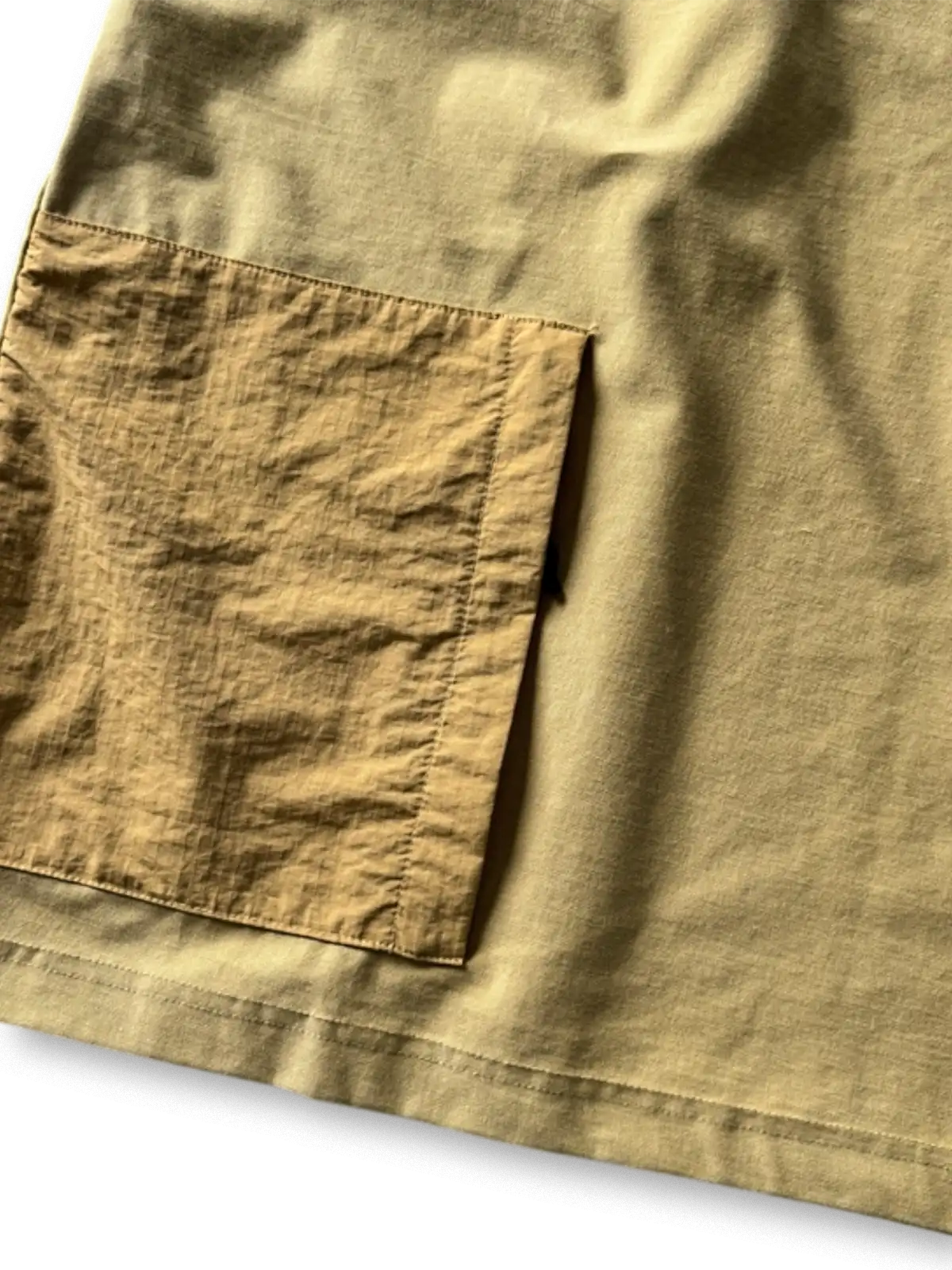 54%コットン×36%ポリエステル×10%スパンデックスの混紡生地を二度洗いし、程よい肉感と自然なクラック感を実現。両サイドの大きなナイロン混ポケットは小物収納に秀で、ワイドシルエットと落ち感ある肩線がリラックスした雰囲気を演出。バインダーネックとダブルステッチが耐久性を高め、日常のタウンユースから山系アウトドアまで心強い相棒となる一枚。