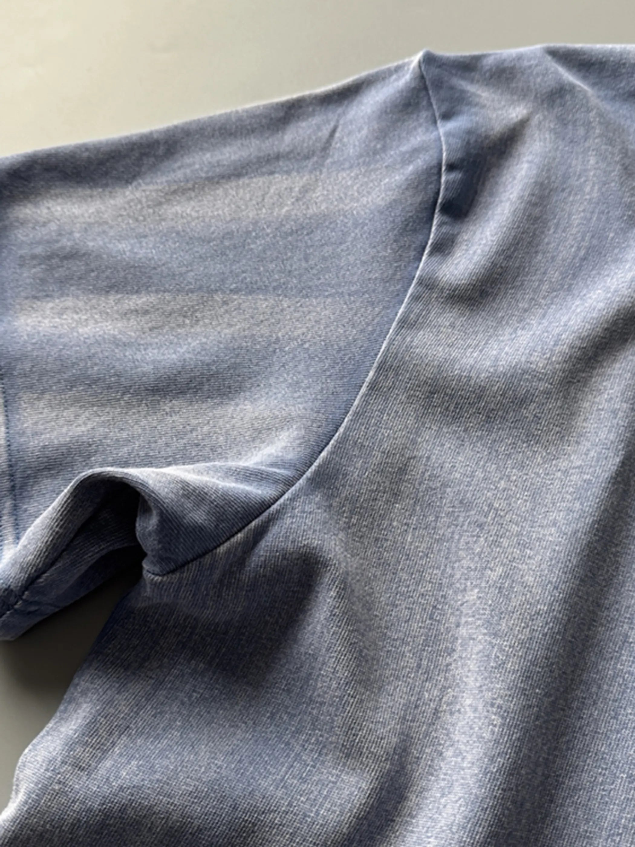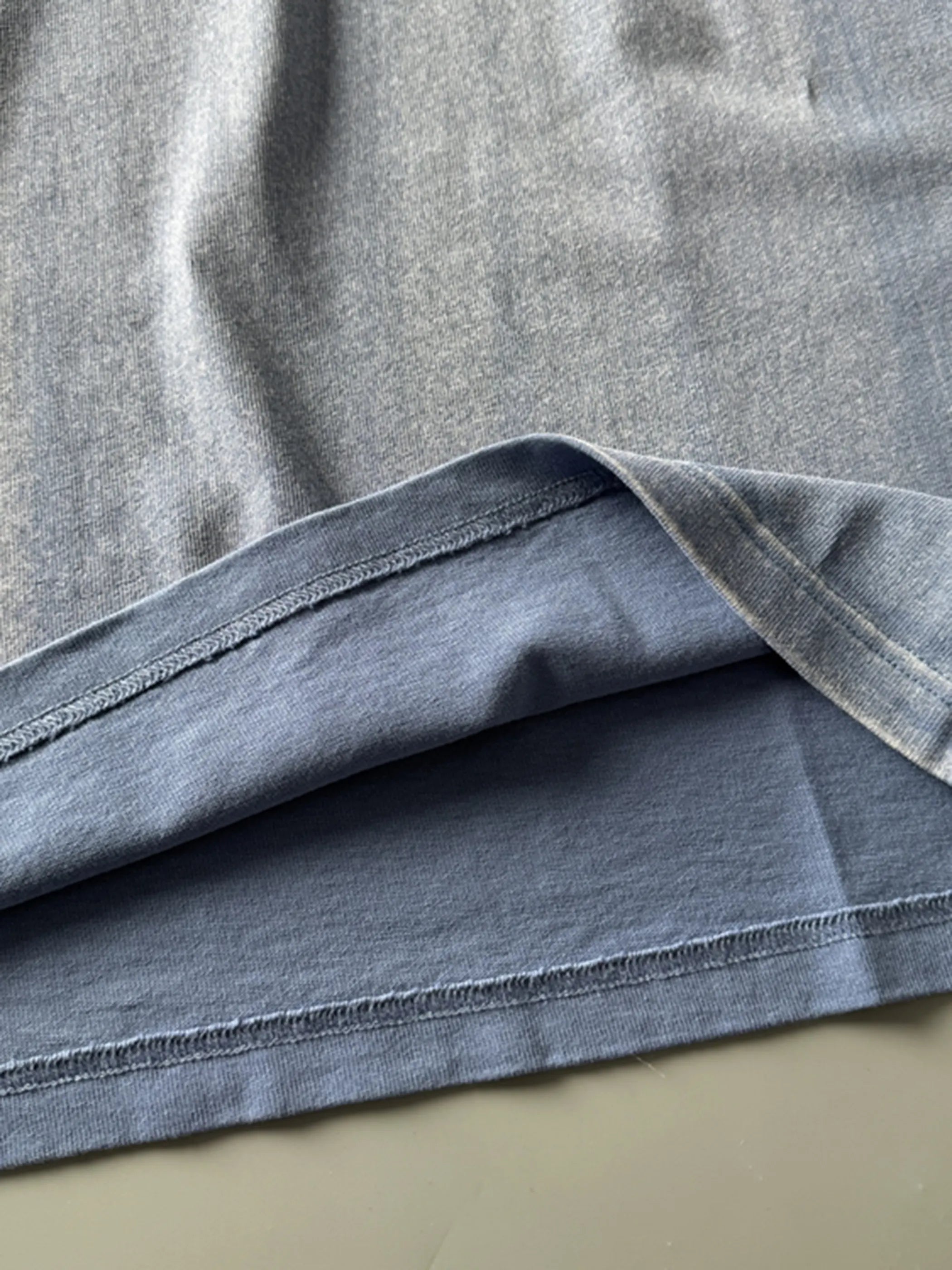 ガーメントダイ(製品染め)と刷色加工で独特の色合いを生み出し、胸元のパッチ刺繍がアクセントになっています。ルーズフィットのシルエットでリラックス感があり、ブラック、ライトパープル、デニムブルーの3色展開。ストリートやミリタリーライクな着こなしにもマッチし、多彩なコーディネートを楽しめる一枚です。