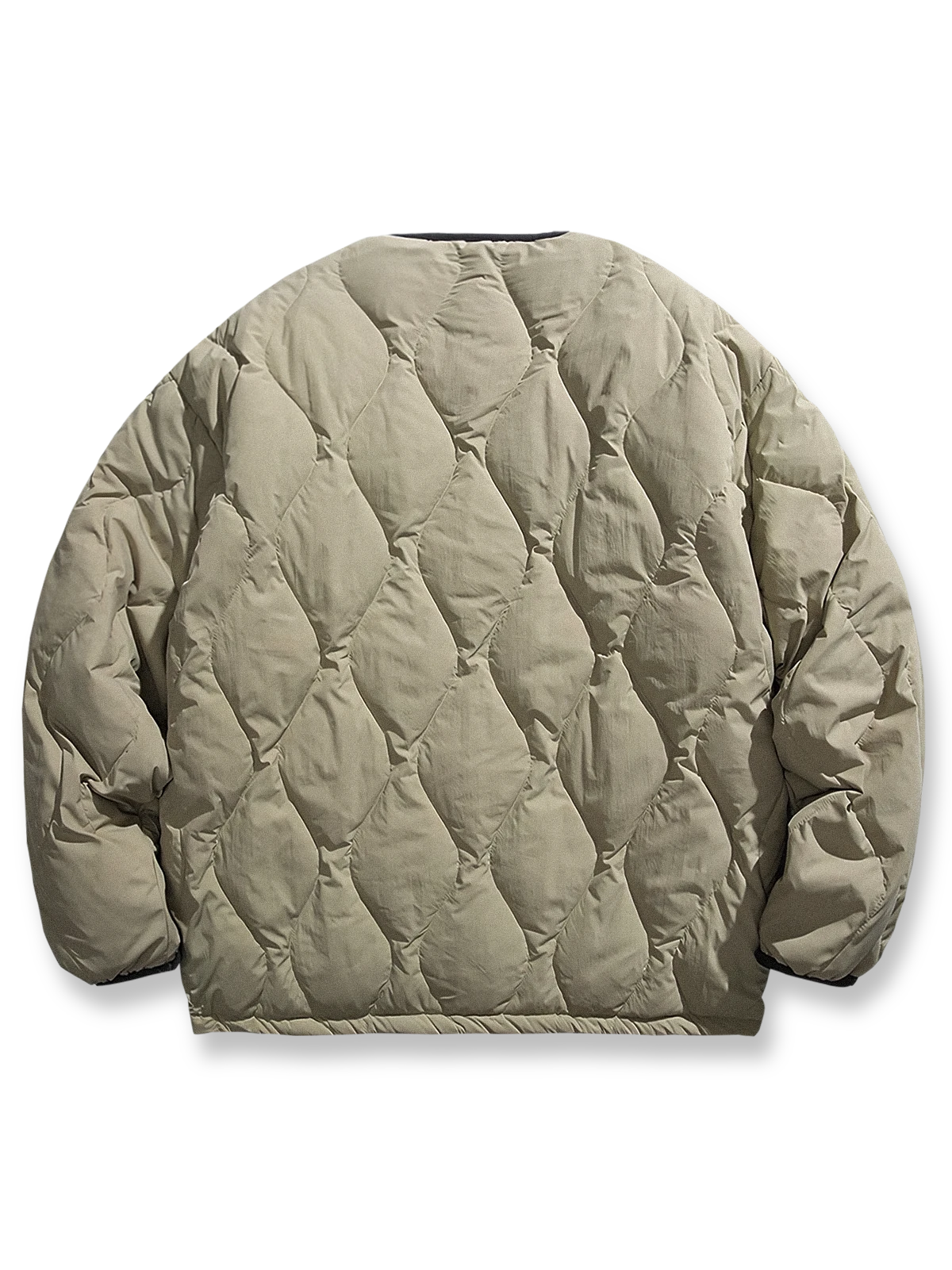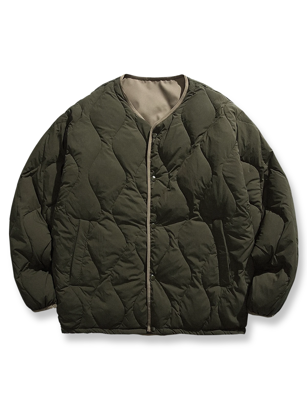 このリバーシブル仕様の波形キルティング Vネック ダウンは、独特の波形キルティング加工が施され、視覚的な奥行きとヴィンテージ感を演出します。キルティング加工により中綿が均一に分布し、移動を防ぐことで優れた保温性を保ちます。90%ホワイトダックダウンを使用し、軽量でありながら高い保温性を実現しました。リバーシブルデザインのため、異なるスタイルを楽しむことができ、シーンや気分に合わせた着こなしが可能です。Vネックのゆったりとしたシルエットは、レイヤードスタイルにも最適で、厚手のセーターやインナーとも相性抜群です。両サイドに設けられた大きなポケットは、実用性とデザイン性を兼ね備え、日常使いやアウトドアシーンで活躍します。カラーはカーキ、ブラック、アーミーグリーンの3色展開で、クラシックなミリタリースタイルに現代的なシルエットと機能を取り入れ、秋冬の定番としておすすめの一着です。通勤や旅行、カジュアルシーンまで幅広く対応し、寒い冬を暖かくスタイリッシュに過ごせます。