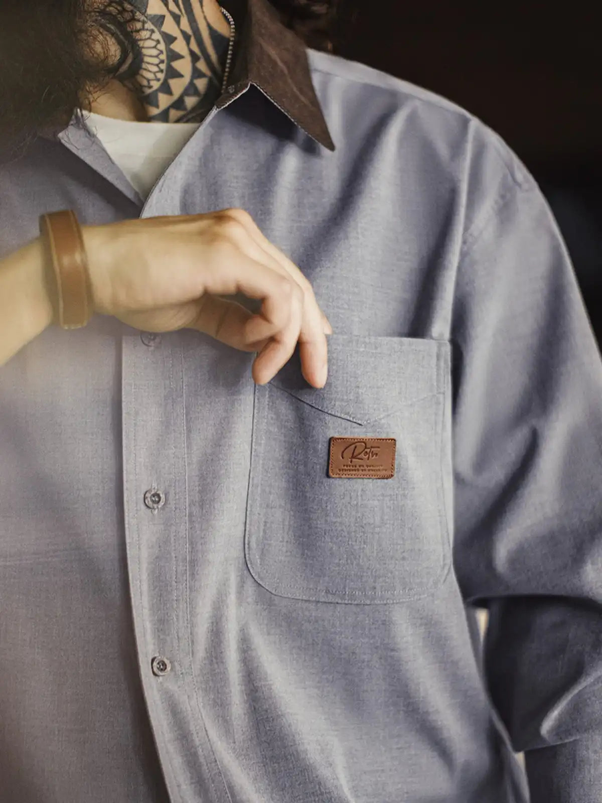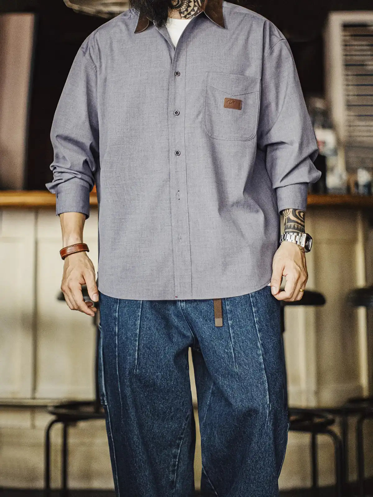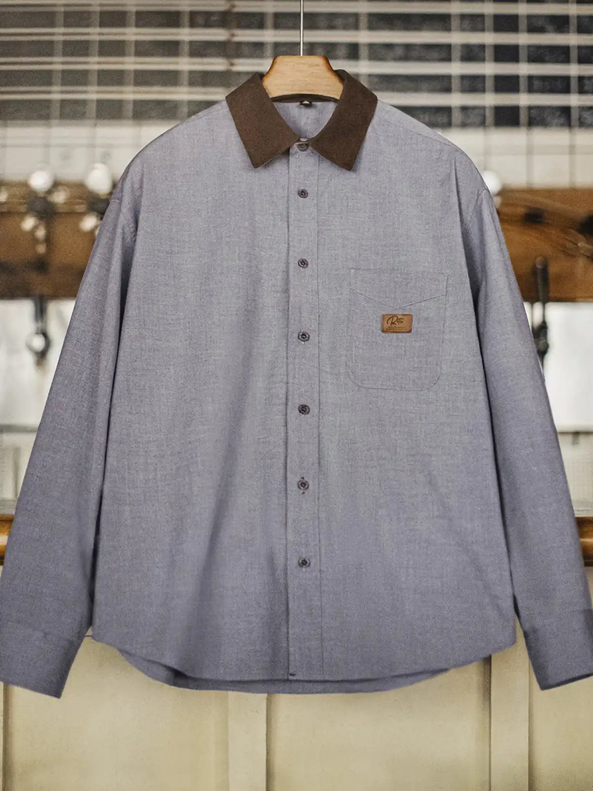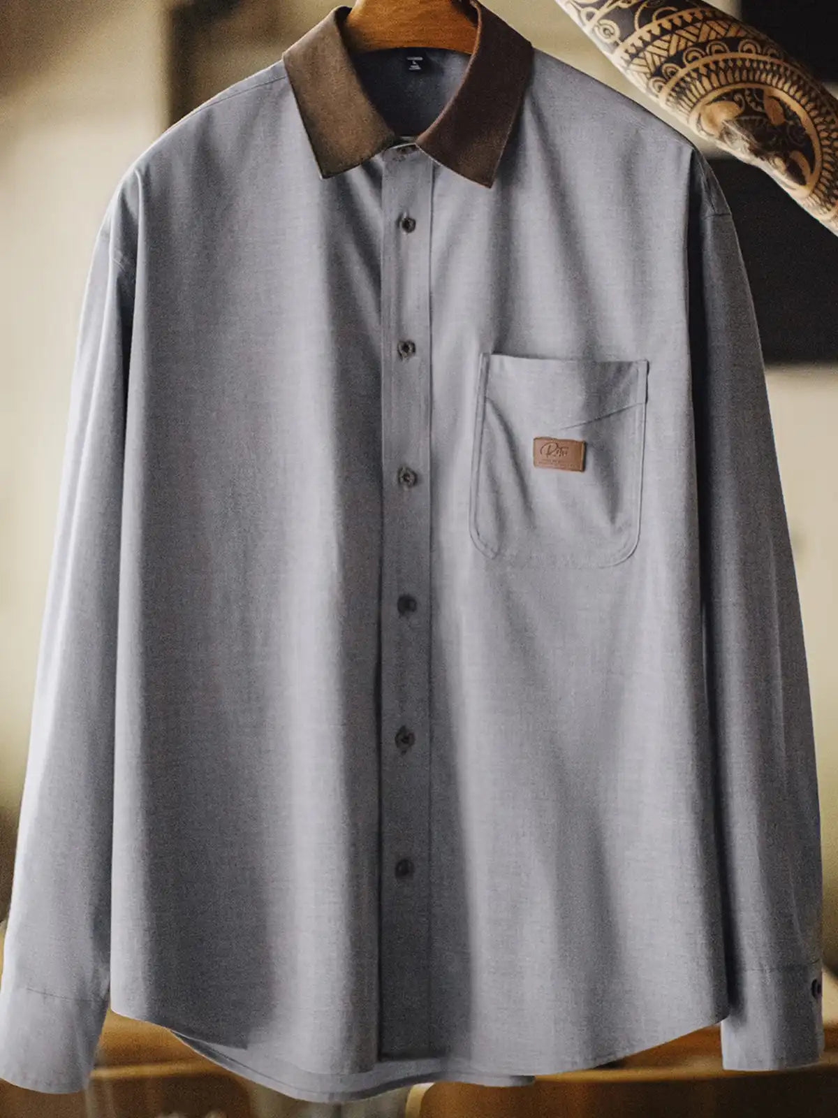 標準的なレギュラーカラーの定石に、ハンティング由来の“コーデュロイ襟”を借りてコントラストを作り、襟元だけで印象が締まる設計です。背面の襟ボタンで形を固定し、左胸のパッチポケットとルーズ寄りの裾バランスは60sのリラックスシャツ文脈でまとめ、前面はミニマルに整えています。主素材は原着糸に近い発想の杢調で、シワになりにくく日常で扱いやすい方向へ寄せ、岩石調の樹脂ボタンが素材感の奥行きを支えます。デニムでラフに崩しても、スラックスで静かに整えても襟の切替が効き、ジャケットほど構えずに“品”だけを足せます。