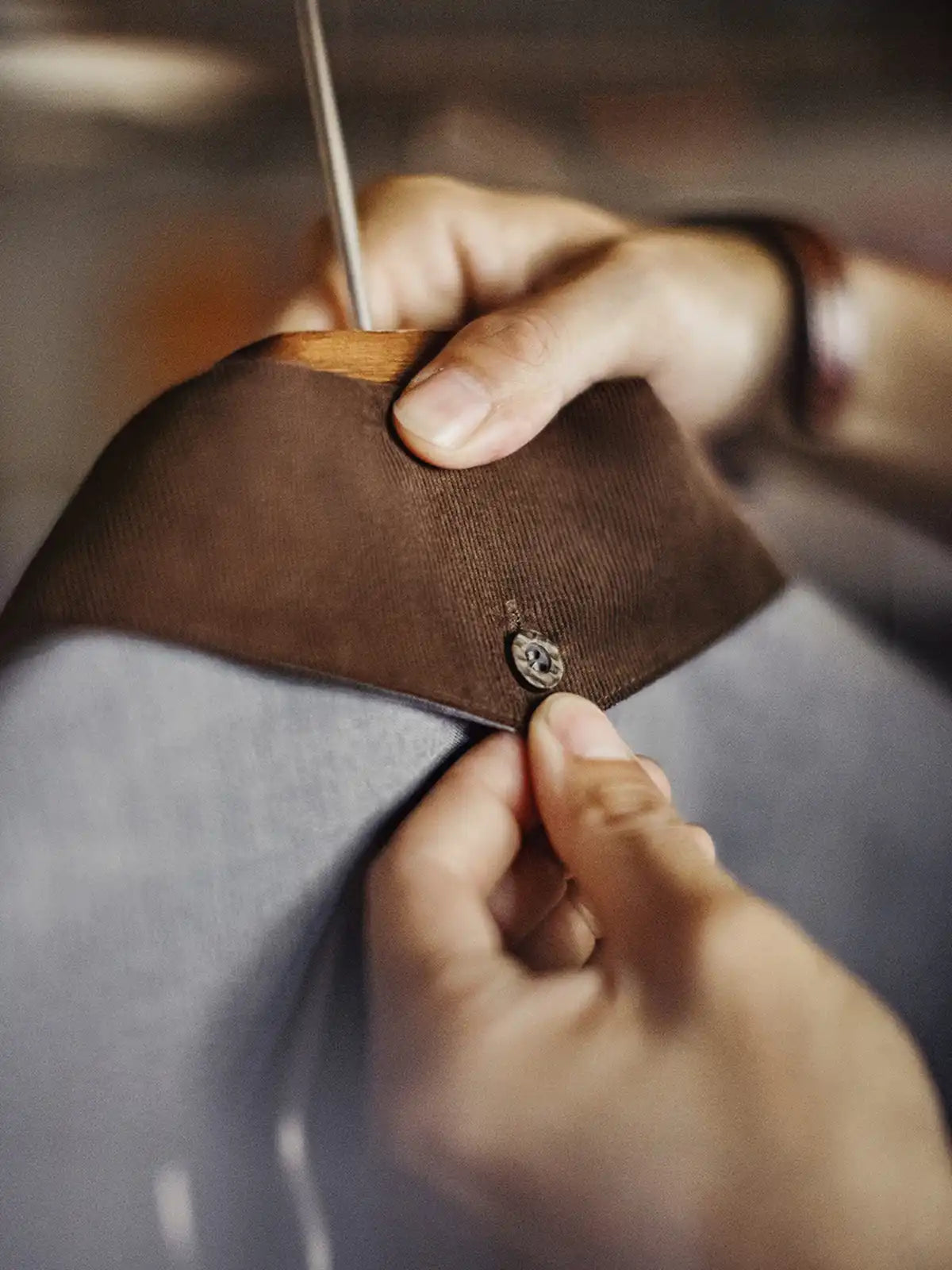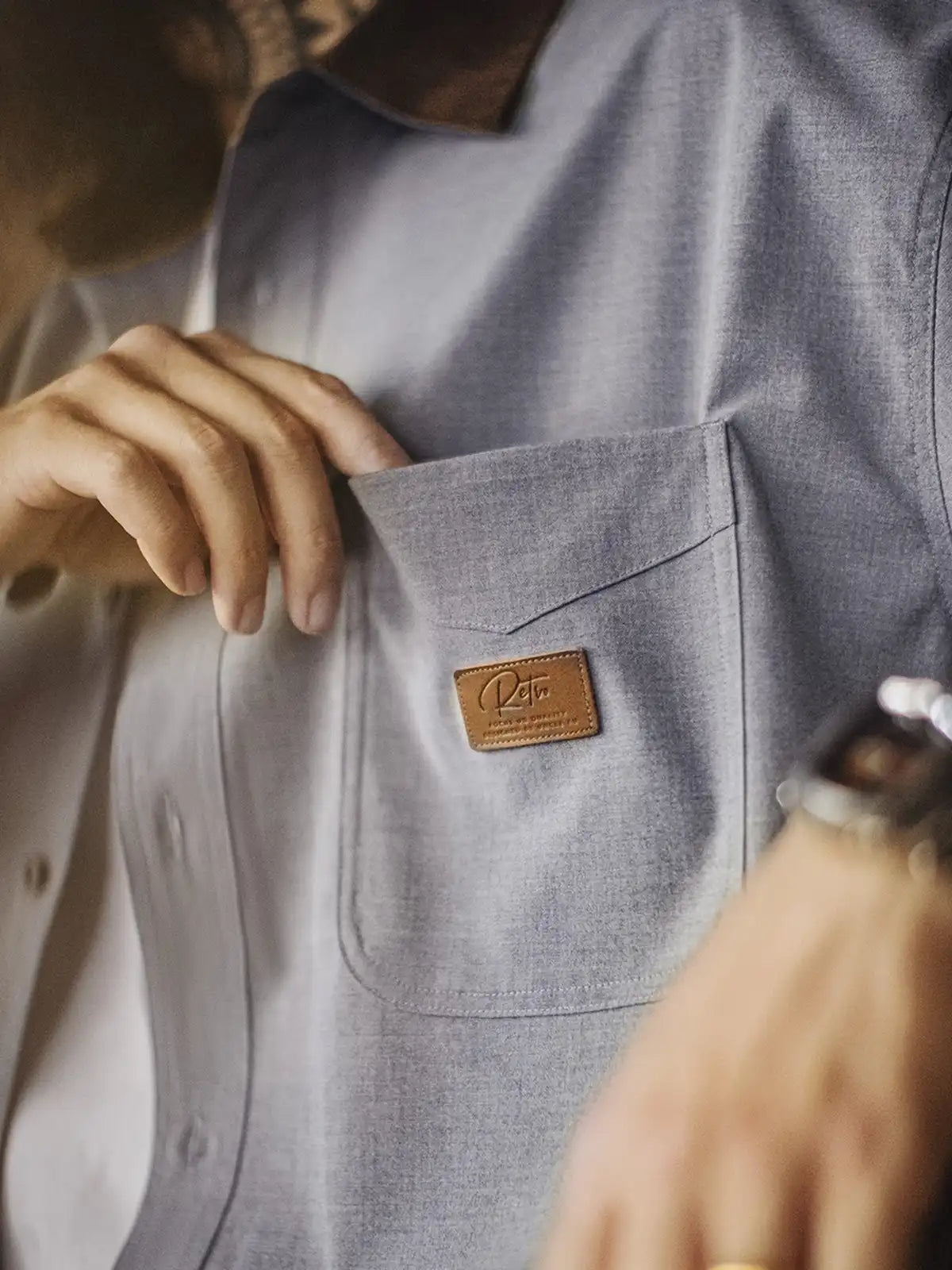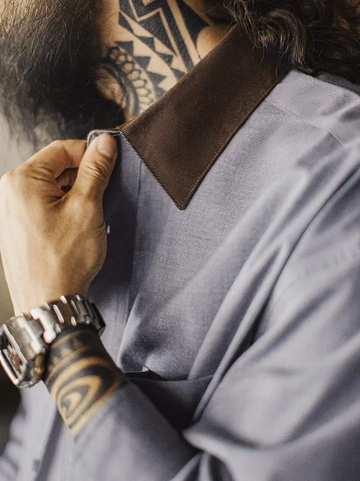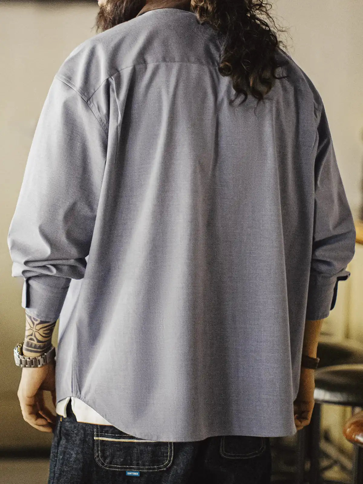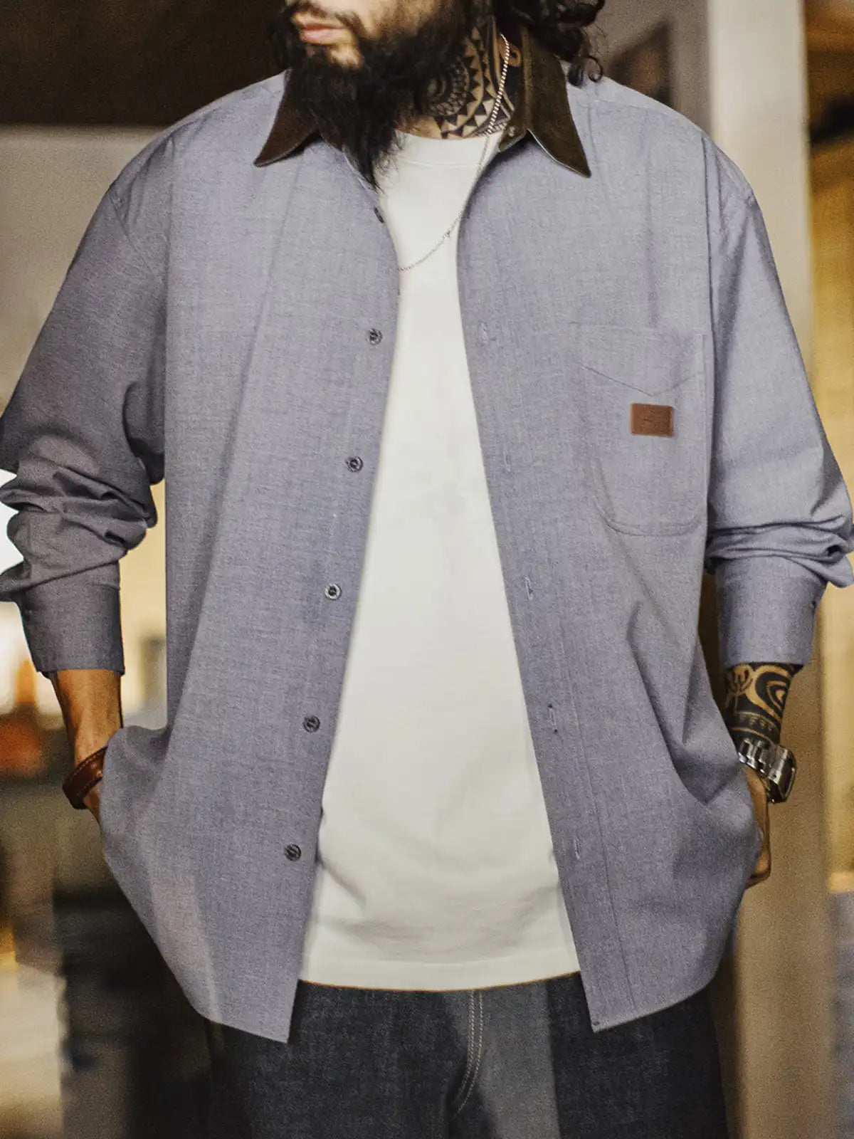 標準的なレギュラーカラーの定石に、ハンティング由来の“コーデュロイ襟”を借りてコントラストを作り、襟元だけで印象が締まる設計です。背面の襟ボタンで形を固定し、左胸のパッチポケットとルーズ寄りの裾バランスは60sのリラックスシャツ文脈でまとめ、前面はミニマルに整えています。主素材は原着糸に近い発想の杢調で、シワになりにくく日常で扱いやすい方向へ寄せ、岩石調の樹脂ボタンが素材感の奥行きを支えます。デニムでラフに崩しても、スラックスで静かに整えても襟の切替が効き、ジャケットほど構えずに“品”だけを足せます。