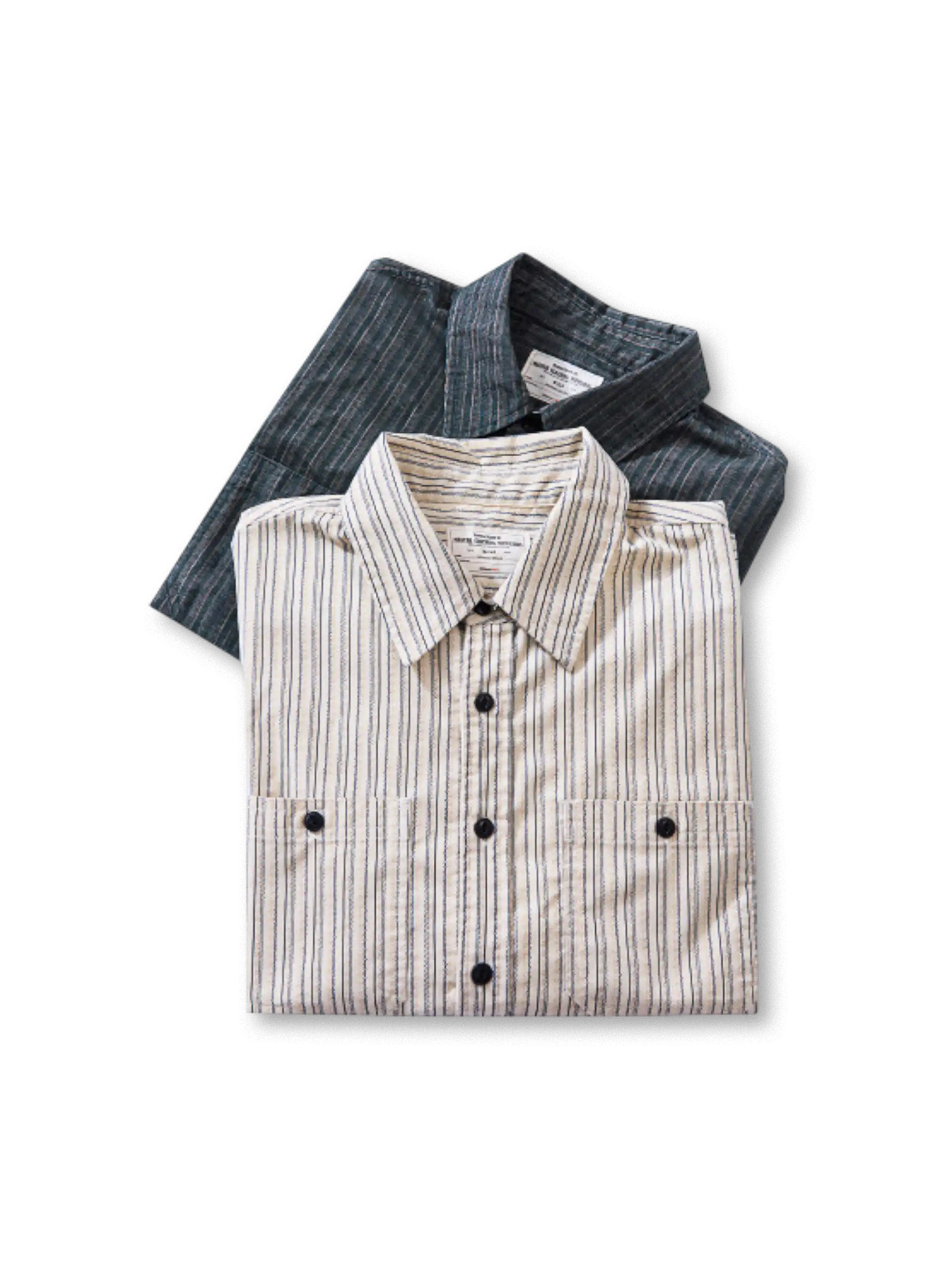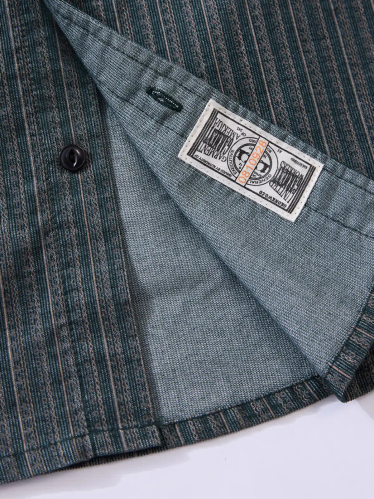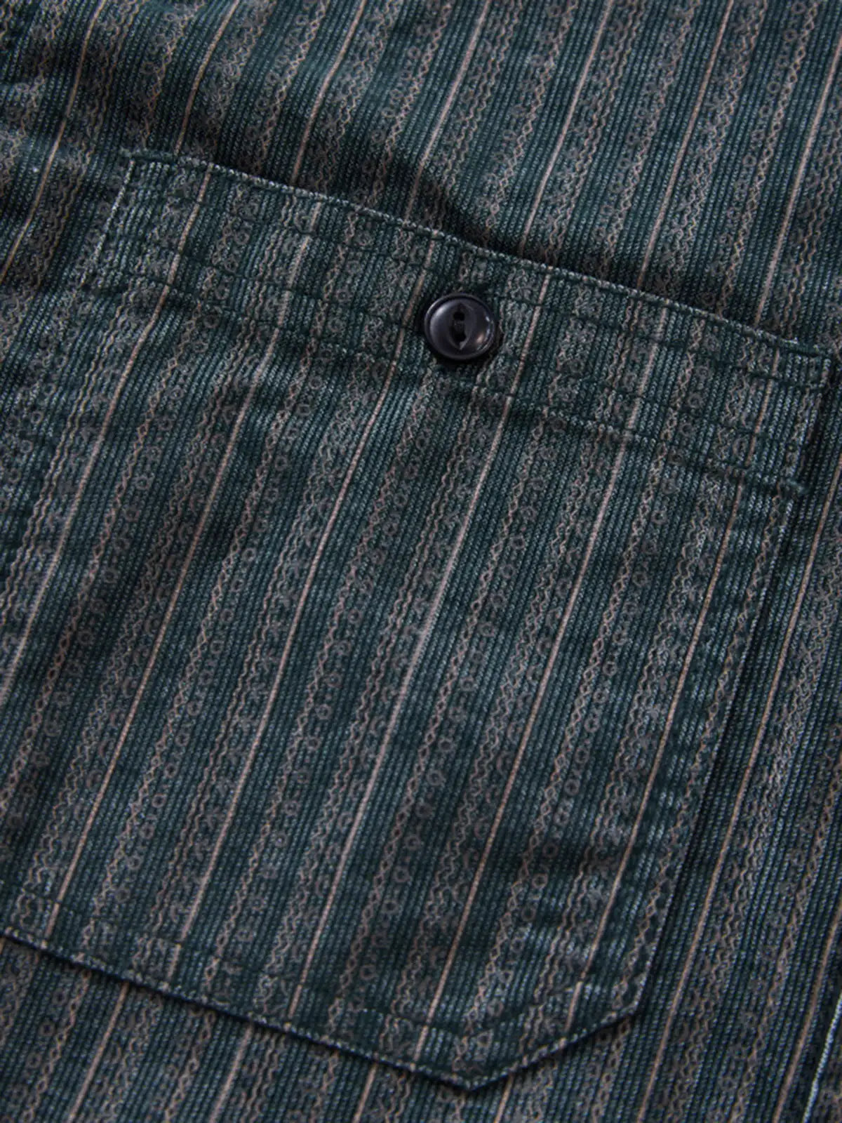懐かしさのあるストライプを、コーデュロイ風の畝(坑条)組織で表現し、90年代の空気を残しながらも軽薄に見えないトーンへ収めた設計です。生地は耐摩耗性を意識した混率で、日常の擦れに強い方向へ寄せ、胸のフラップポケットでワークの骨格を作りつつ、前立ての“魚眼ボタン”が近距離で効くアクセントになります。ストライプは縦の流れで面を整え、デニムに合わせれば直球のアメカジ、スラックスに合わせれば少し静かなハズしとして成立し、ジャケットの下でも柄がうるさくならない密度です。