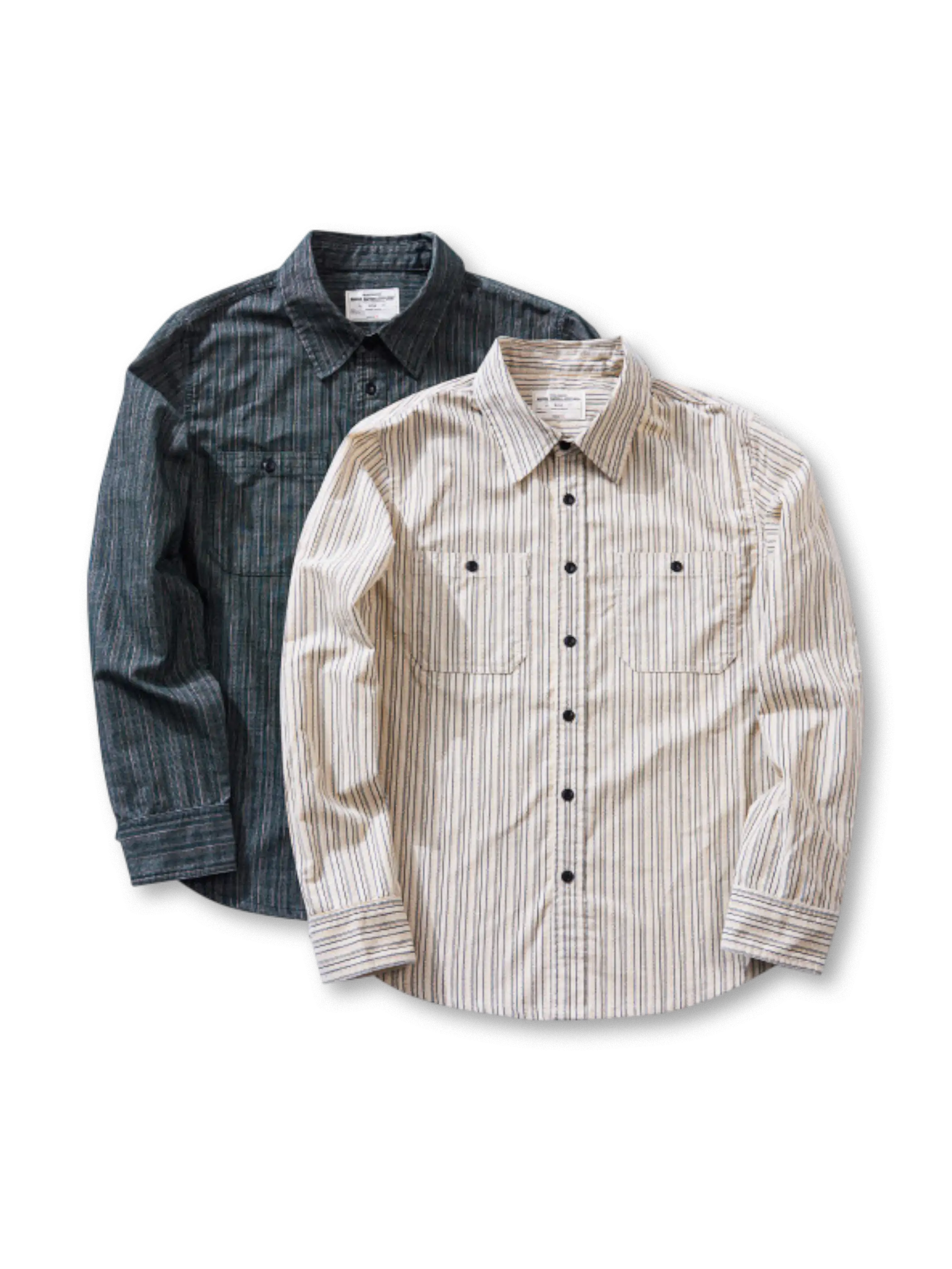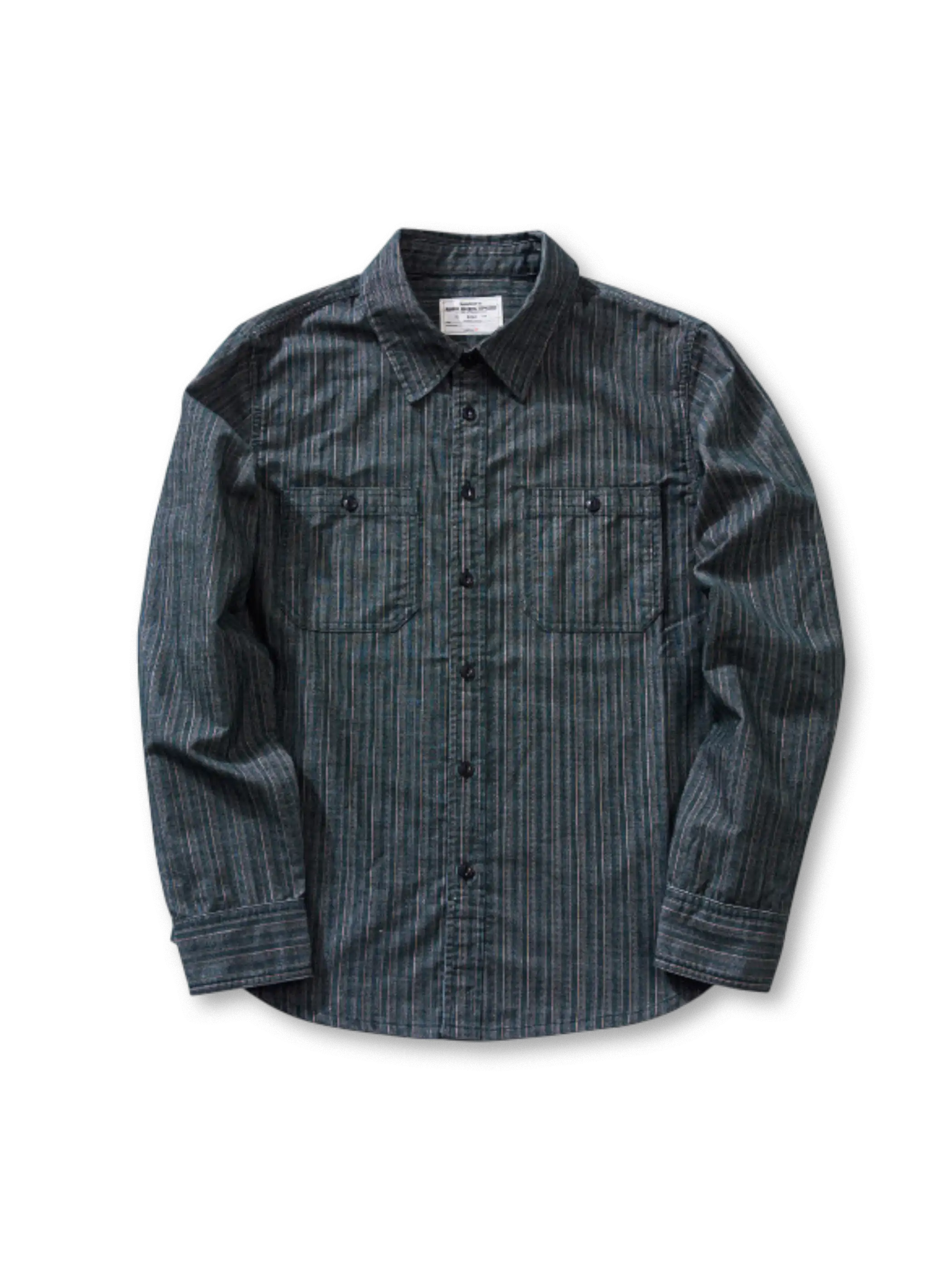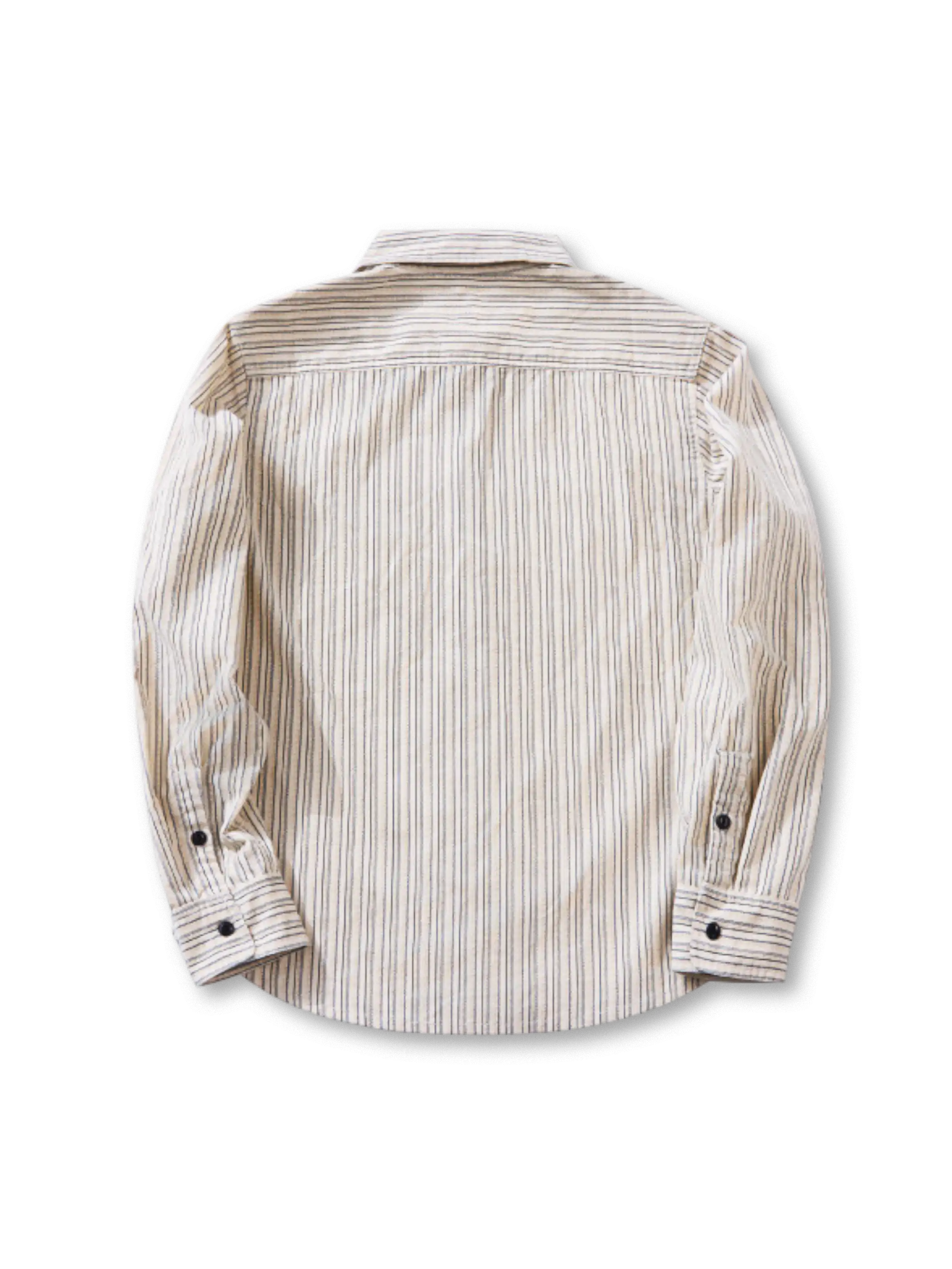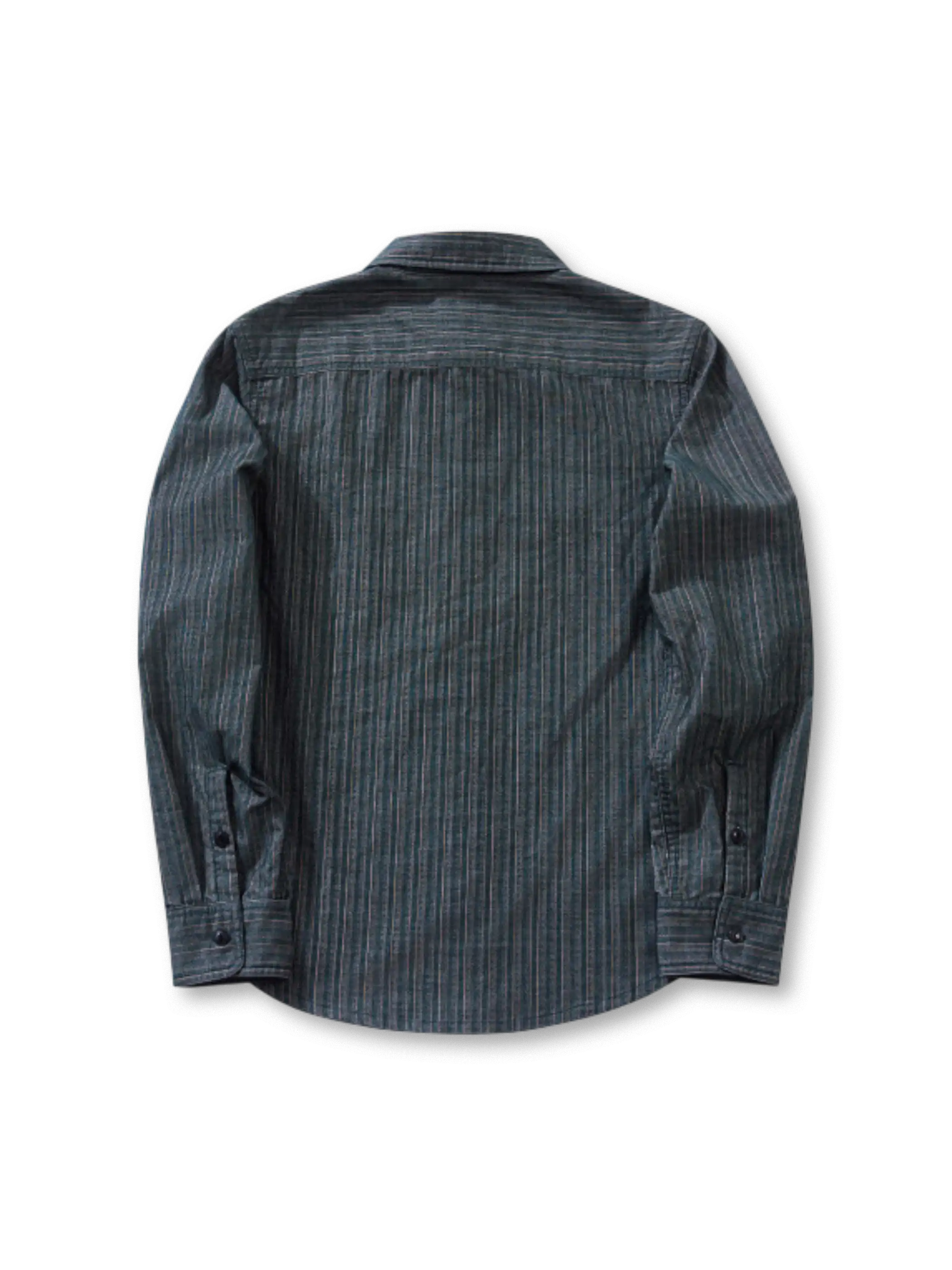 コーデュロイのような畝感ストライプと魚眼ボタンで、90年代の空気を“落ち着いたムード”に整えた長袖シャツです。