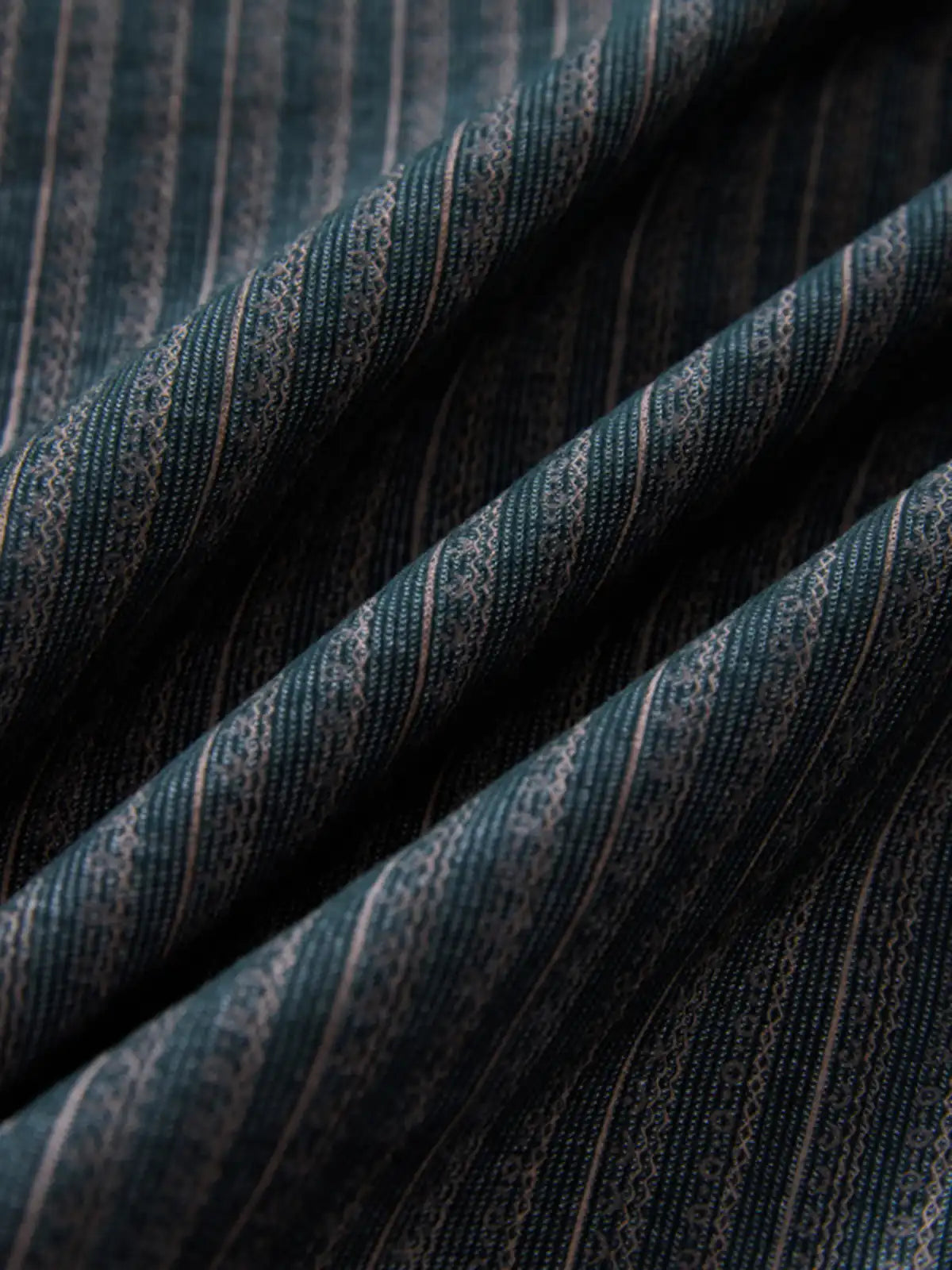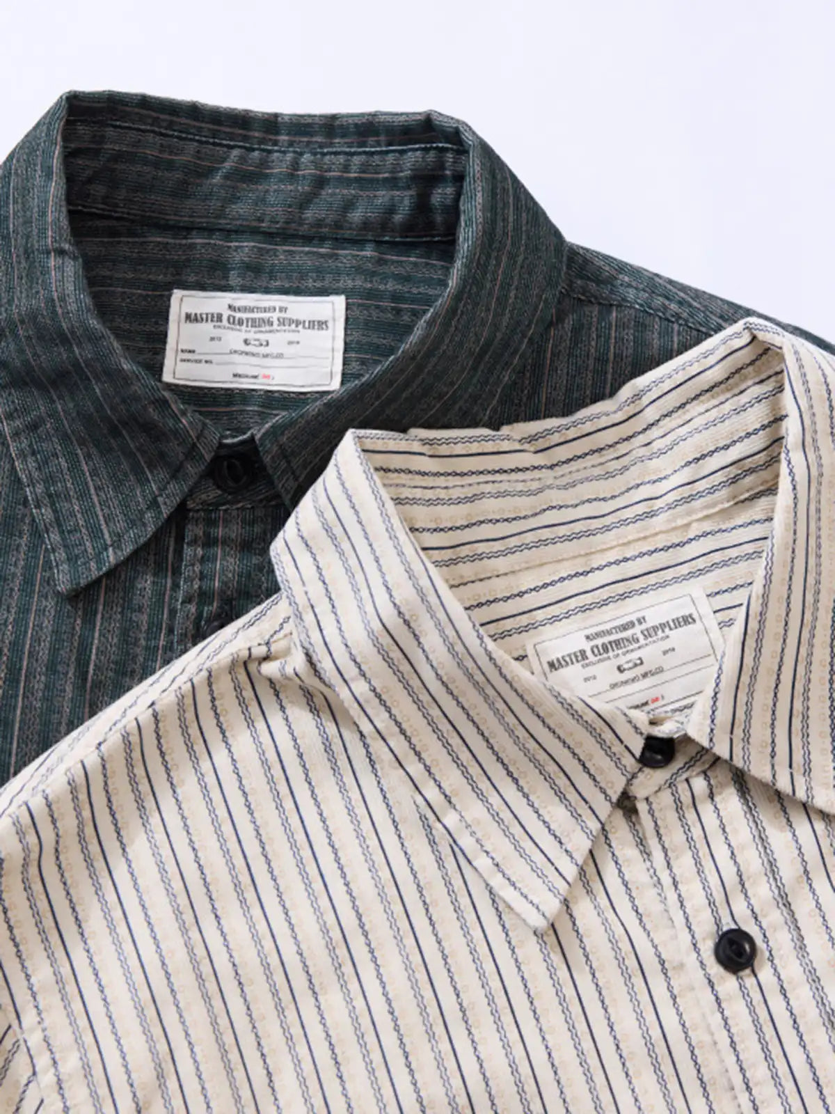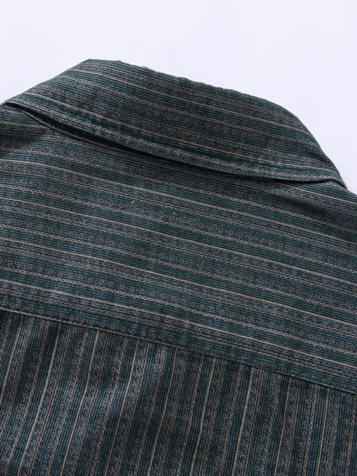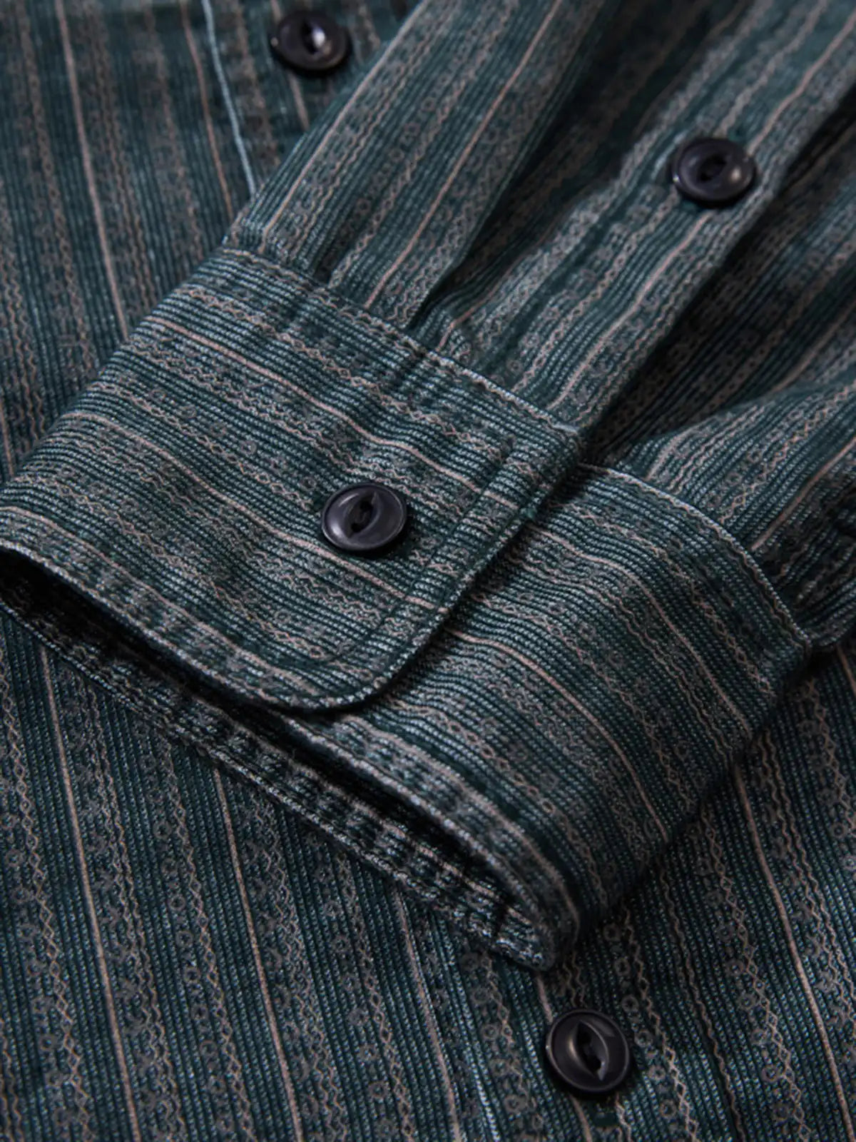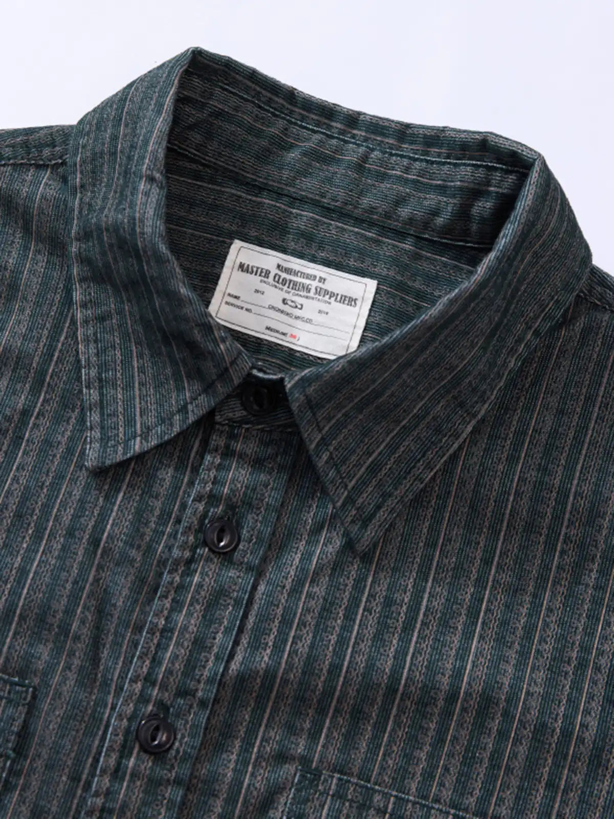 コーデュロイのような畝感ストライプと魚眼ボタンで、90年代の空気を“落ち着いたムード”に整えた長袖シャツです。