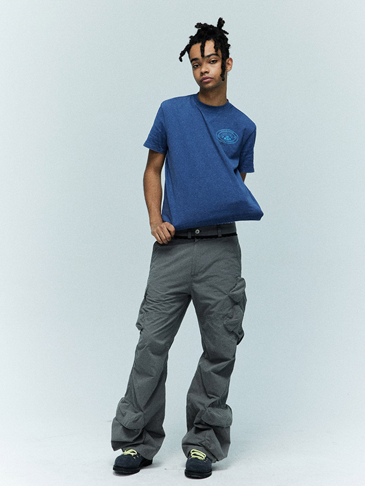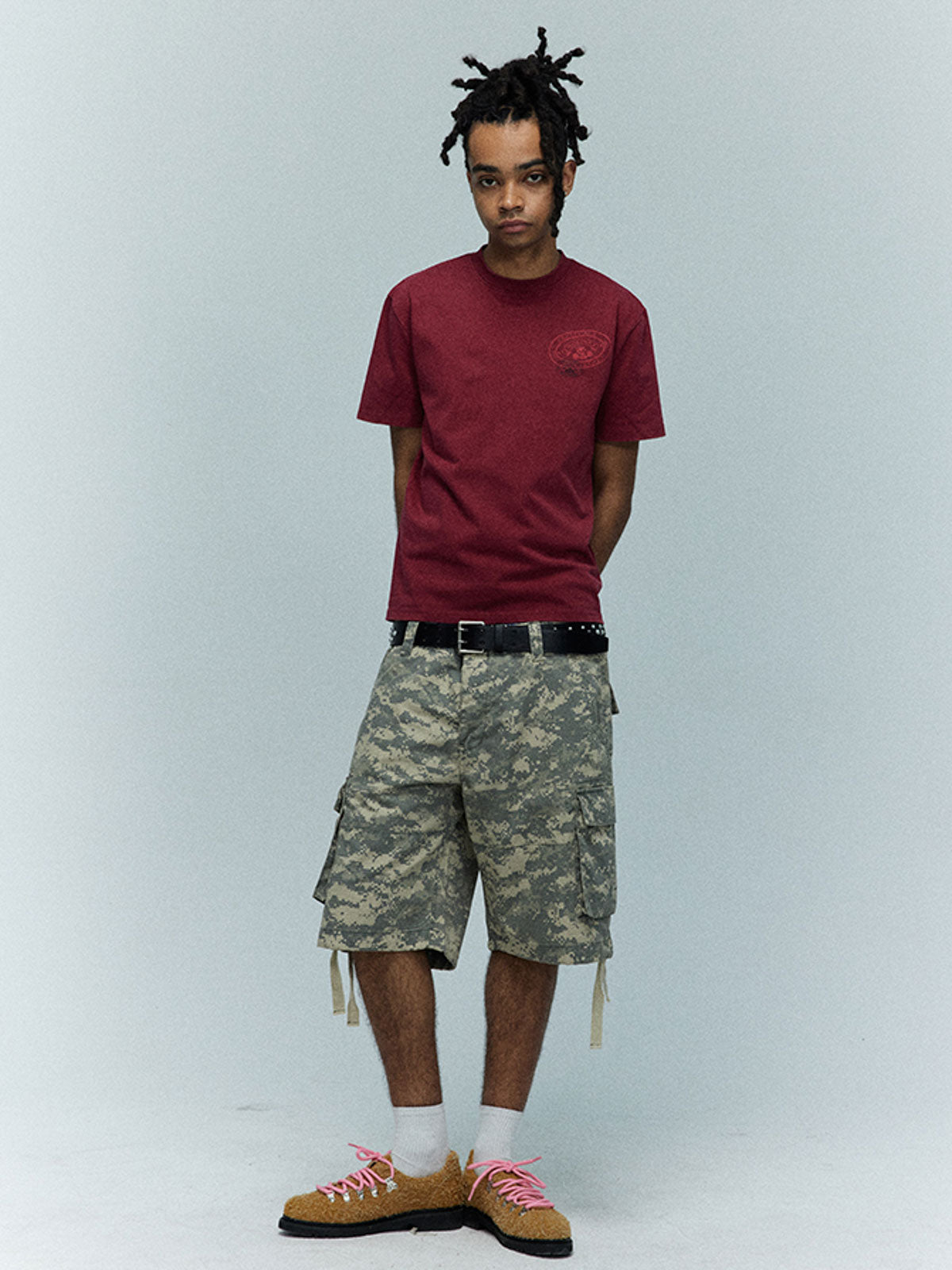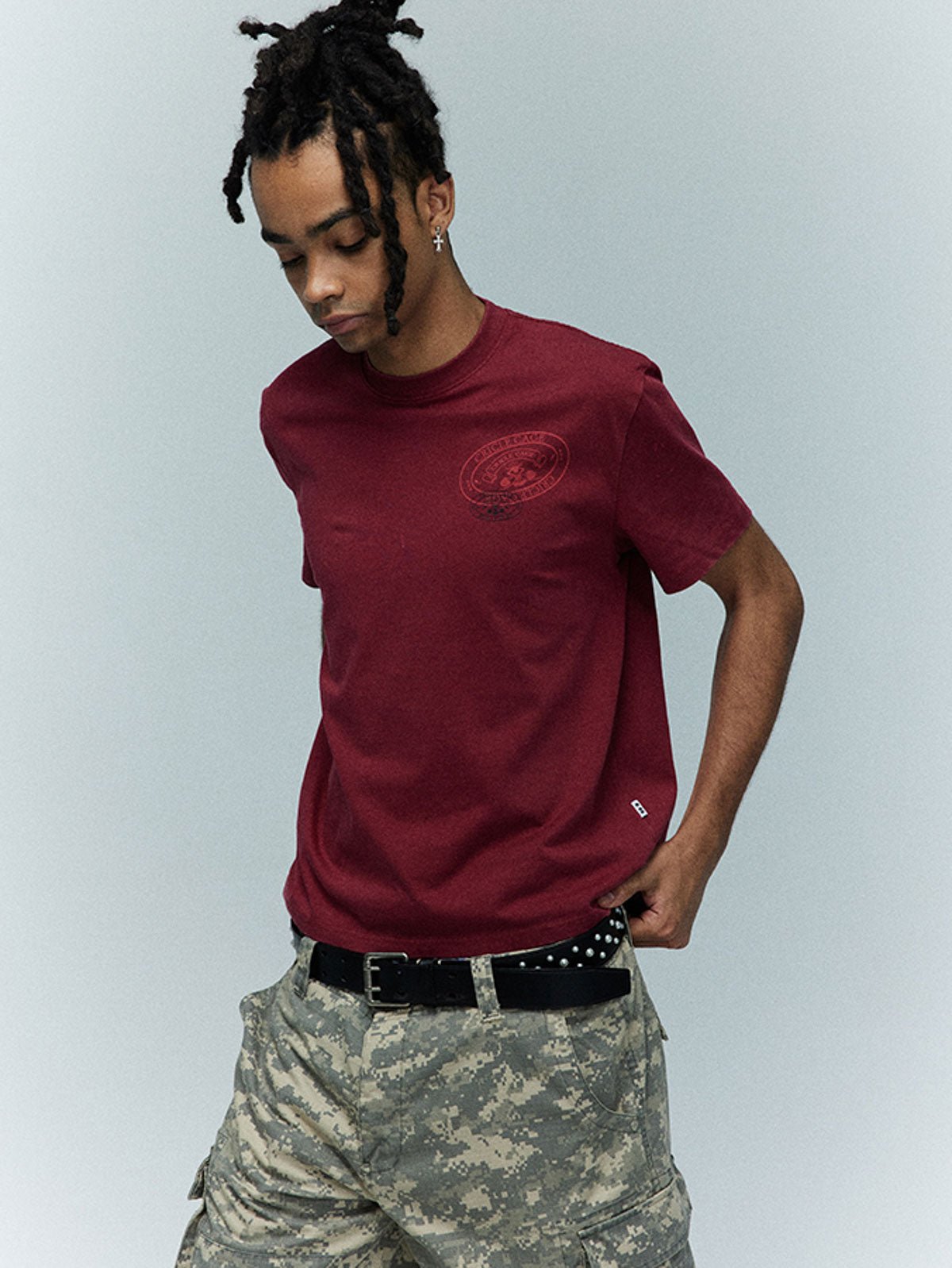 このTシャツは、260gのコットンニット生地を使用しており、滑らかでしなやか、しっかりとした形状でシワになりにくく、お手入れが簡単です。ベーシックなボックスフィットで、通勤や日常の着用に適しています。シルクスクリーン印刷技術を使用しており、プリントが剥がれにくいです。正肩カッティングで肩幅が広く見えます。エンブレムと重なった文字のプリントデザインが、独特のアメリカンストリートスタイルを演出します。特にジーンズやワークパンツと合わせやすく、カジュアルかつスタイリッシュなスタイルを提供します。夏のラウンドネック半袖として理想的な選択です。