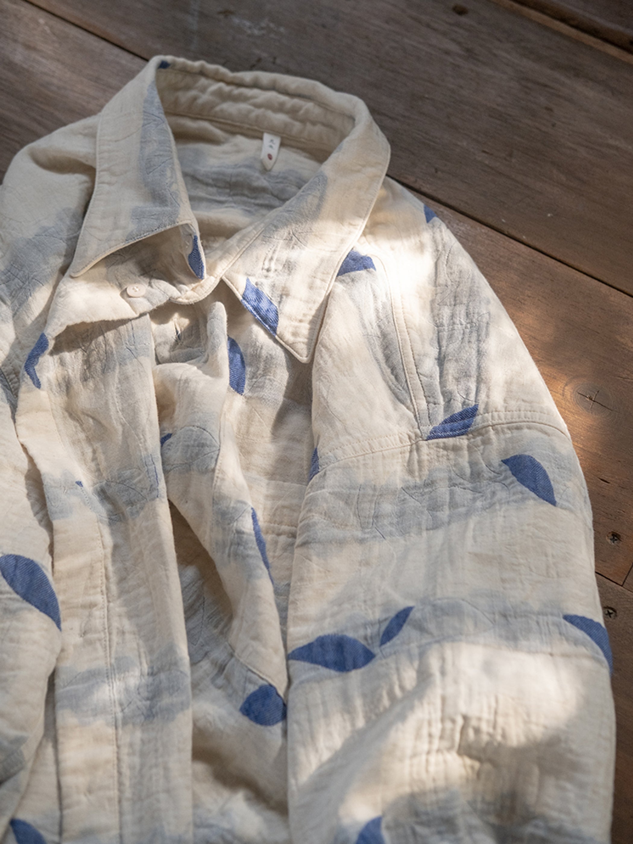本シャツは、180gの二重シャー織綿麻混紡生地(綿、麻、ビスコース、ポリエステル配合)を採用しており、柔らかく肌に優しく、通気性も抜群です。生地は天然のコットンシードシェルや麻繊維の独特な微細な瑕疵感を残し、個性的なヴィンテージ感を強調します。二重構造のため、洗濯後にシワが生じやすい点は、アイロンがけやシワを受け入れるスタイルとしてお楽しみいただけます。縫い目は大部分がフラット仕上げとなっており、襟元および袖口には裏地を加えた厚手仕様で形状保持性を向上させています。全体はルーズなシルエットで、既に水洗い加工済みのため縮みも抑えられ、日常のカジュアルコーディネートに最適です。