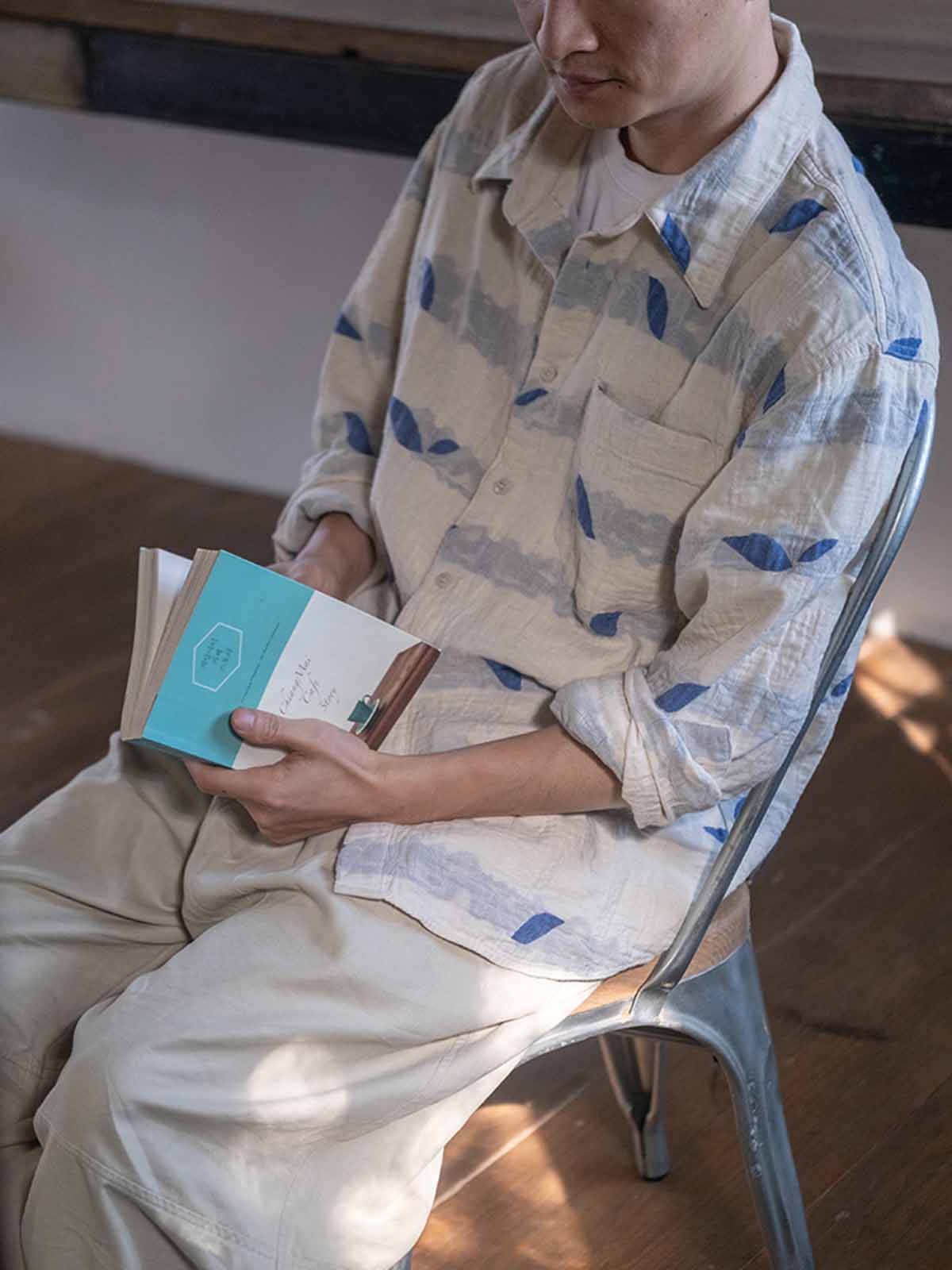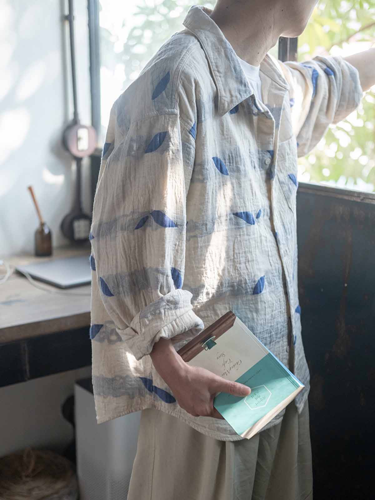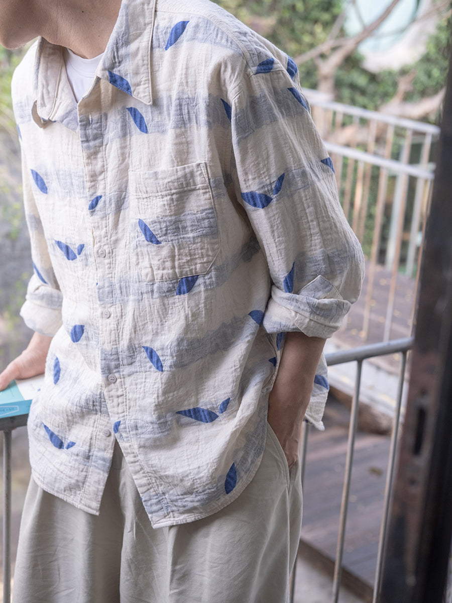 綿、麻、ビスコース、ポリエステルが織り交ぜられた二重シャー織生地を使用し、柔らかくふんわりとした天然の風合いを持つヴィンテージ風長袖シャツを実現します。