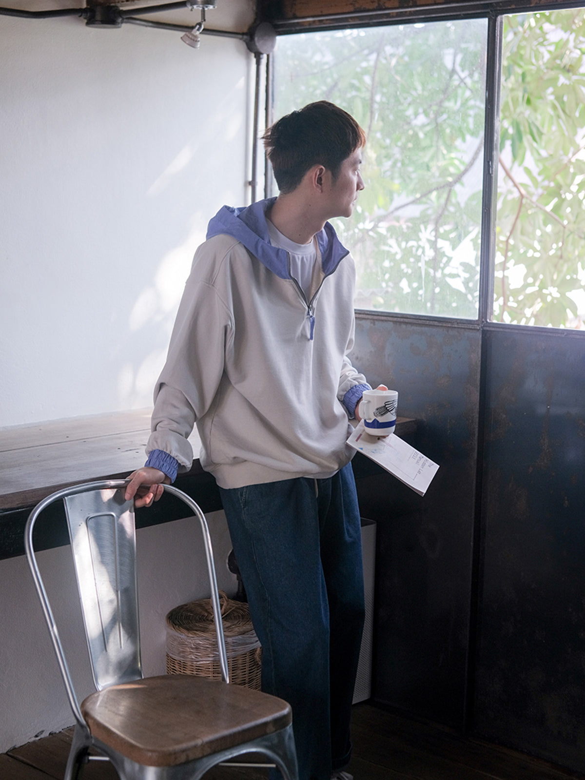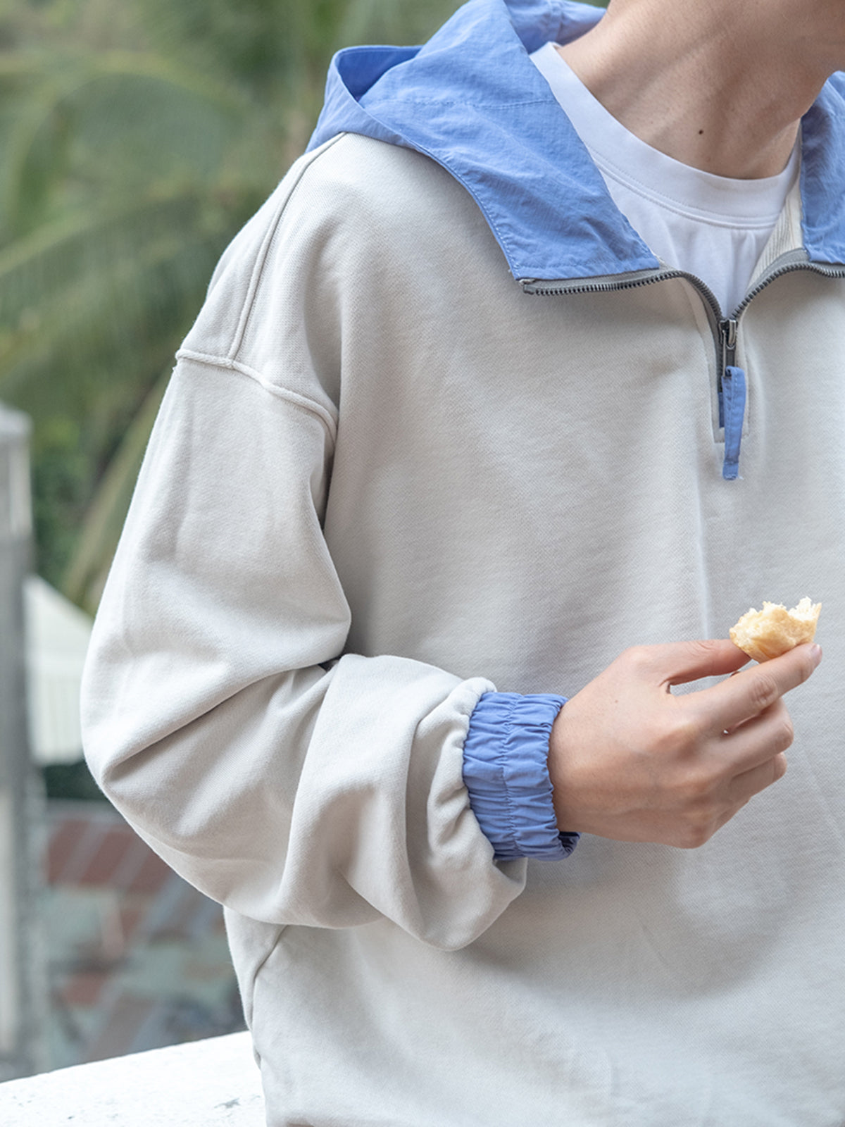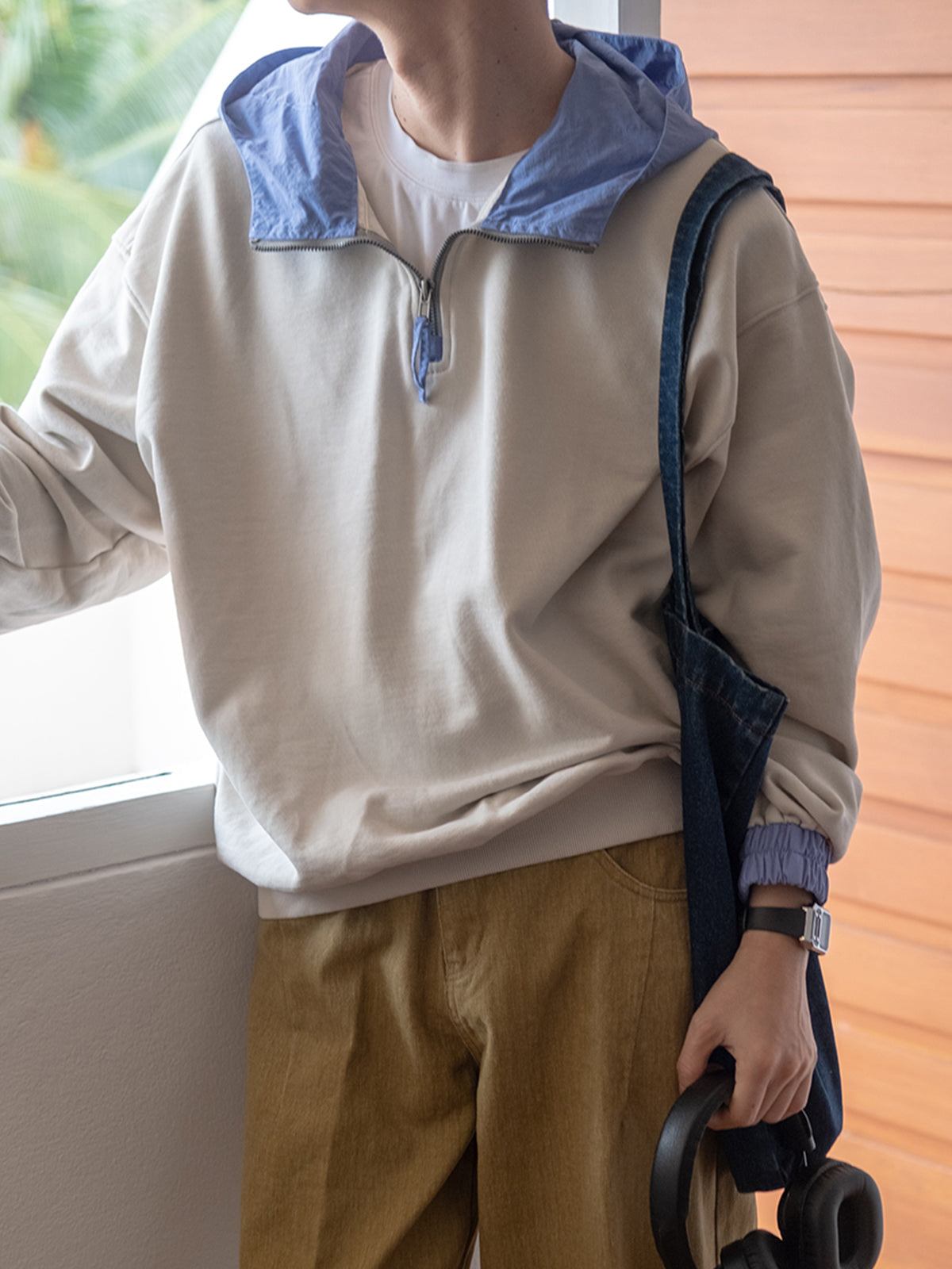 綿100%ループワイヤーを主素材に採用し、表面はクリアなテクスチャ、裏面は厚手で柔らかな肌触りを実現。ナイロン100%グリッド生地とのカラーコンビネーションで視覚的立体感を演出。金属ジップと綿製カラーガードで耐久性を向上させ、袖口リブ編みと裾リブ編みで保温性と動きやすさを両立。ユニセックスデザイン×クリームトーンで、春の日常着やカジュアルオフィスシーンに最適な、デザイン性と実用性を兼ね備えたアイテム。