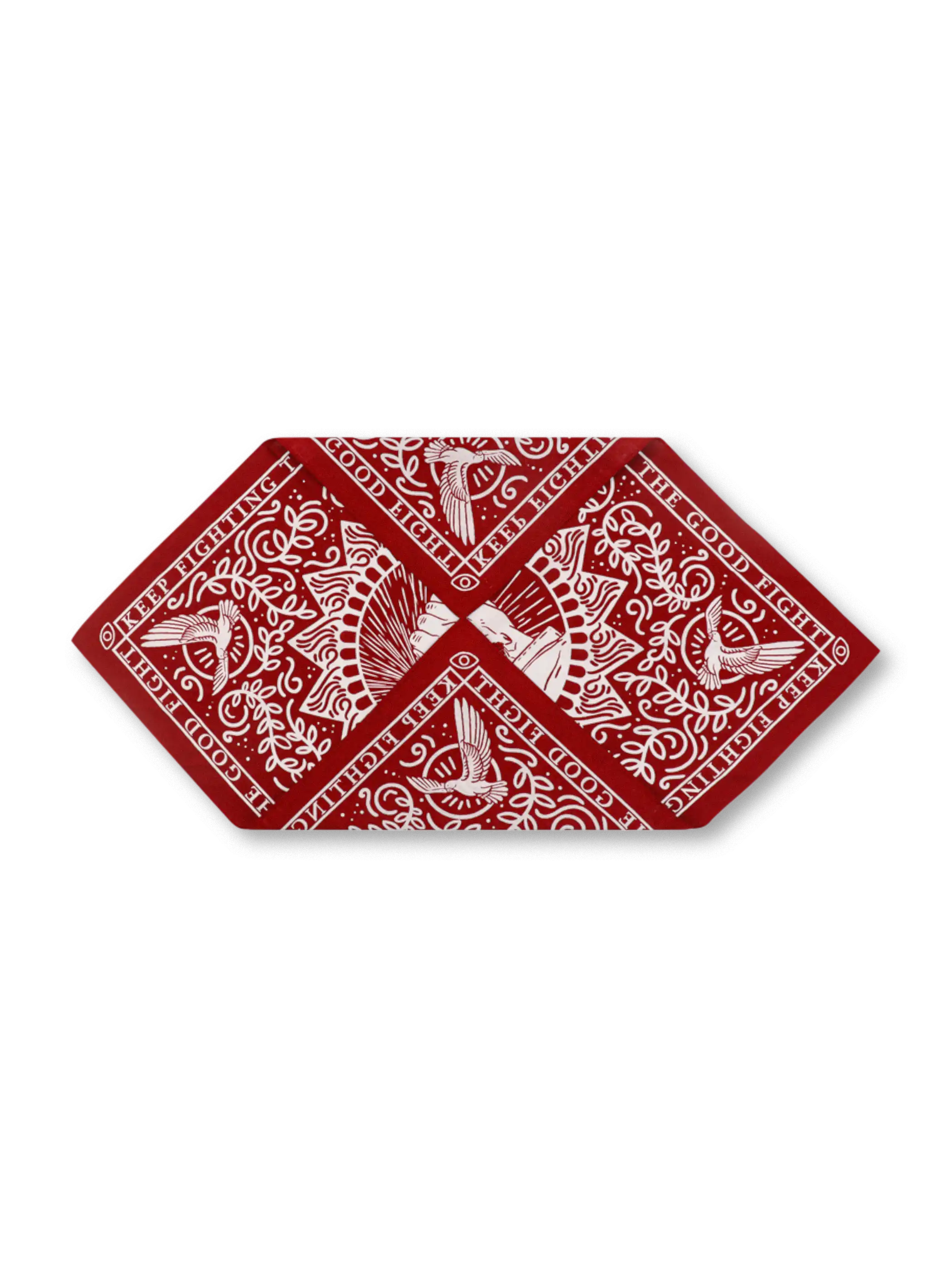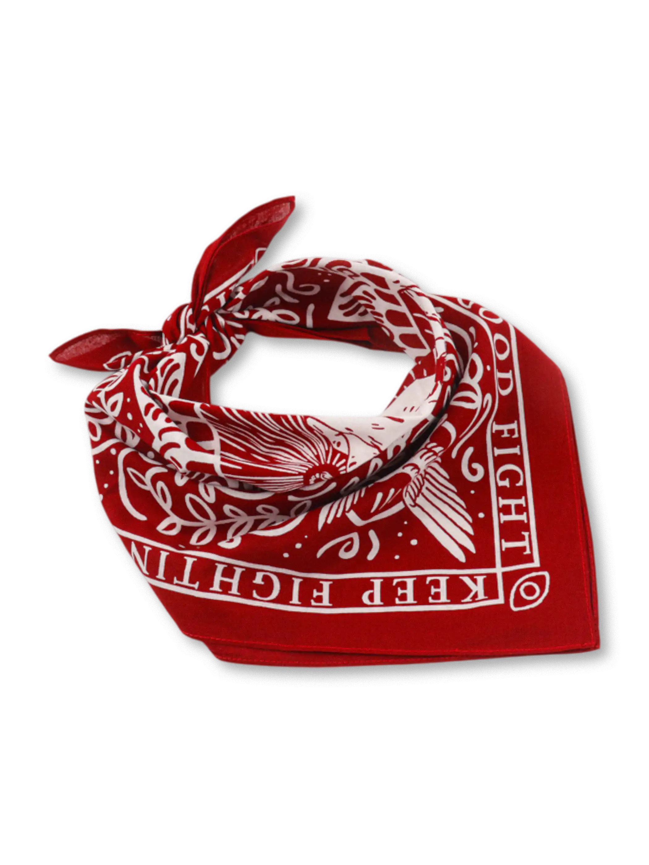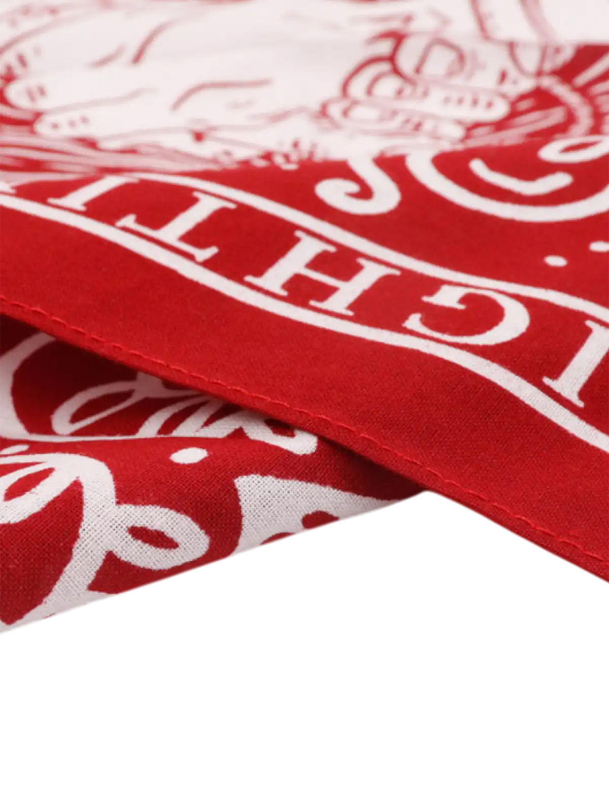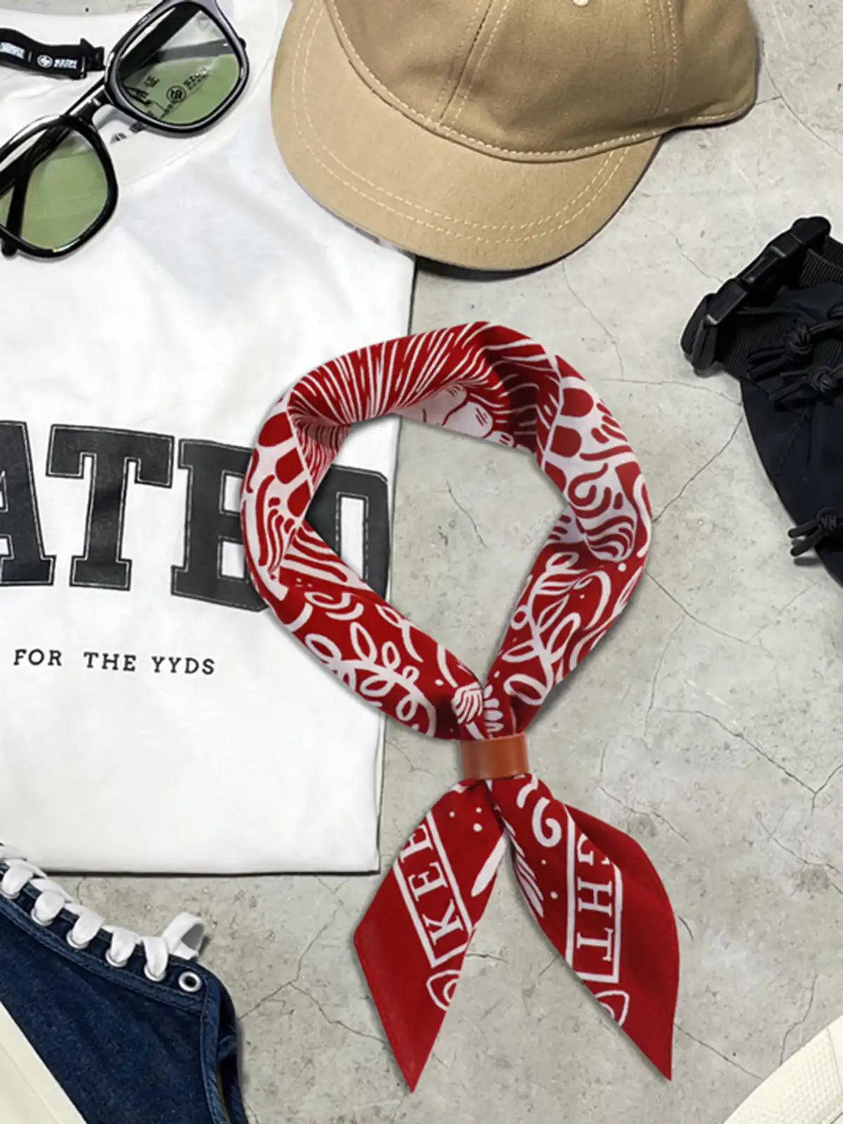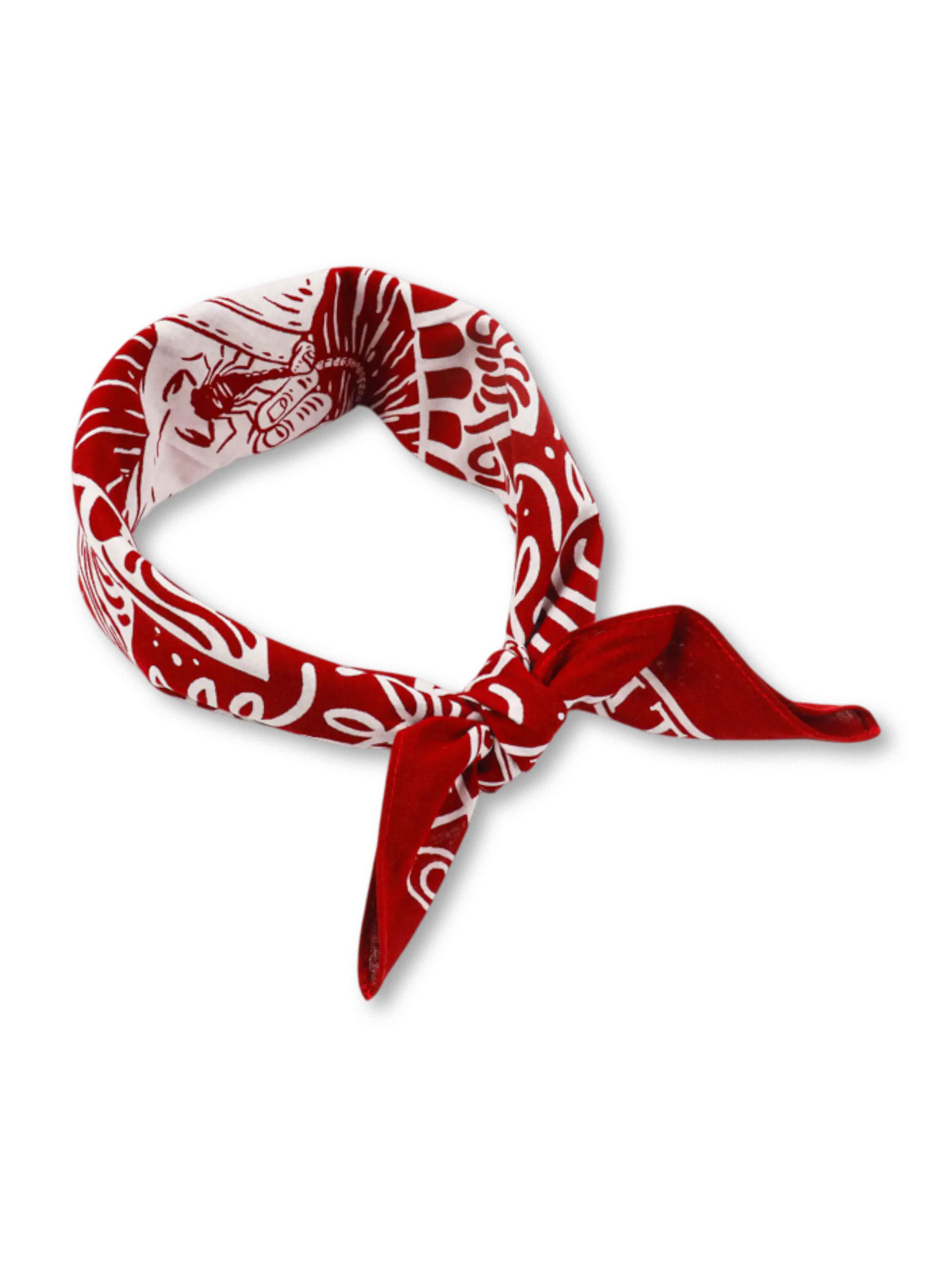 レッドを基調としたレトロな図案が、首元や頭、腰まわりなどさまざまな場所にアクセントを与えます。約56×56cmの正方形サイズで、ネックスカーフやヘアアクセサリー、マスク代わりにも使用可能。別売りのレザーダブルレイヤーやインディアンコイン風の留め具を使えば、よりアメカジ感を引き立てることができます。コンパクトながらも印象的なカラーリングが、シンプルなコーデを格上げする一枚です。