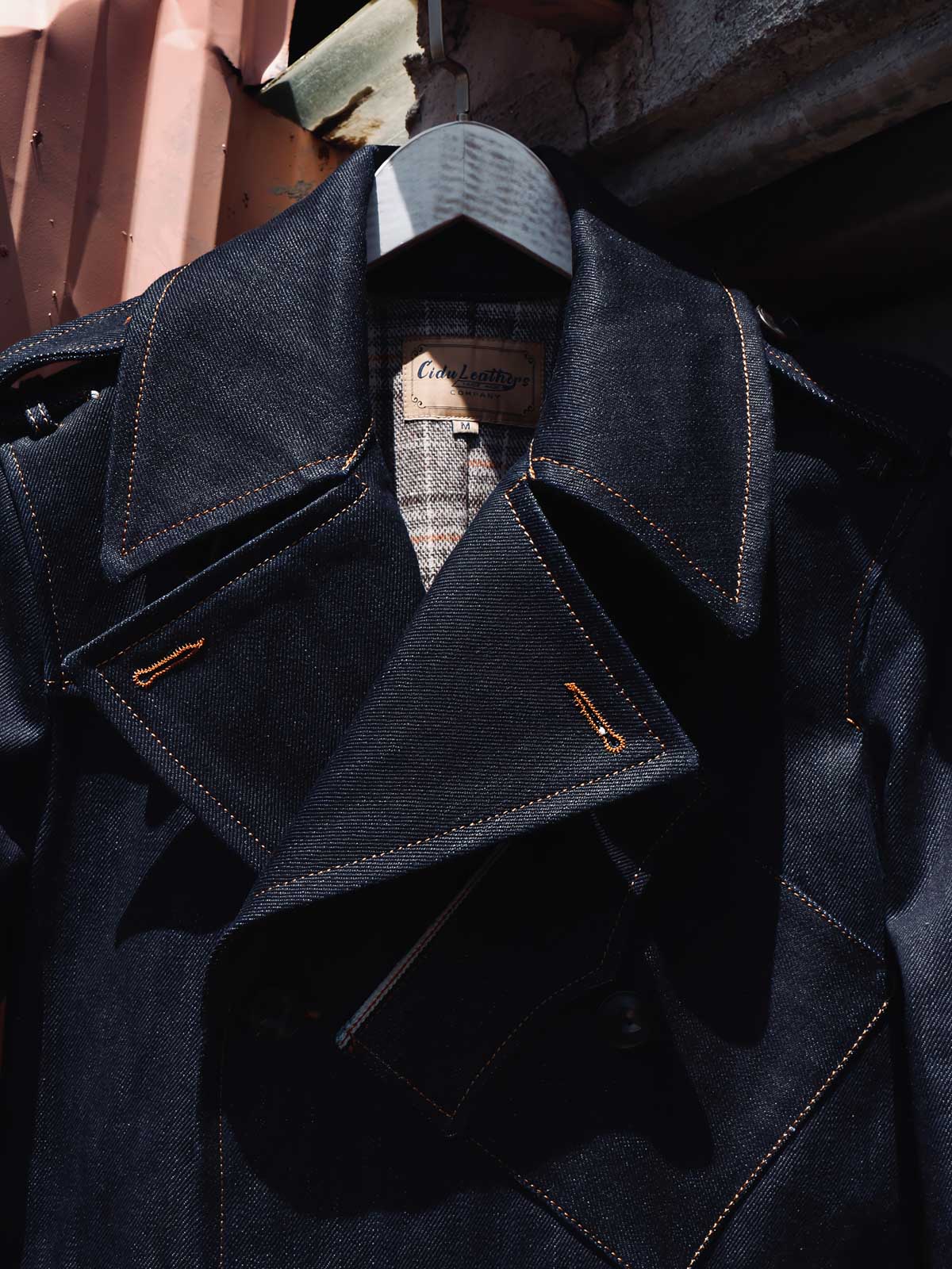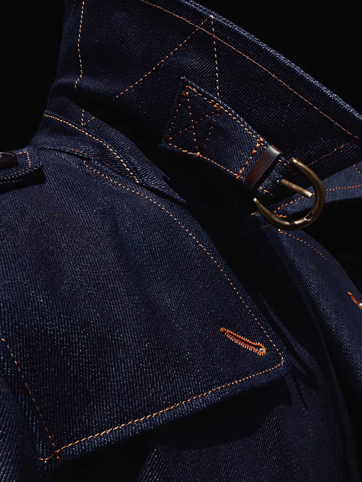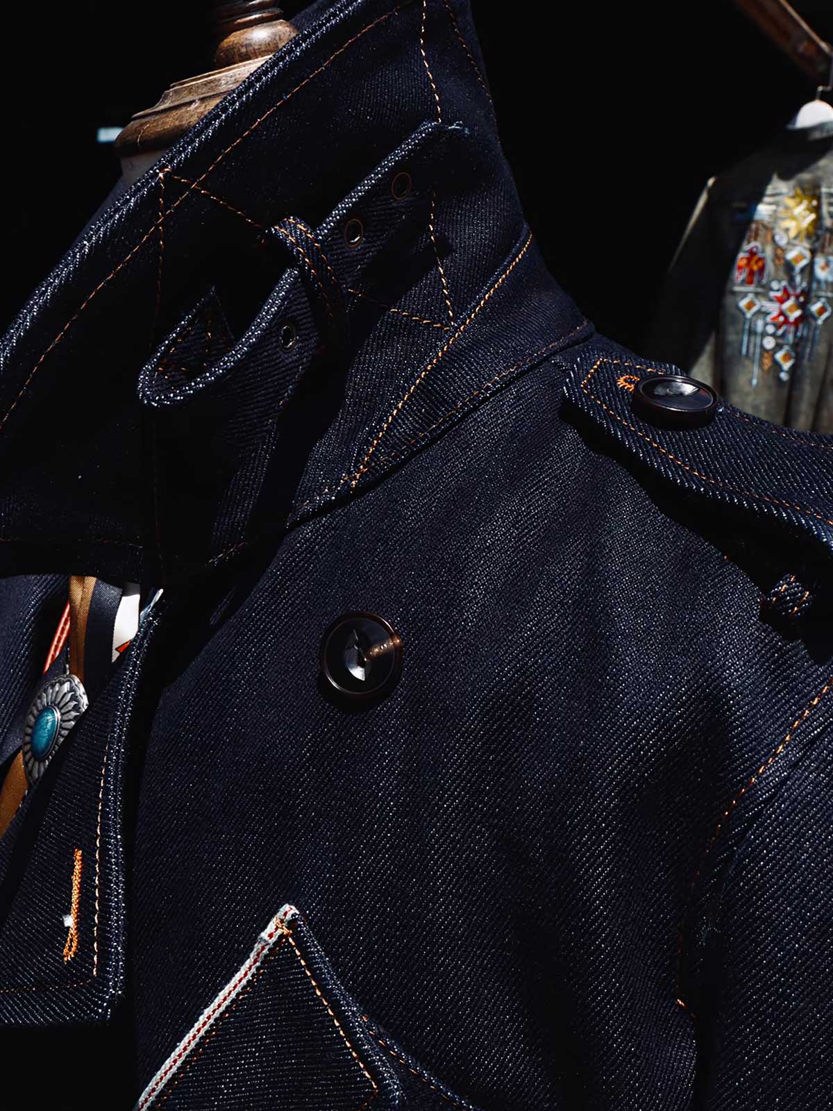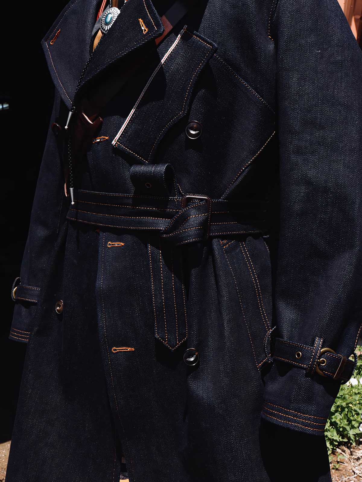 このトレンチコートは、19世紀後半の軍服から影響を受けています。英国式の伝統的なカッティングとビンテージスタイルを採用し、22オンスのセルビッチデニムを組み合わせています。この生地は、耐久性のあるワークウェアや歴史的な軍服の製作によく使用され、特徴的なのは未加工のセルビッチにあるテクスチャです。