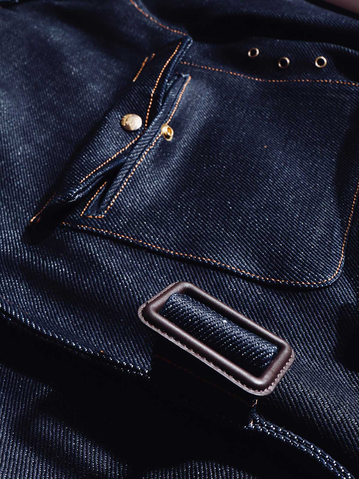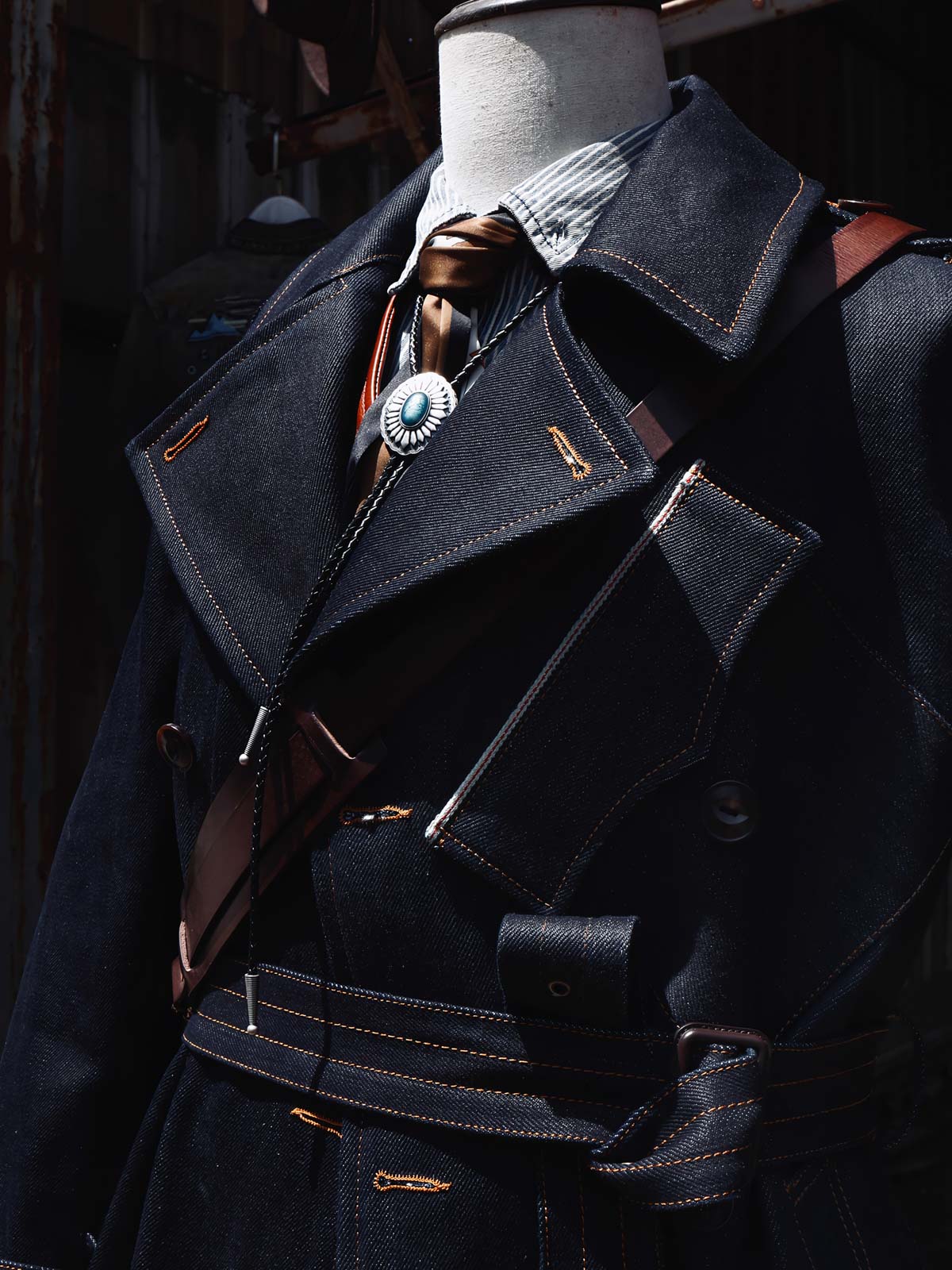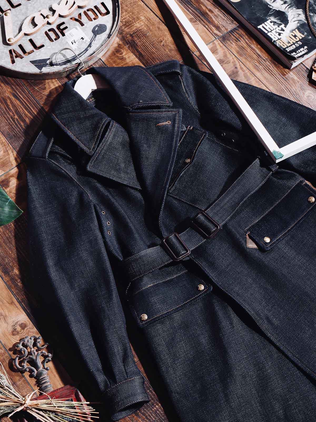このトレンチコートは、19世紀後半の軍服から影響を受けています。英国式の伝統的なカッティングとビンテージスタイルを採用し、22オンスのセルビッチデニムを組み合わせています。この生地は、耐久性のあるワークウェアや歴史的な軍服の製作によく使用され、特徴的なのは未加工のセルビッチにあるテクスチャです。