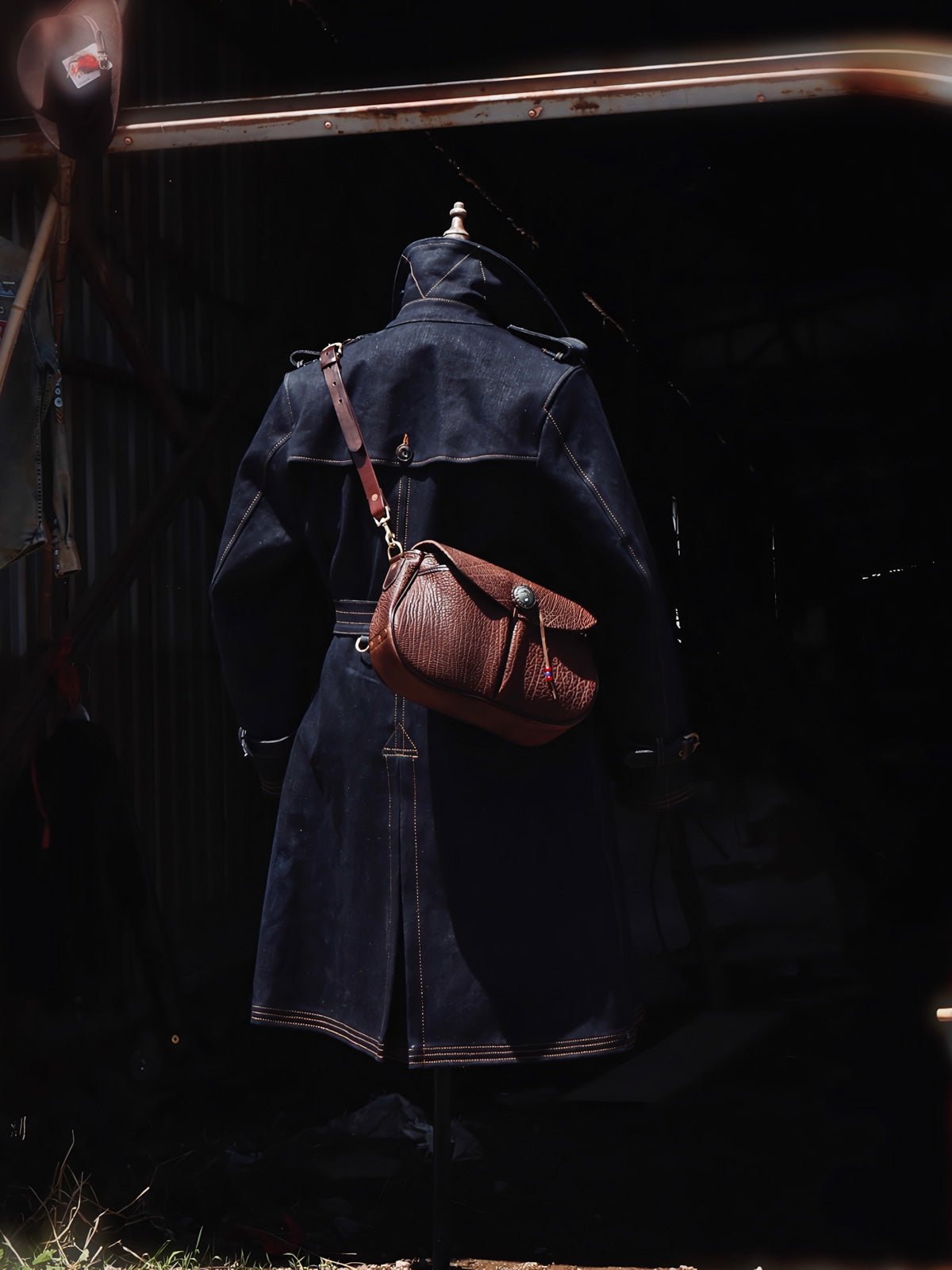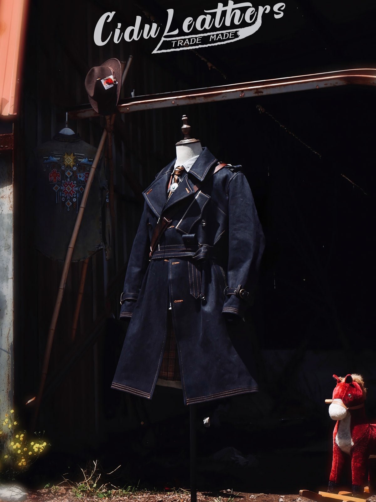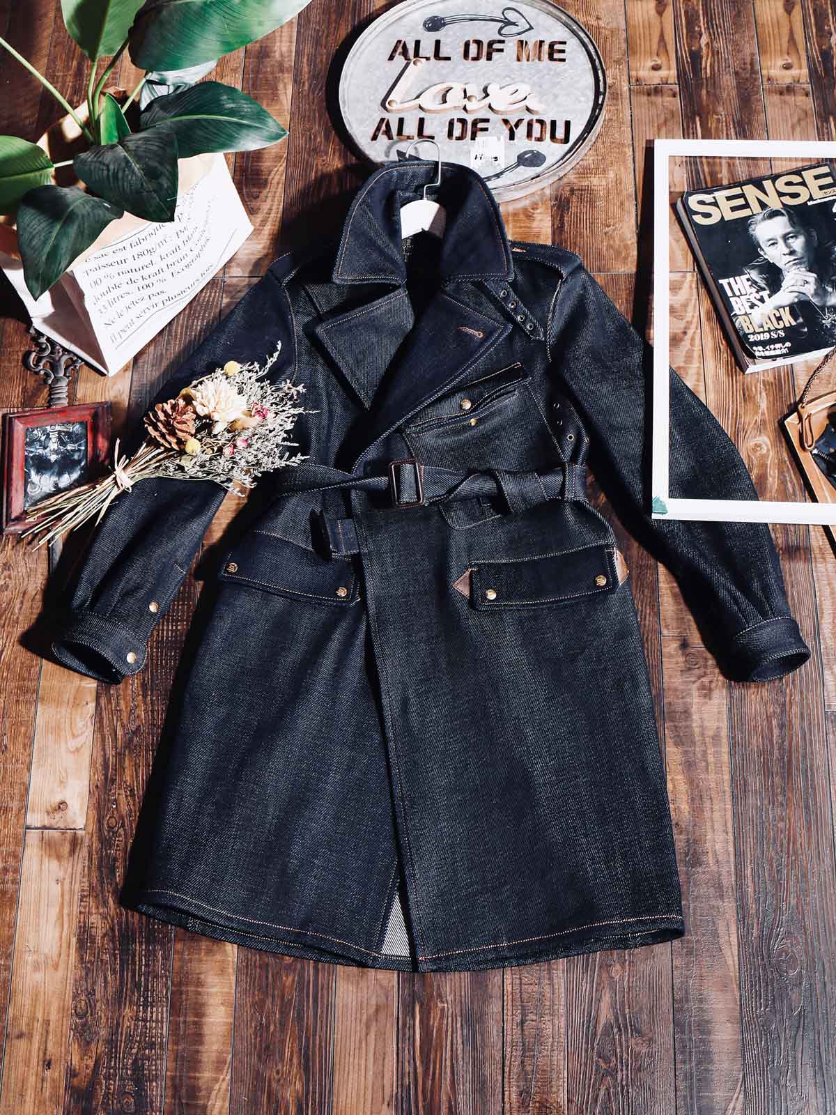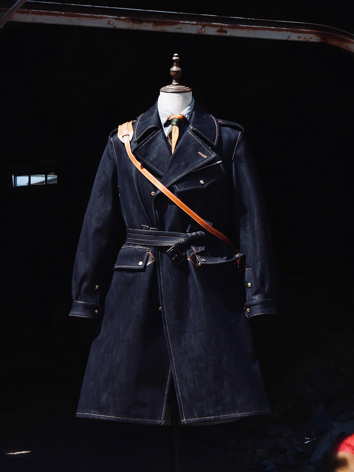 このトレンチコートは、19世紀後半の軍服から影響を受けています。英国式の伝統的なカッティングとビンテージスタイルを採用し、22オンスのセルビッチデニムを組み合わせています。この生地は、耐久性のあるワークウェアや歴史的な軍服の製作によく使用され、特徴的なのは未加工のセルビッチにあるテクスチャです。