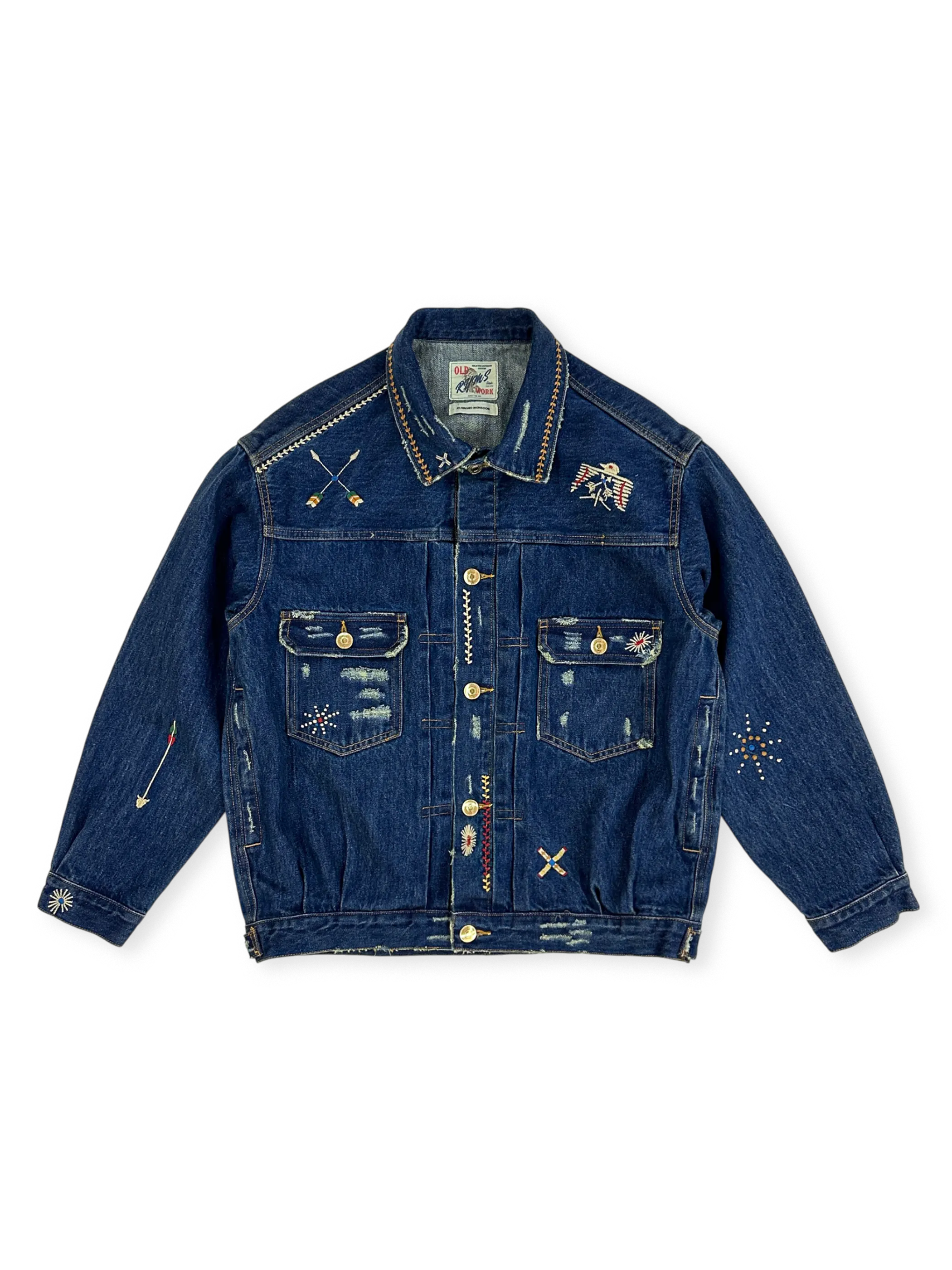 インディアンサンダーバードの刺繍デザインとクラシックなデニムスタイルを組み合わせた、耐久性と個性的なスタイルを両立するデニムジャケット。