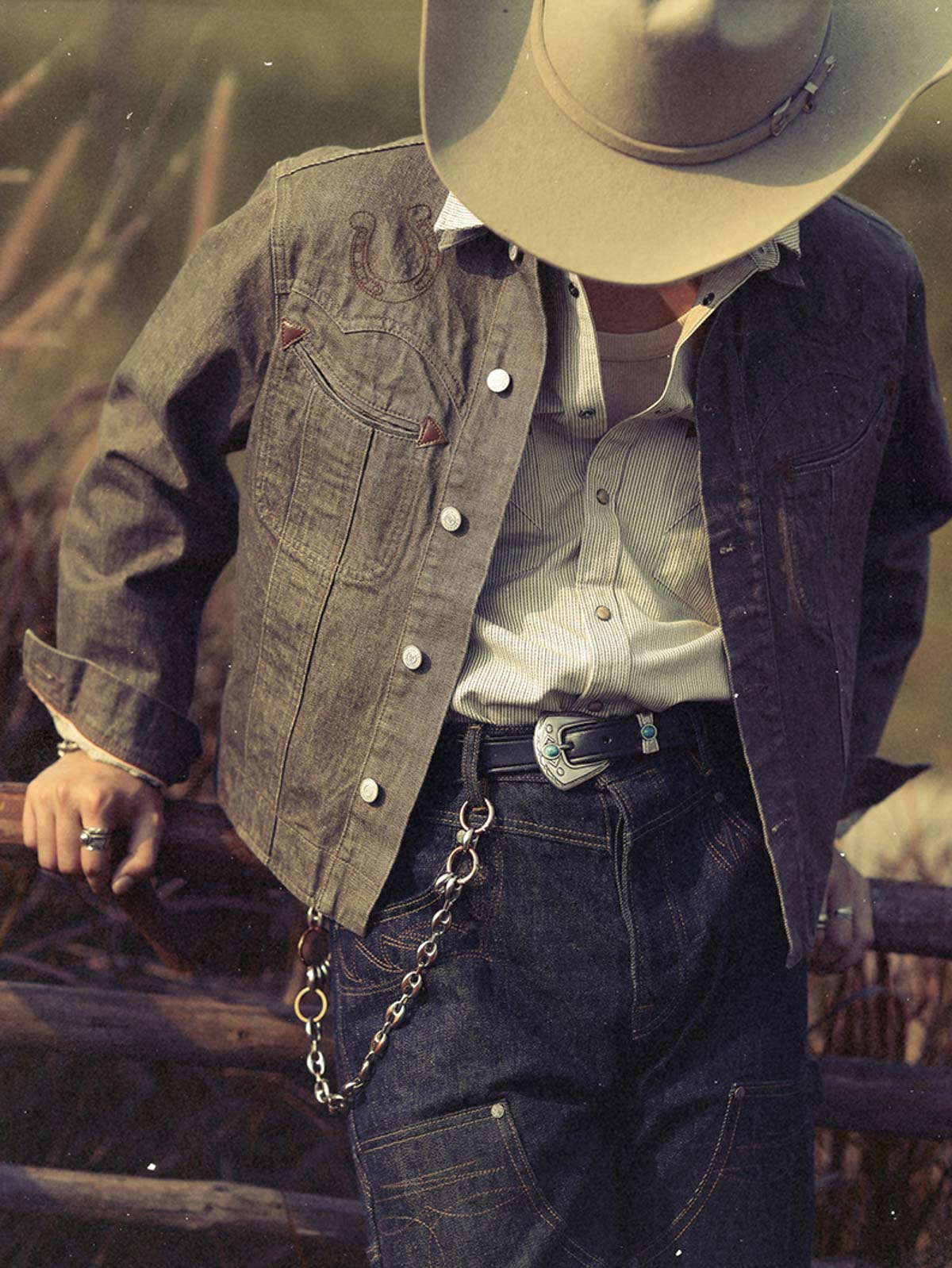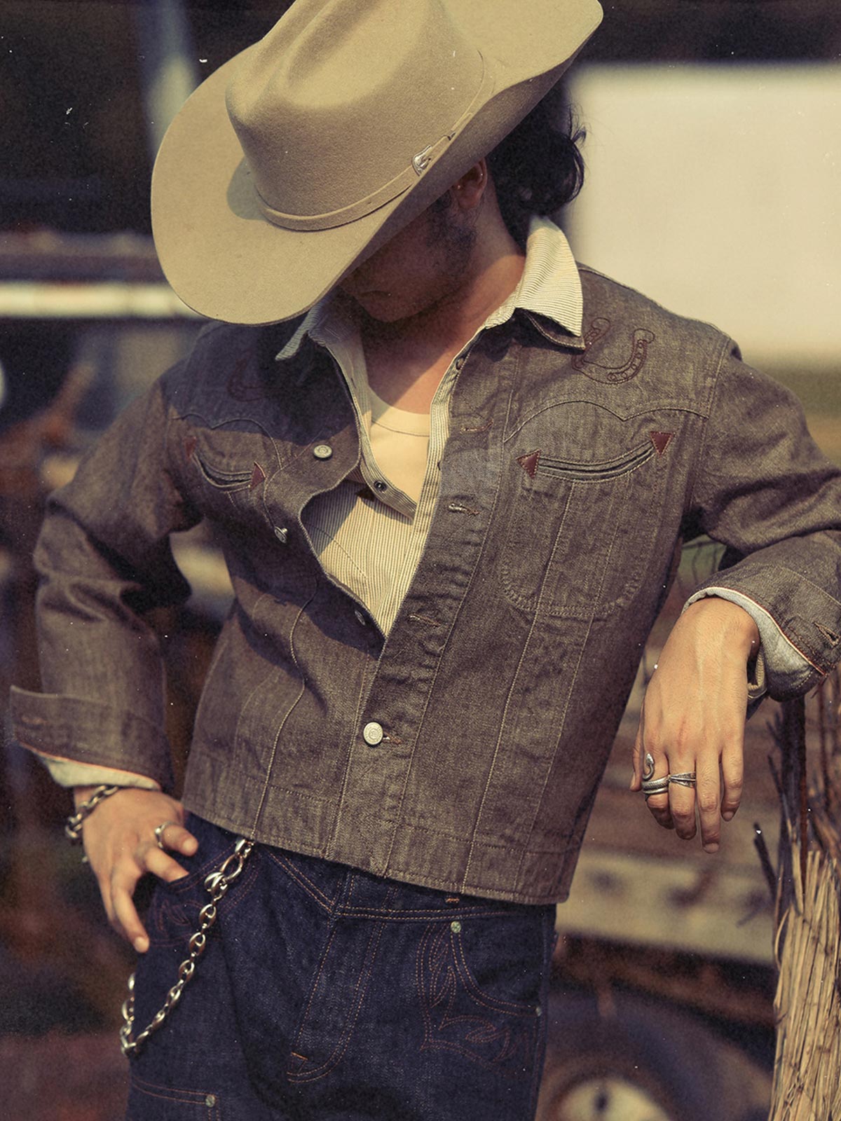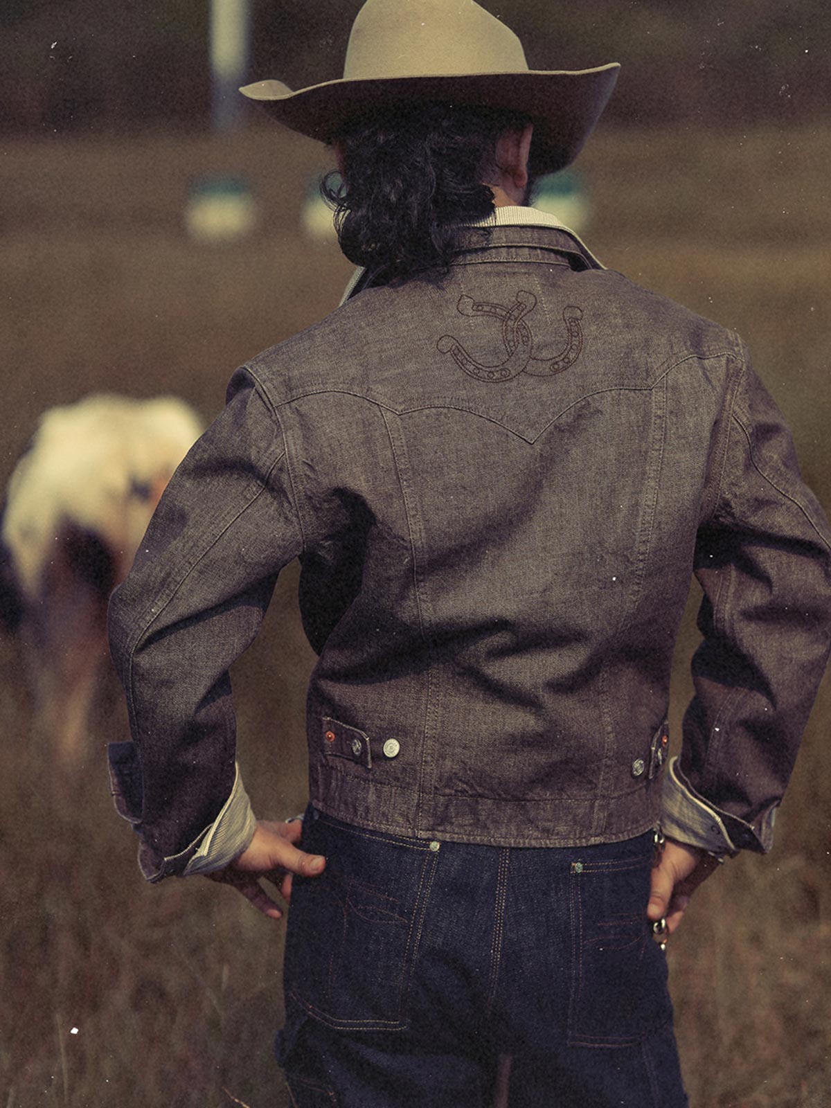 このライダースジャケットは、13.3オンスのセルビッジデニム生地を使用し、カーキグリーンの硫化染め加工が施されています。生地密度は68*50で、軽量ながらも適度なハリ感があり、日常のコーディネートに最適です。デザインは、80年代のロック文化と西部のカウボーイスタイルからインスパイアされ、1960年代のクラシックな100J型ショート丈シルエットを採用。前後のヨークにはジグザグの切り替えデザイン、西部風の「スマイル」ポケットがアクセントとなり、ヴィンテージ感を一層引き立てます。胸と背中に施されたラッキーホースシューの刺繍が、個性的なディテールを強調。脱漿不要の「SNAKEPIT」シリーズ限定レザーパッチと特別なパッケージが付属し、高級感のある仕上がりとなっています。特注のYKKリベットボタンとチェーンステッチが施され、耐久性も抜群です。
