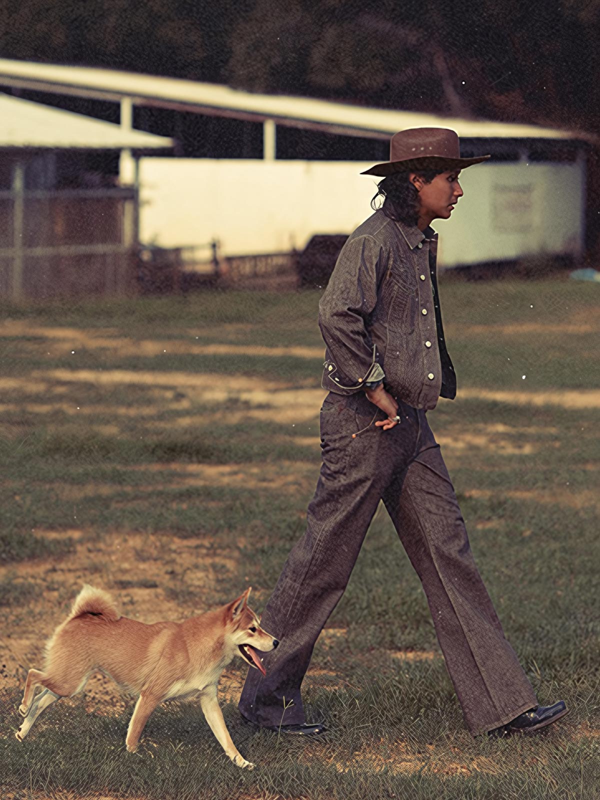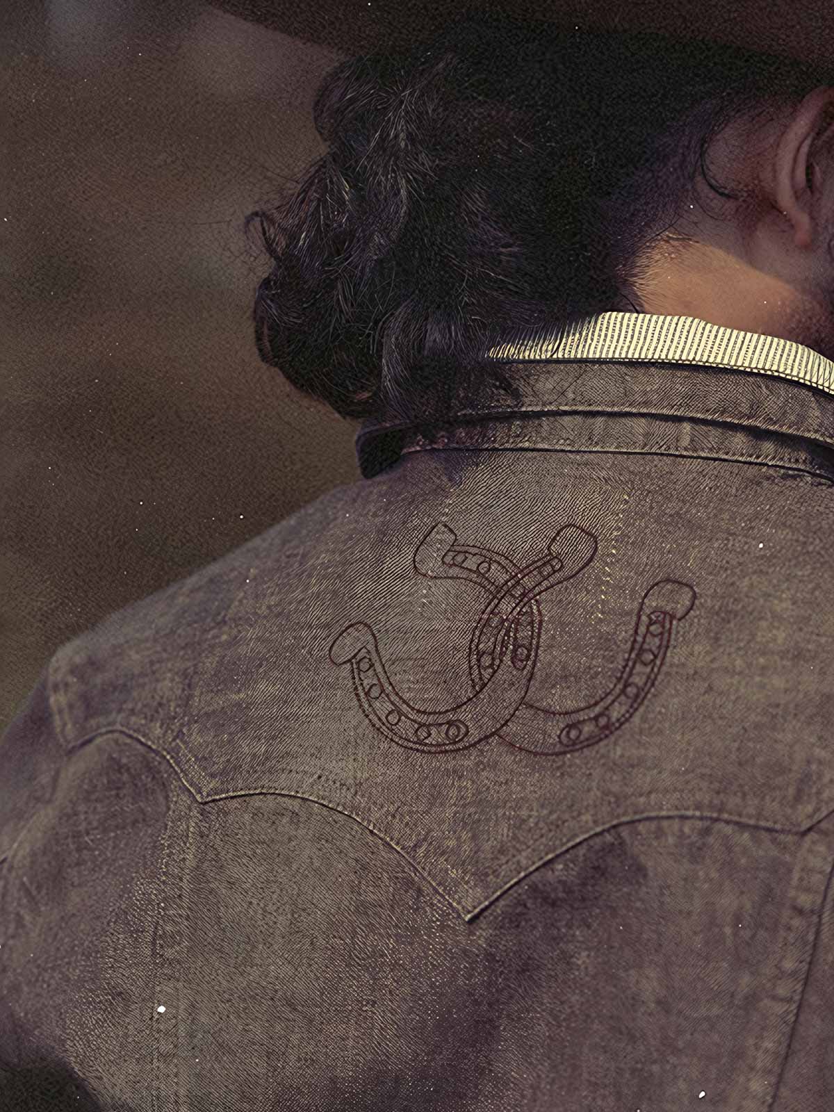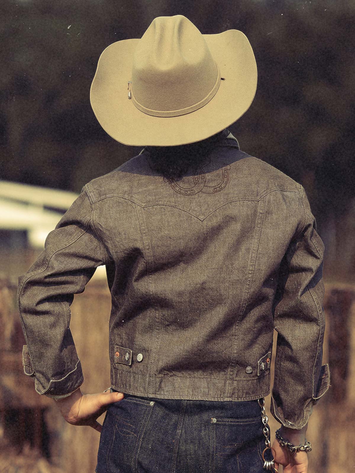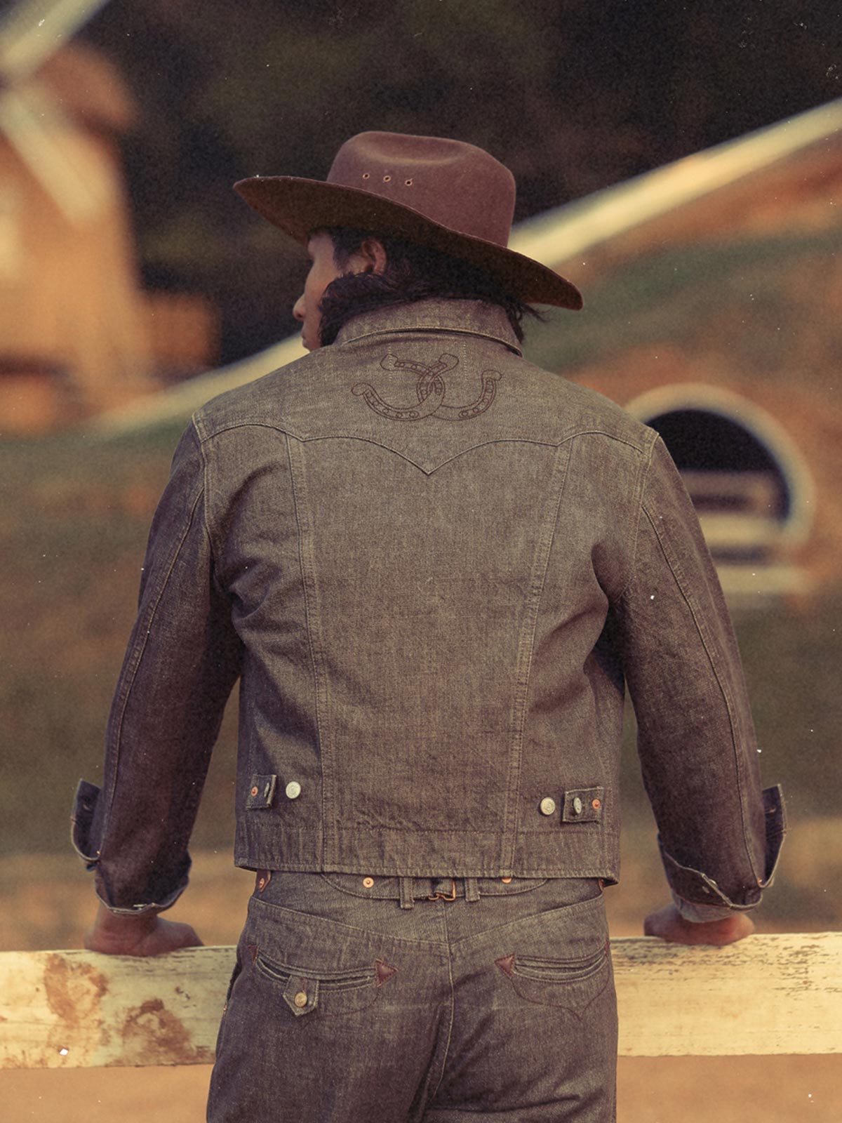 このライダースジャケットは、13.3オンスのセルビッジデニム生地を使用し、カーキグリーンの硫化染め加工が施されています。生地密度は68*50で、軽量ながらも適度なハリ感があり、日常のコーディネートに最適です。デザインは、80年代のロック文化と西部のカウボーイスタイルからインスパイアされ、1960年代のクラシックな100J型ショート丈シルエットを採用。前後のヨークにはジグザグの切り替えデザイン、西部風の「スマイル」ポケットがアクセントとなり、ヴィンテージ感を一層引き立てます。胸と背中に施されたラッキーホースシューの刺繍が、個性的なディテールを強調。脱漿不要の「SNAKEPIT」シリーズ限定レザーパッチと特別なパッケージが付属し、高級感のある仕上がりとなっています。特注のYKKリベットボタンとチェーンステッチが施され、耐久性も抜群です。