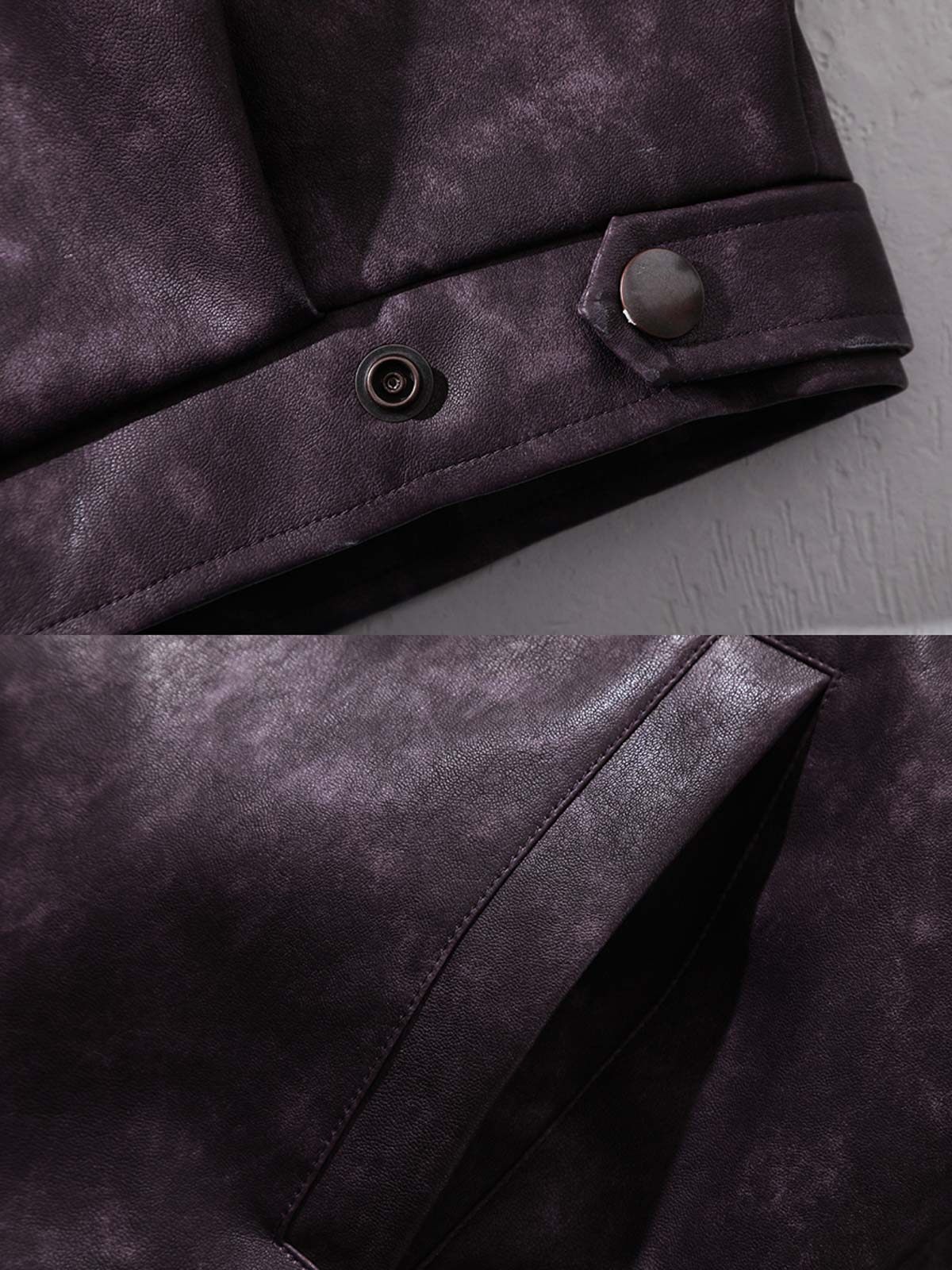 このPUレザージャケットは、耐久性と独特なヴィンテージ感を持つPUレザー素材を採用し、ローガンベリーのグレーがかったパープルトーンを基調としています。肩部分に施されたチェッカーフラッグ柄パッチワークが視覚的にアクセントを加え、レーシングスタイルを強調。ショート丈のルーズフィットデザインにより、シャープなシルエットが引き立ち、体型を問わずスタイリッシュに着こなせます。袖口と裾には調整機能が備わっており、防風性と保温性を向上させることで、秋や春先のアウターとして最適です。YKK製アンティークブロンズジッパーとスナップボタンが高級感を演出し、裏地はキュプラのような滑らかで快適な質感を提供。クラシックなデザインとレーシング風の要素を兼ね備えた、機能性とファッション性が融合した一枚です。