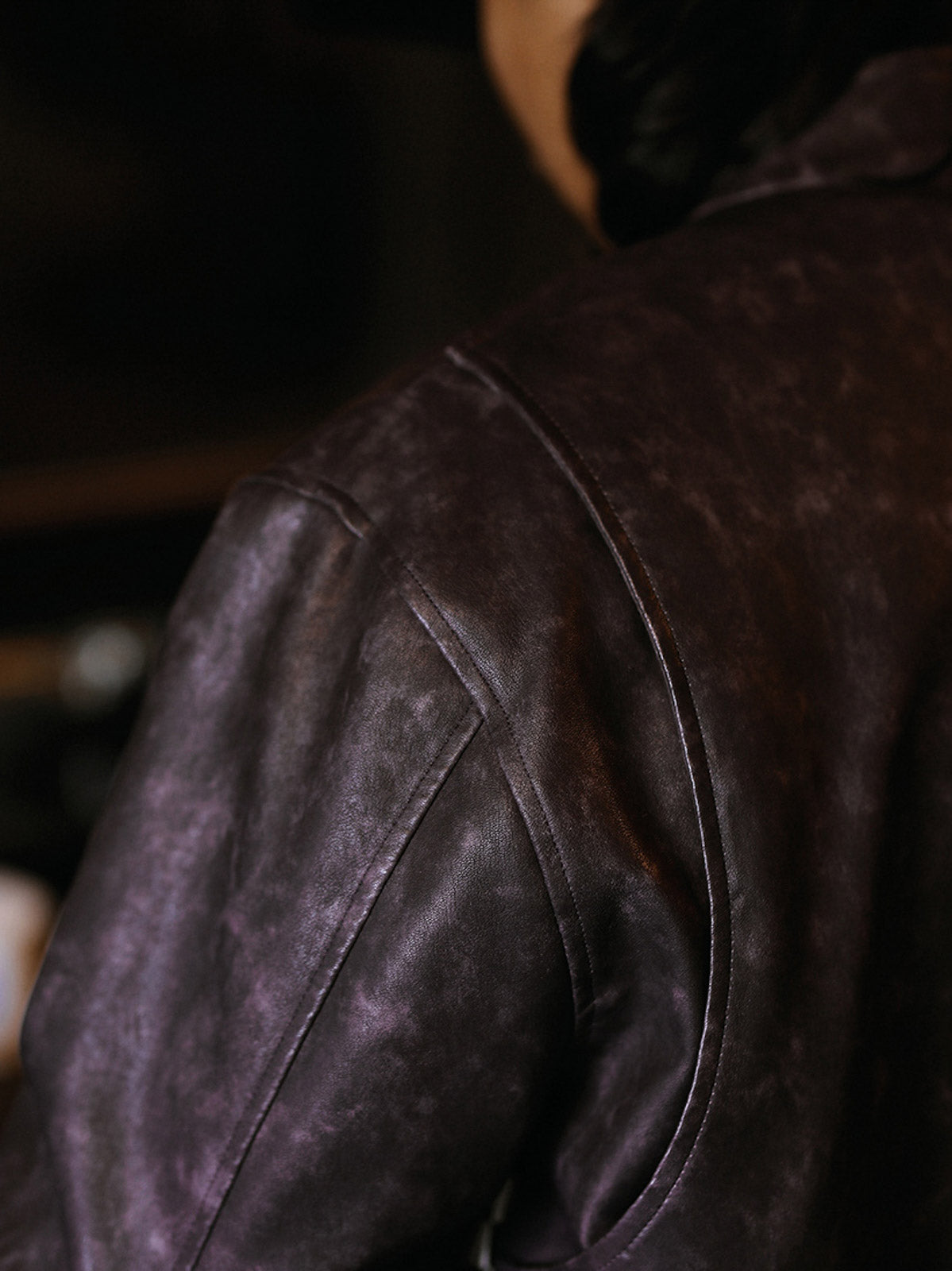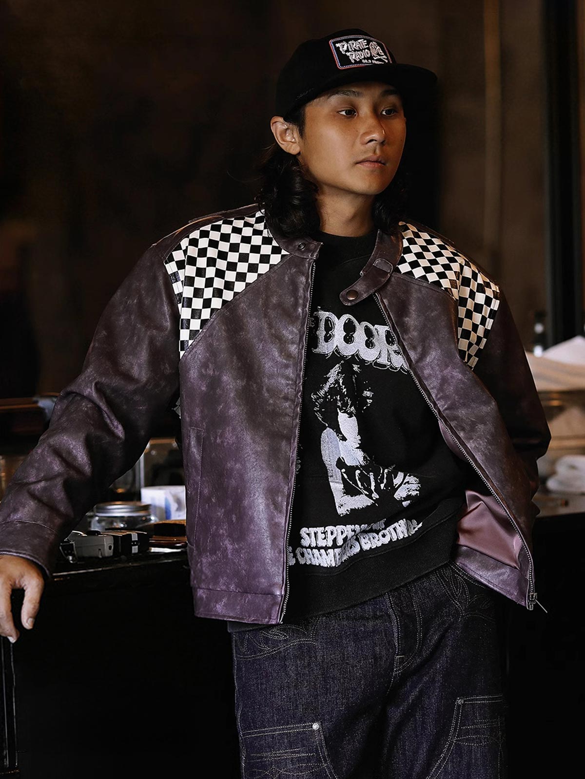 クラシックなJ100ライダースジャケットを基に、ヴィンテージ加工とチェッカーフラッグ柄パッチワークを融合させた独自のレーシングスタイルのPUレザージャケット。