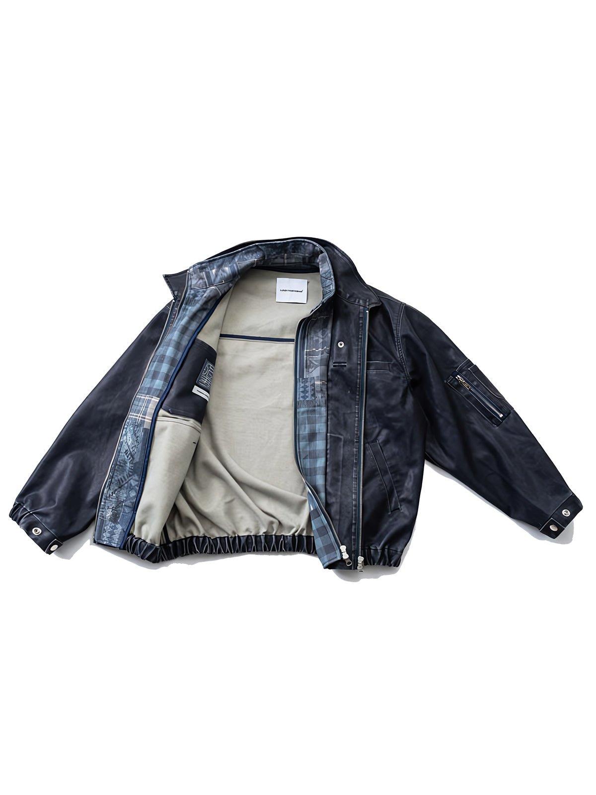このジャケットは、PUレザーにウォッシュ加工と擦れ加工を施すことで、独特のヴィンテージ感を強調しています。クラシックなMA-1デザインをベースにしながら、ワイドなドロップショルダーとゆったりとしたシルエットが快適さとモード感をアップさせています。内側にはエスニック柄の裏地を採用し、ダブルレイヤード風のデザインが奥行き感を演出。ジッパー付きの胸元と袖のディテールが、機能性と実用性を兼ね備えており、秋冬のコーディネートに取り入れやすいスタイリッシュなアイテムです。