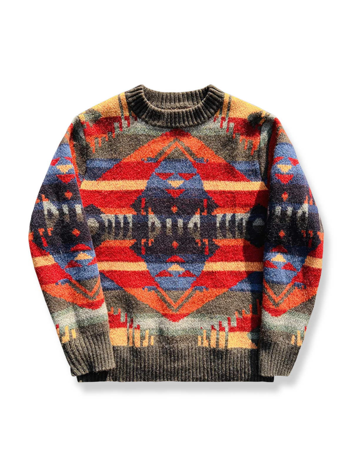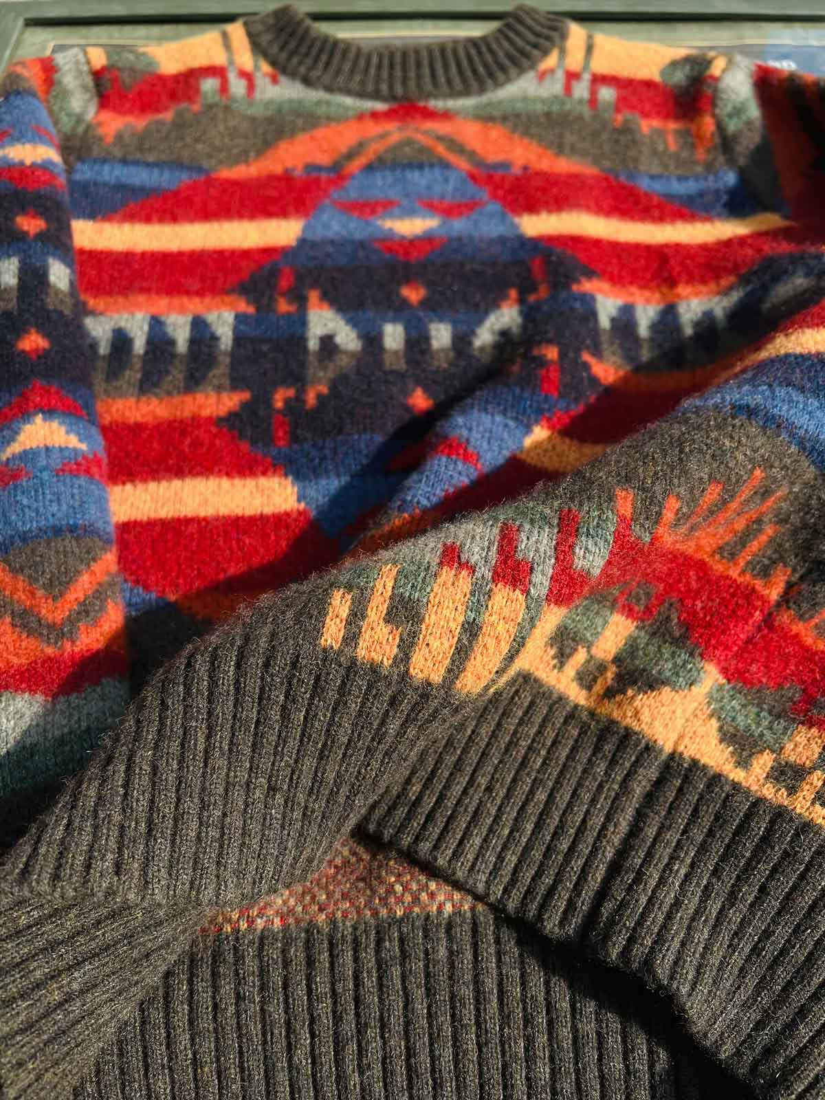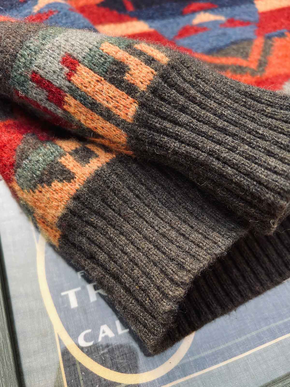このウールセーターは、アメリカ南西部のナバホ族のトーテムからインスピレーションを得ています。そのユニークな幾何学模様と鮮やかな色の組み合わせは、この先住民族の文化芸術を反映しています。