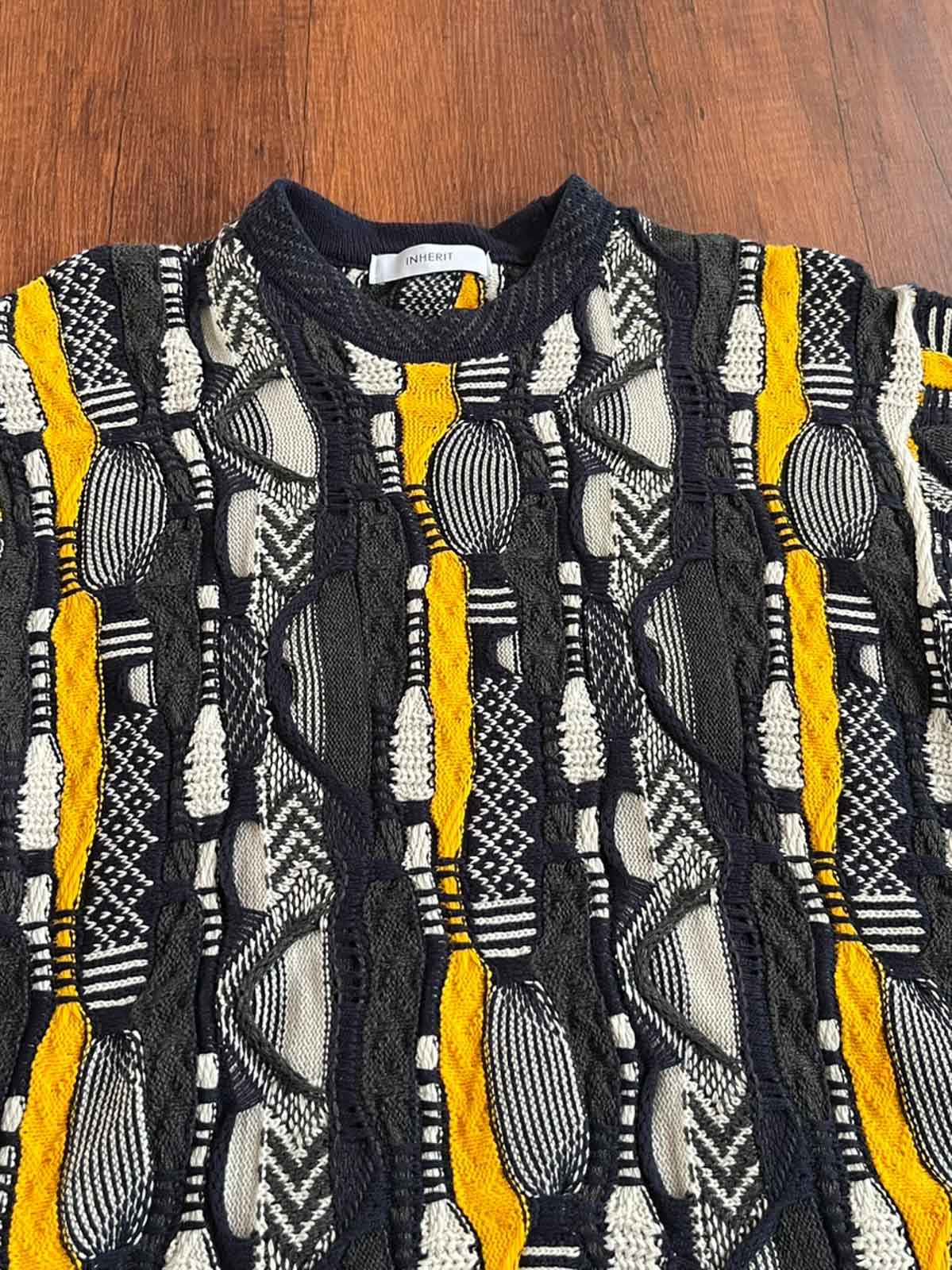 ヴィンテージ風のゴーヤ柄立体編みセーター。複雑な編み工芸としっかりとした手触りが特徴。