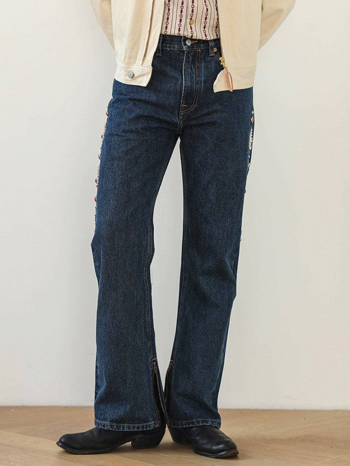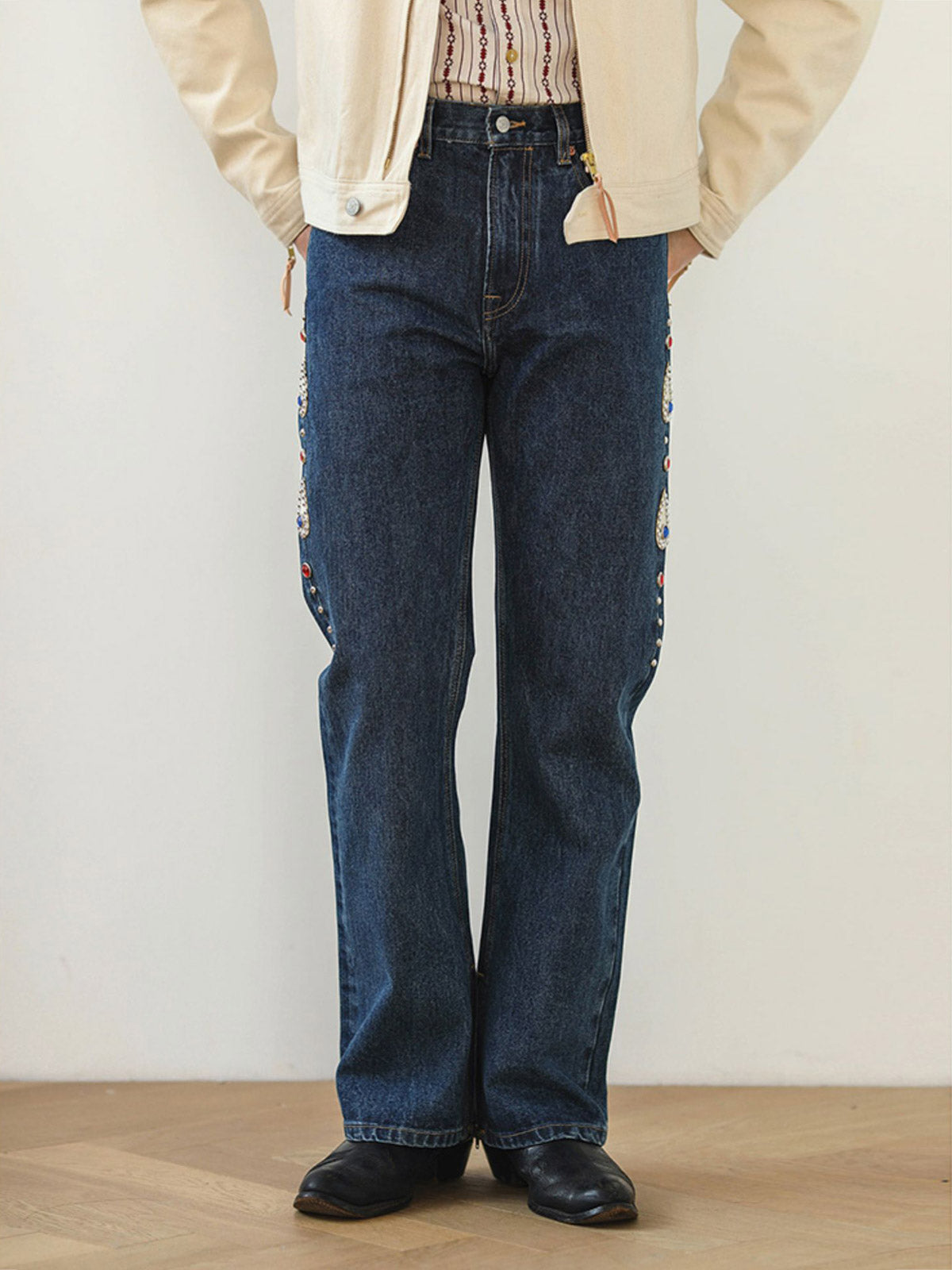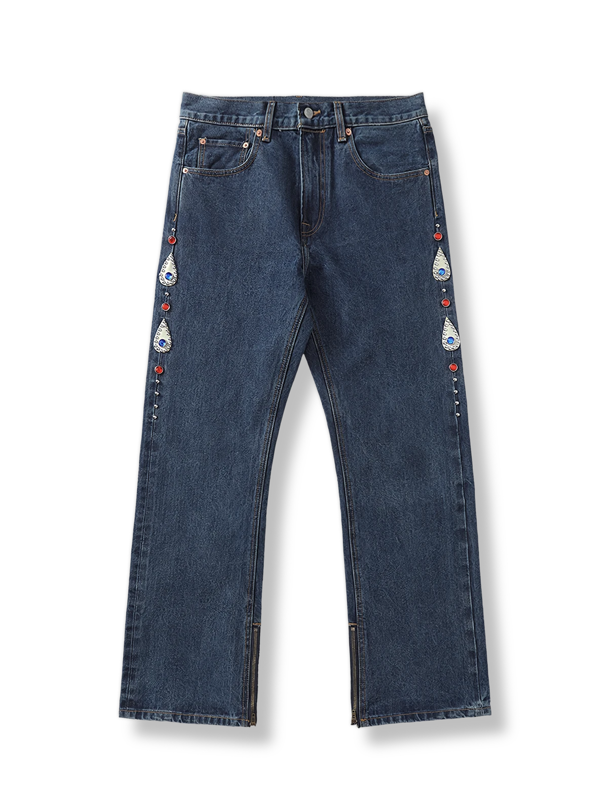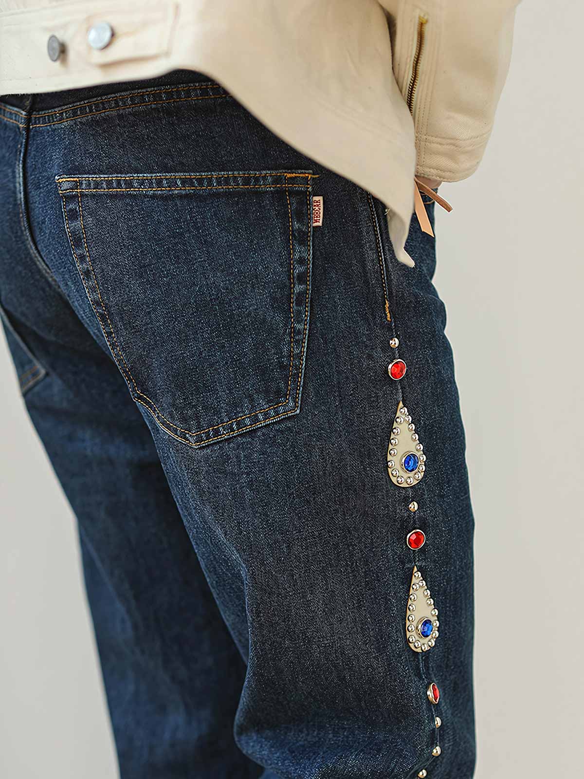 厳選されたセルビッチデニムを使用し、手作業で施されたリベットと宝石の装飾は、パンツの独特な魅力を引き立てるとともに、職人の手仕事に対するこだわりを感じさせます。耐久性と快適さにこだわったこのデニムは、長時間の着用にも耐えうるクオリティを誇ります。