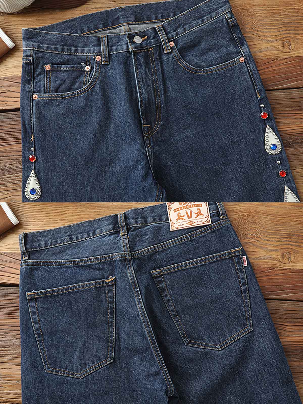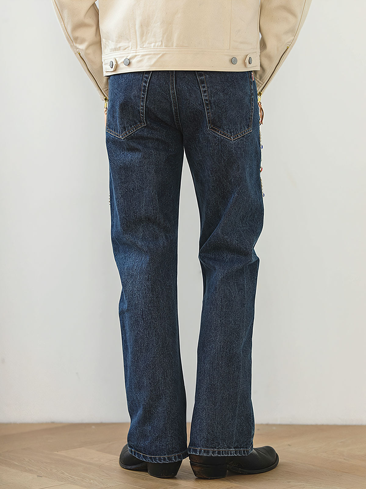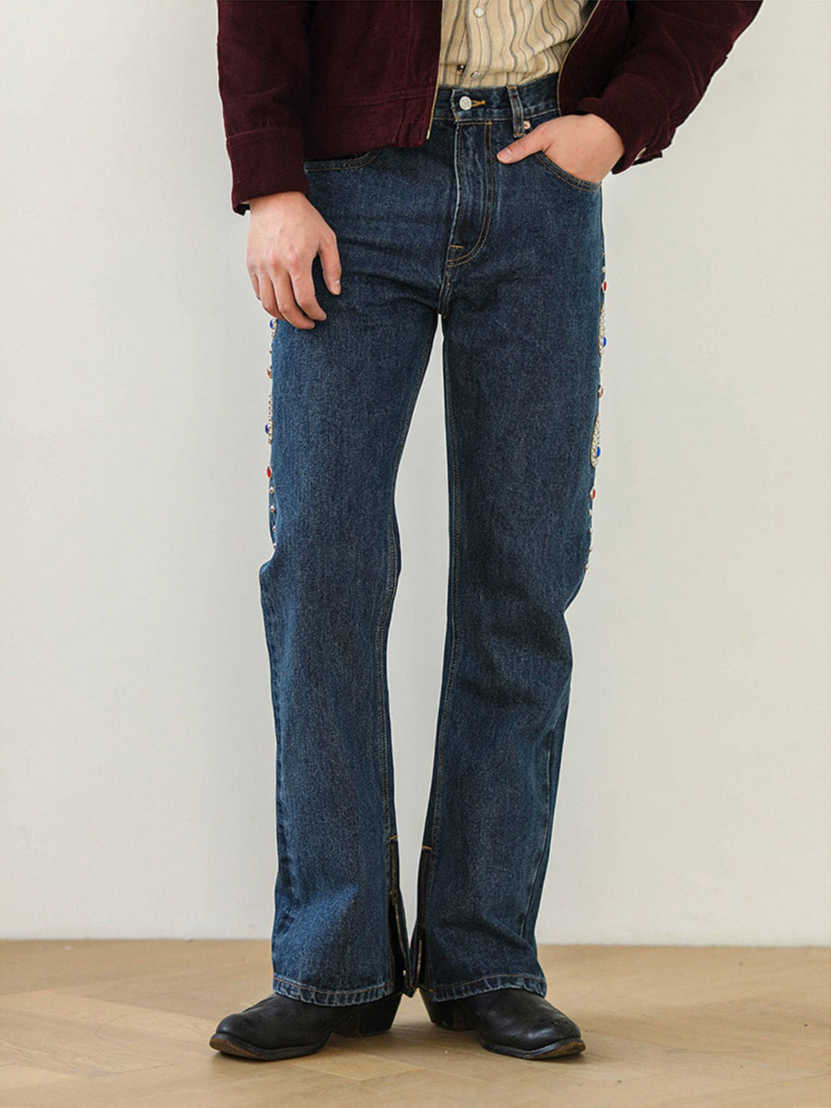 厳選されたセルビッチデニムを使用し、手作業で施されたリベットと宝石の装飾は、パンツの独特な魅力を引き立てるとともに、職人の手仕事に対するこだわりを感じさせます。耐久性と快適さにこだわったこのデニムは、長時間の着用にも耐えうるクオリティを誇ります。