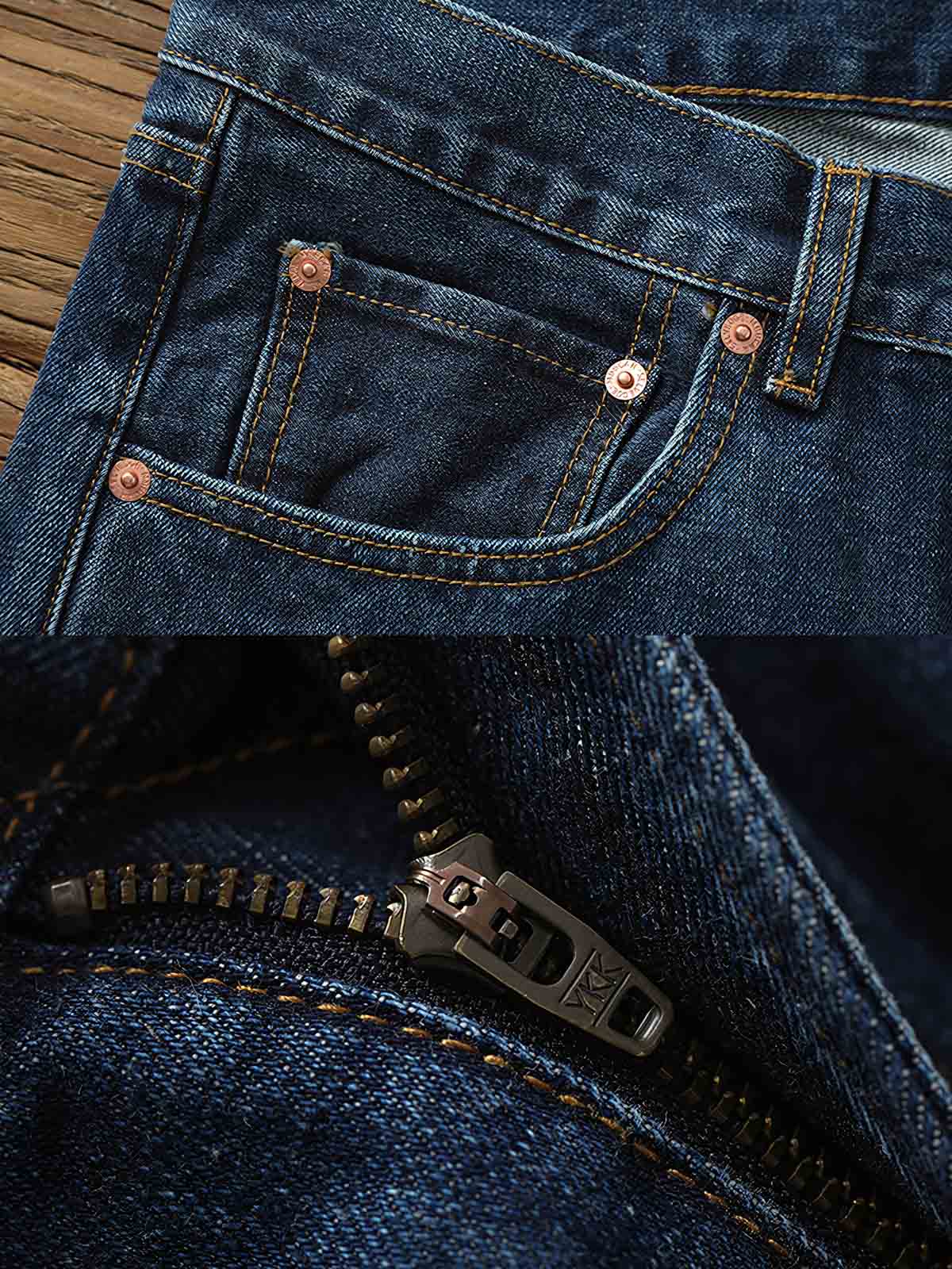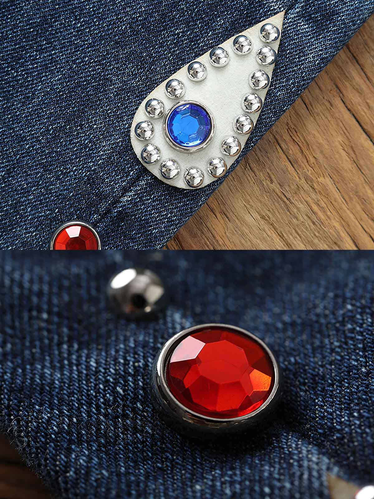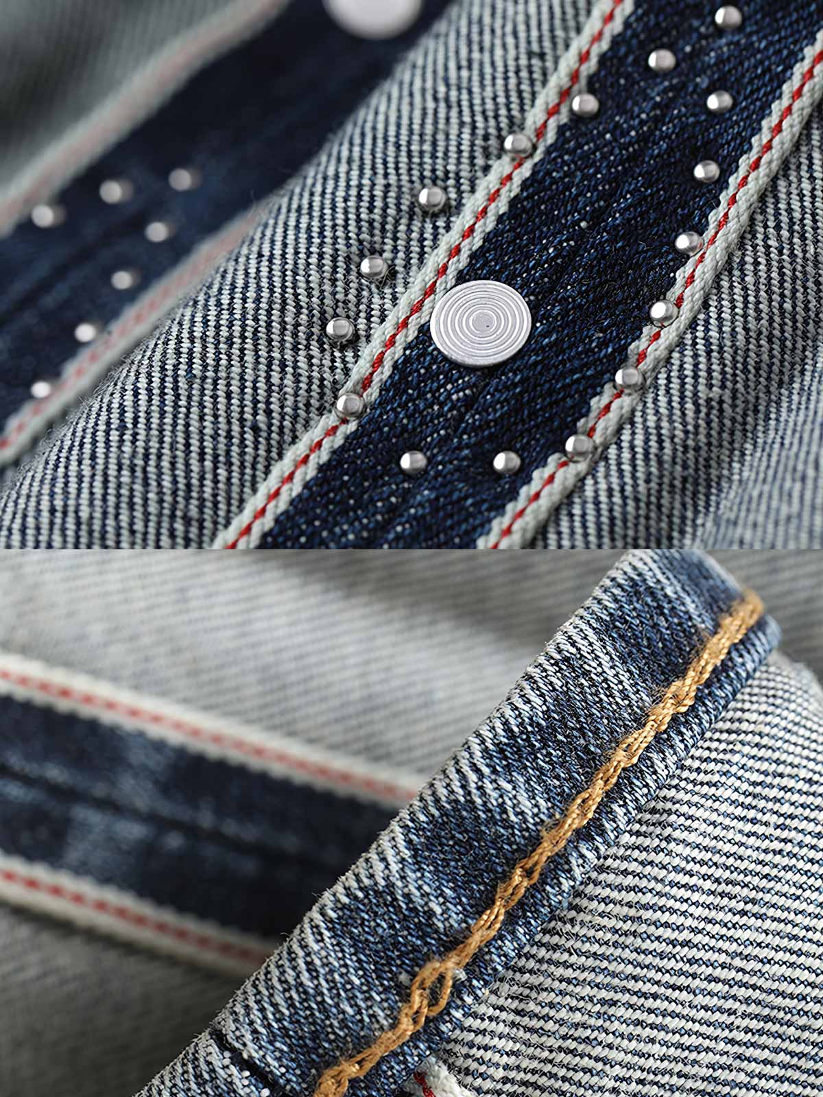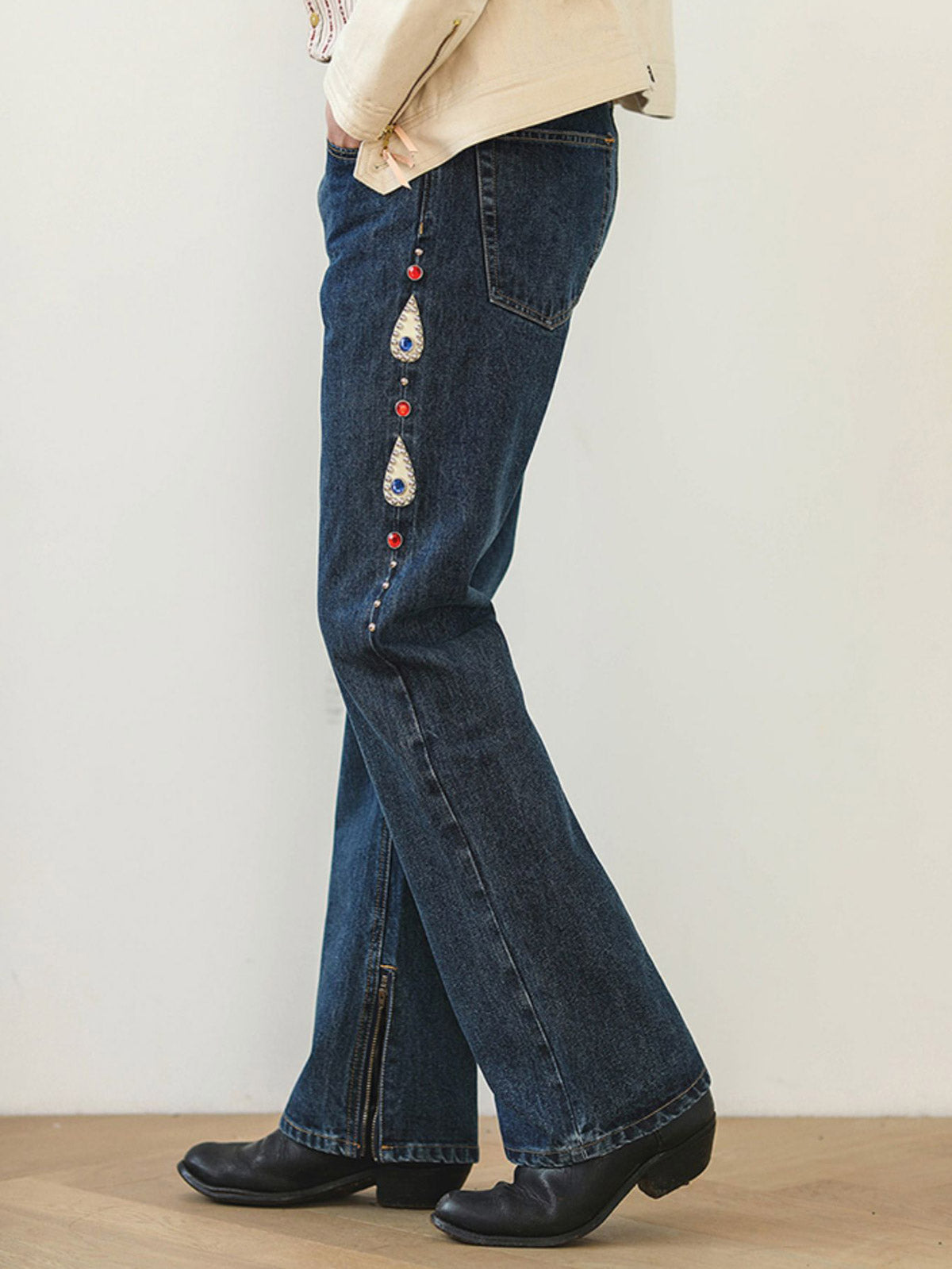 厳選されたセルビッチデニムを使用し、手作業で施されたリベットと宝石の装飾は、パンツの独特な魅力を引き立てるとともに、職人の手仕事に対するこだわりを感じさせます。耐久性と快適さにこだわったこのデニムは、長時間の着用にも耐えうるクオリティを誇ります。