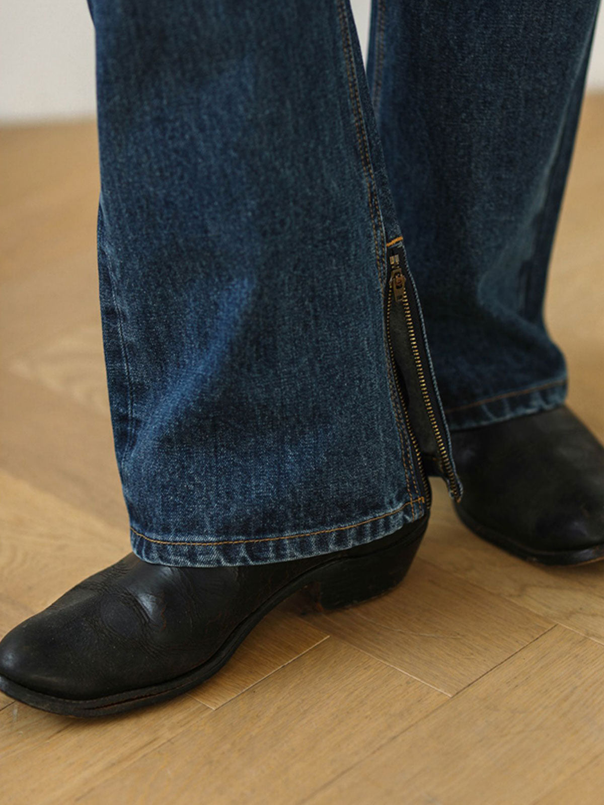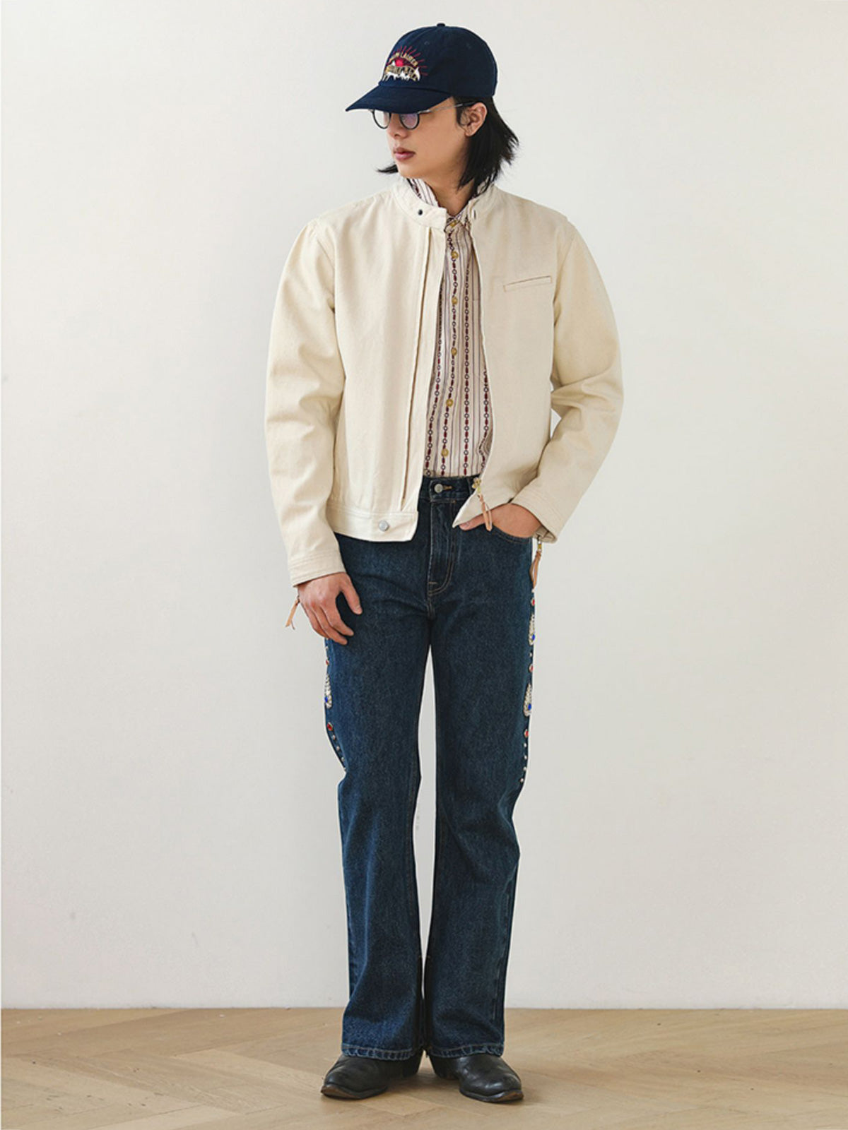 このフレアジーンズは、70年代の反骨精神を彷彿とさせるセルビッチデニムにリベットとジェムストーンをあしらい、レトロなロックスタイルにオマージュを捧げています。セルビッチとは、デニムの縁に特徴的な赤いステッチが施された高級デニムのことで、品質の追求と伝統への尊敬を表しています。