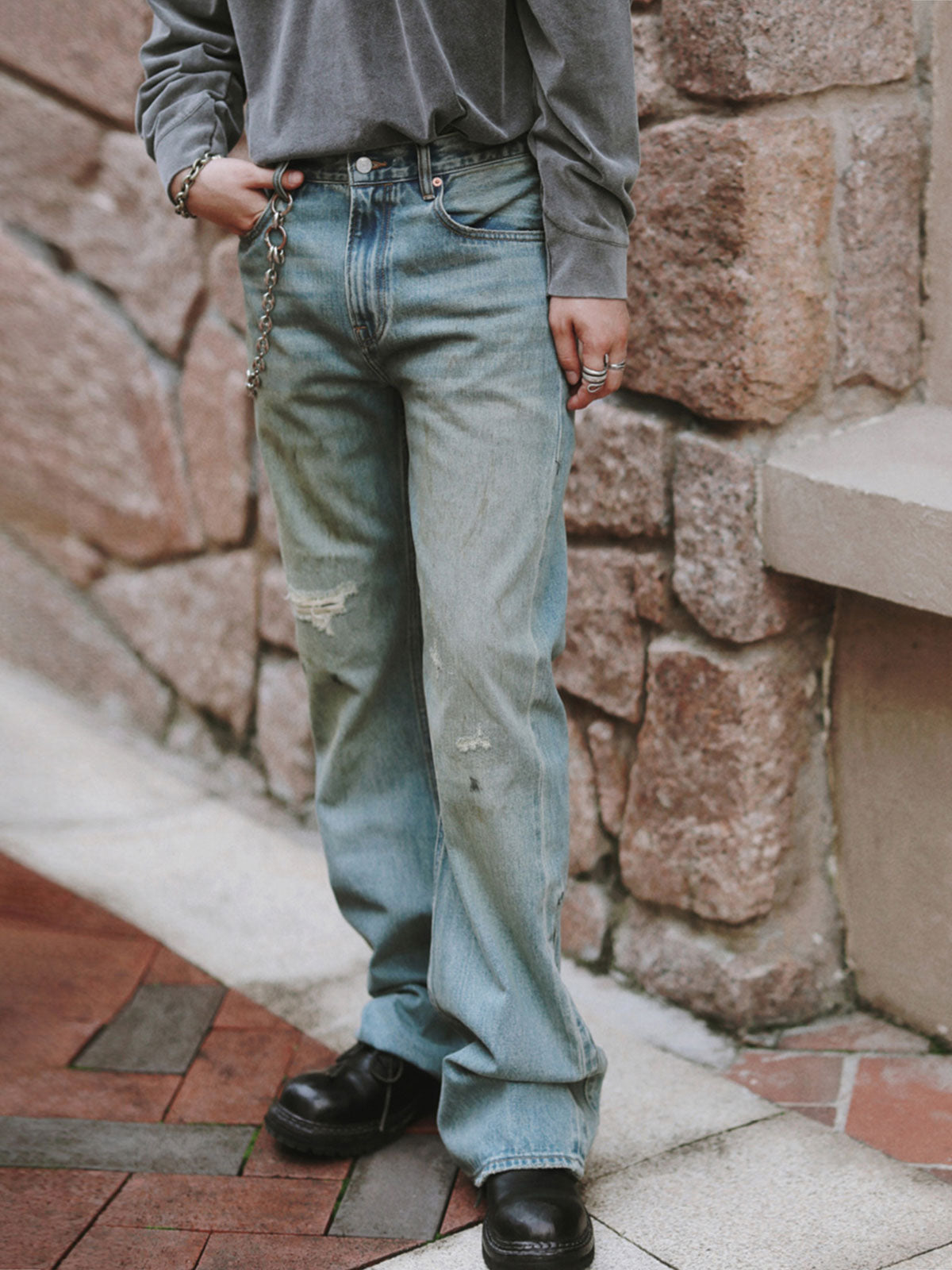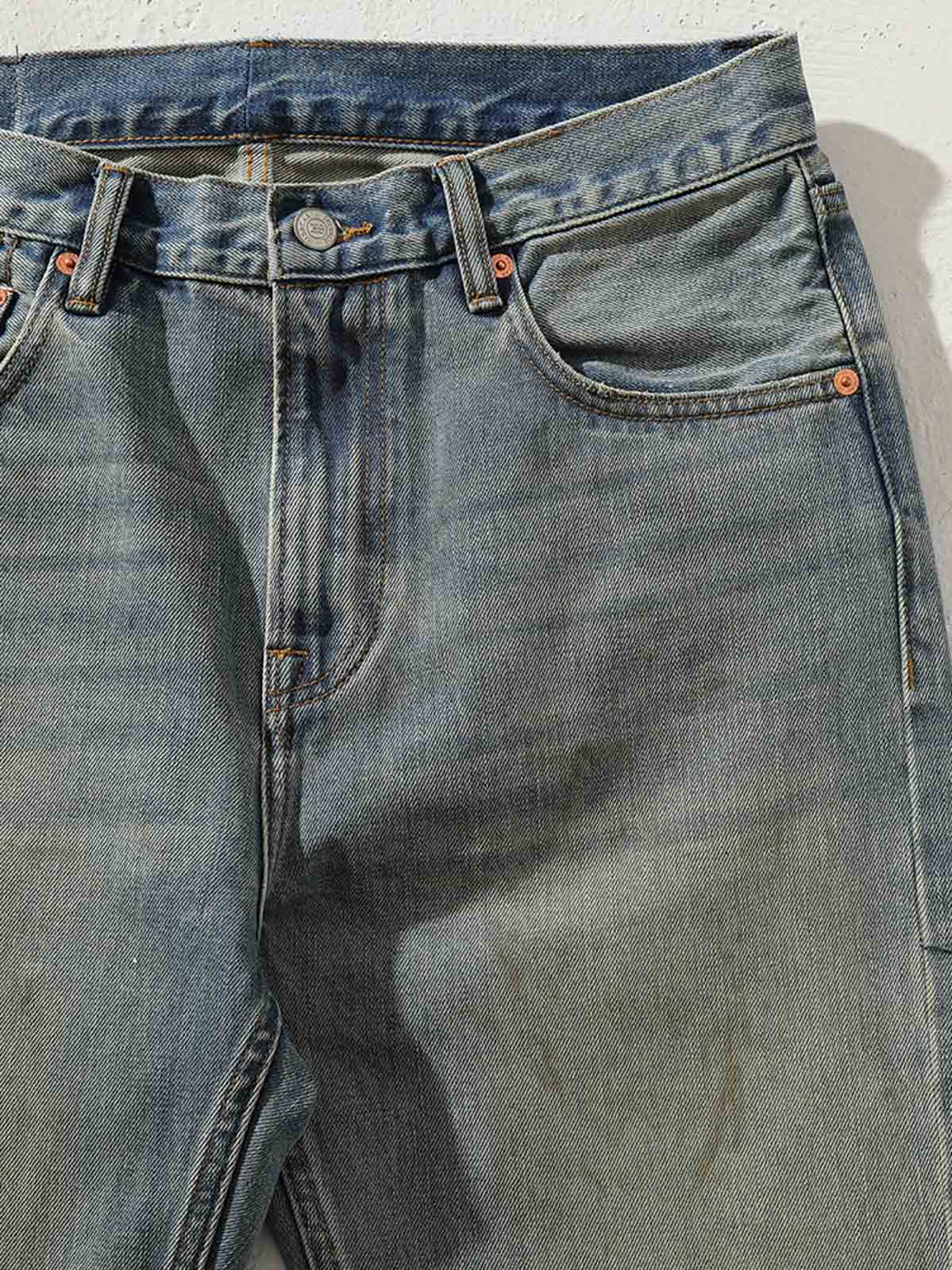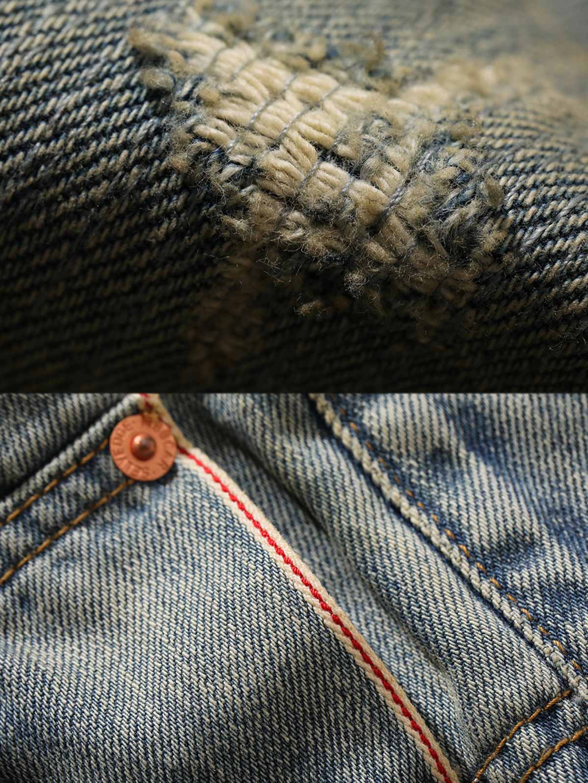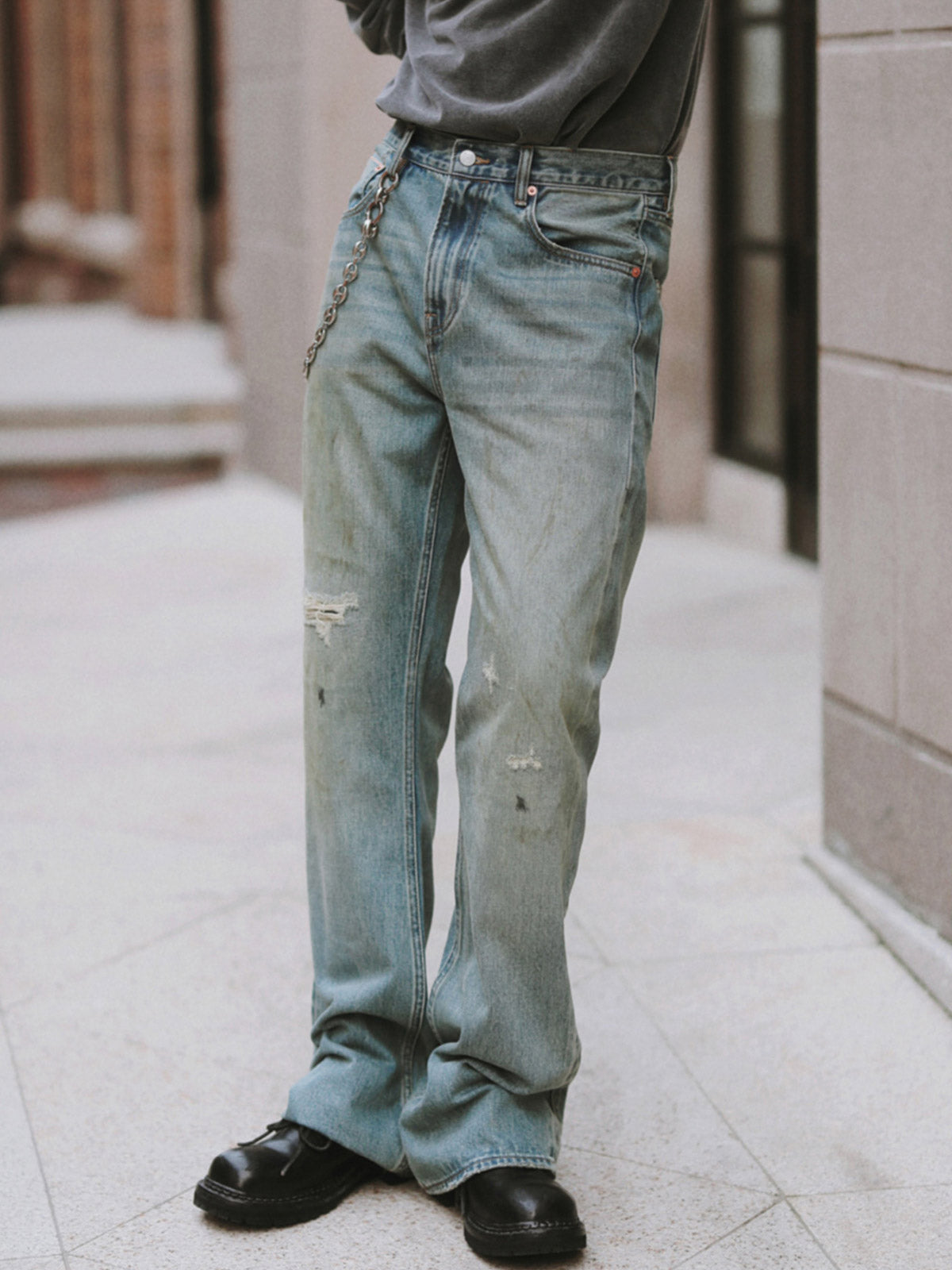 14オンスのデニム生地と手作業によるヴィンテージ加工が魅力のルーズフィットフレアパンツ。