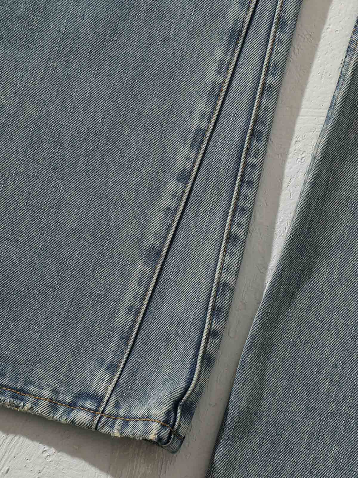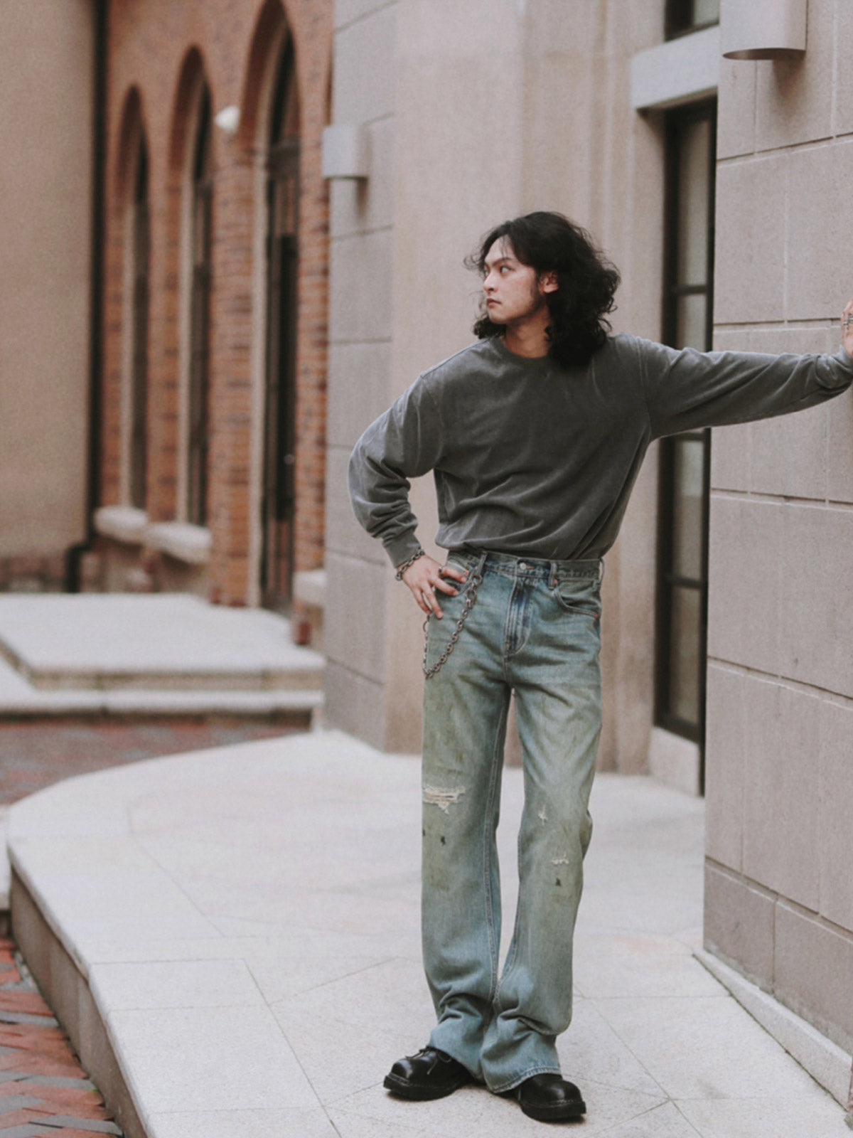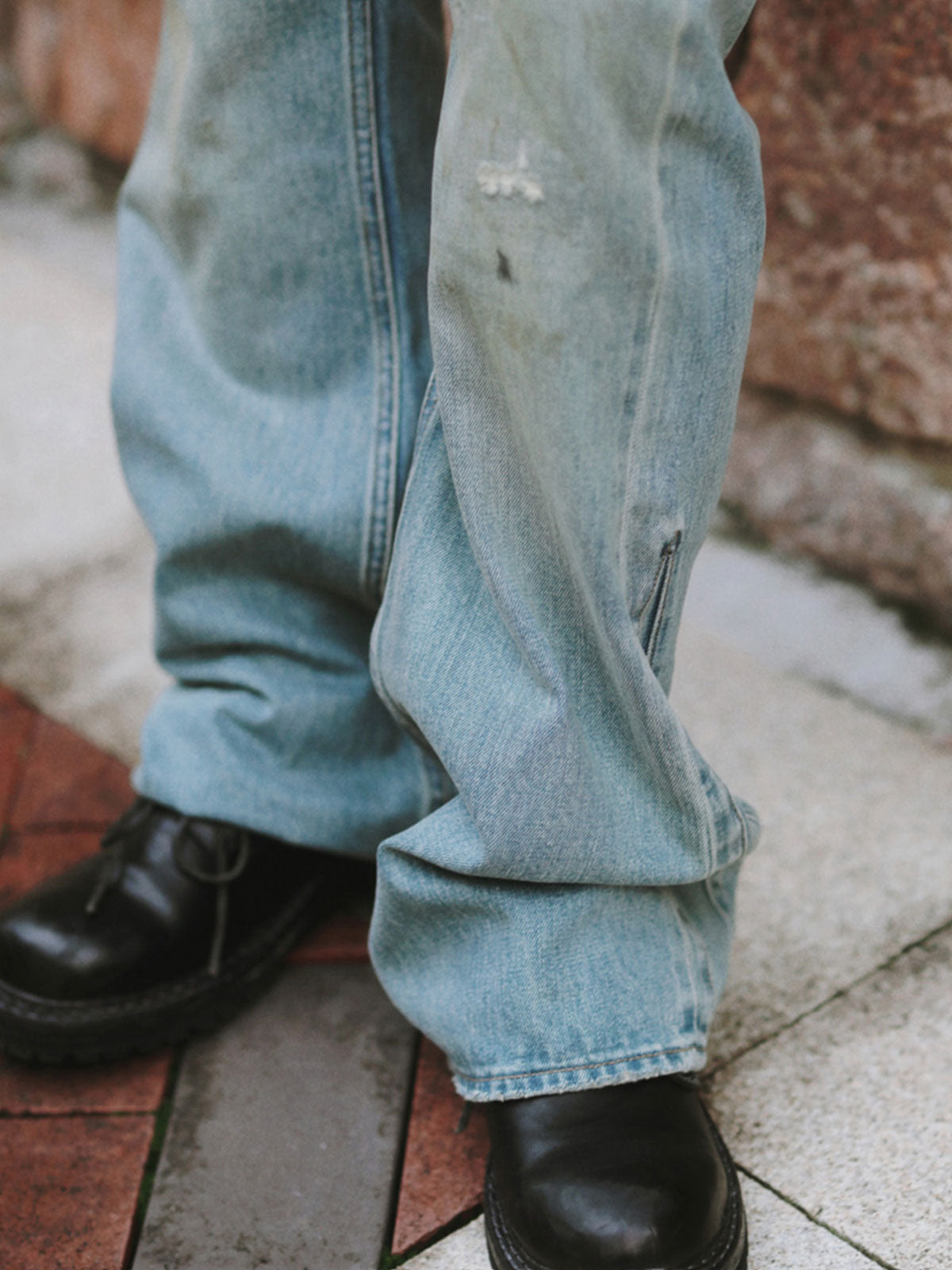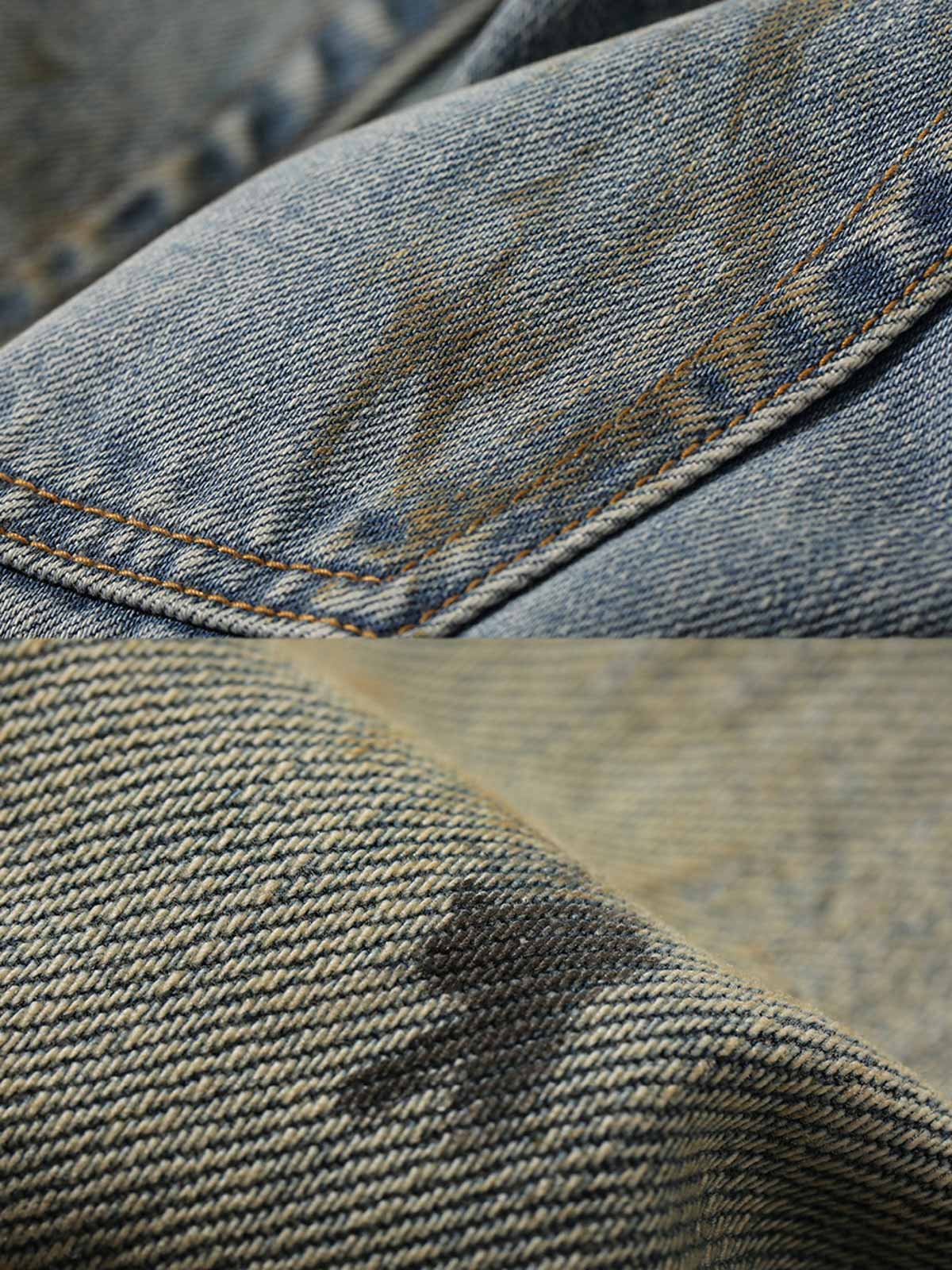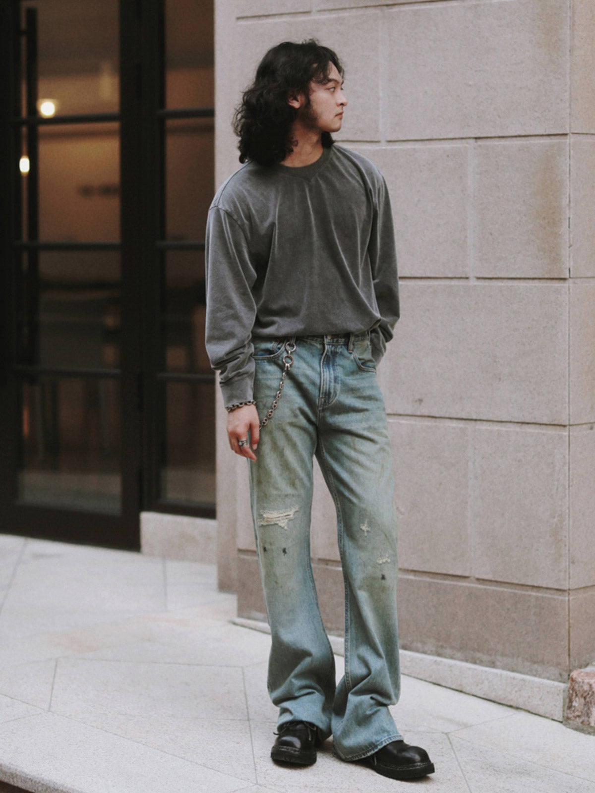 14オンスのデニム生地と手作業によるヴィンテージ加工が魅力のルーズフィットフレアパンツ。
