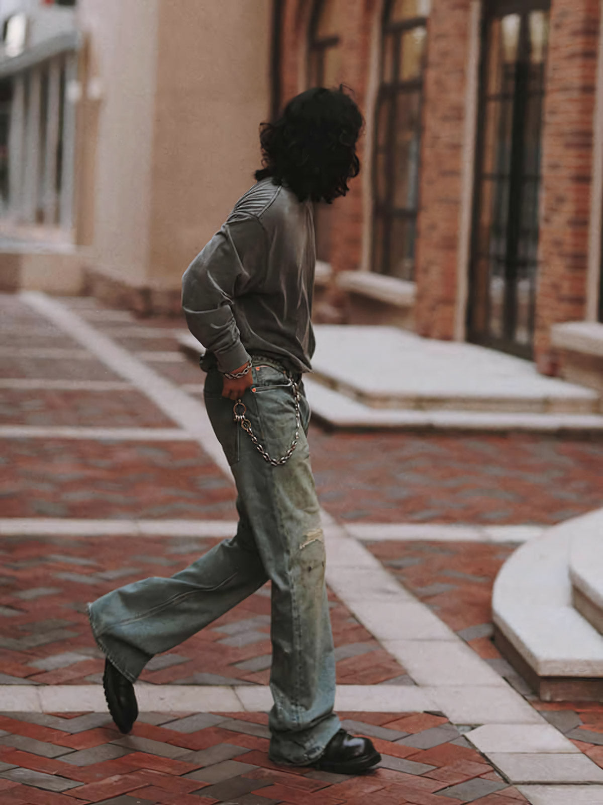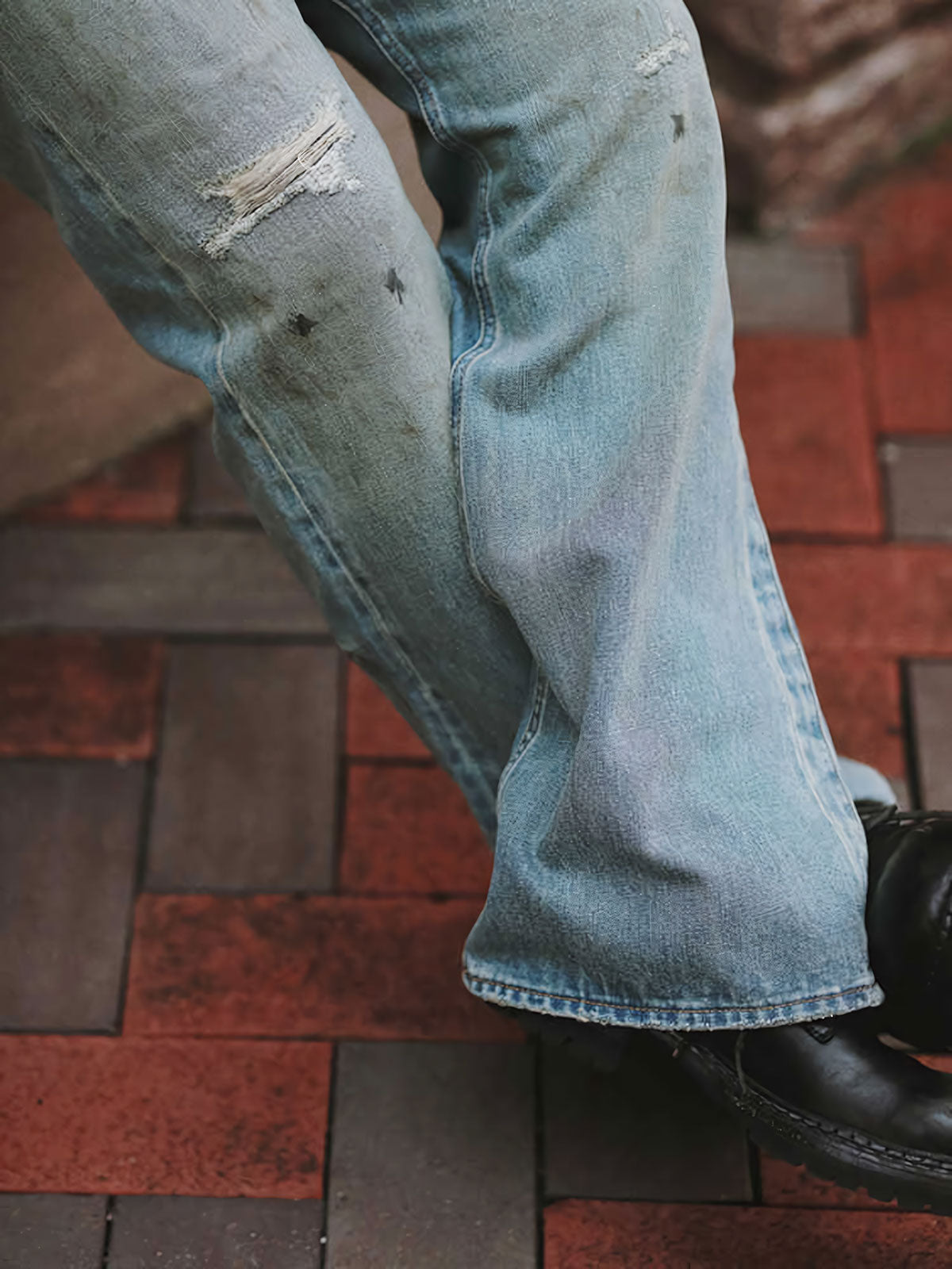 このフレアパンツは、14オンスのデニムを使用し、伝統的なシャトル織機で織られた生地が秋冬に最適な厚みと耐久性を提供します。デザイナーによる手作業で施されたユーズド加工と泥染めにより、ヴィンテージ感が引き立ちます。外側の三角形切り替えデザインがフレアシルエットを強調し、個性的なスタイルを演出。膝部分にはダメージ加工が施され、リアルな「USED」感が特徴です。複数回のウォッシュ加工による独特の風合いと、特注のYKK製金具、耐久性の高いステッチで、長く愛用できるデザインに仕上がっています。