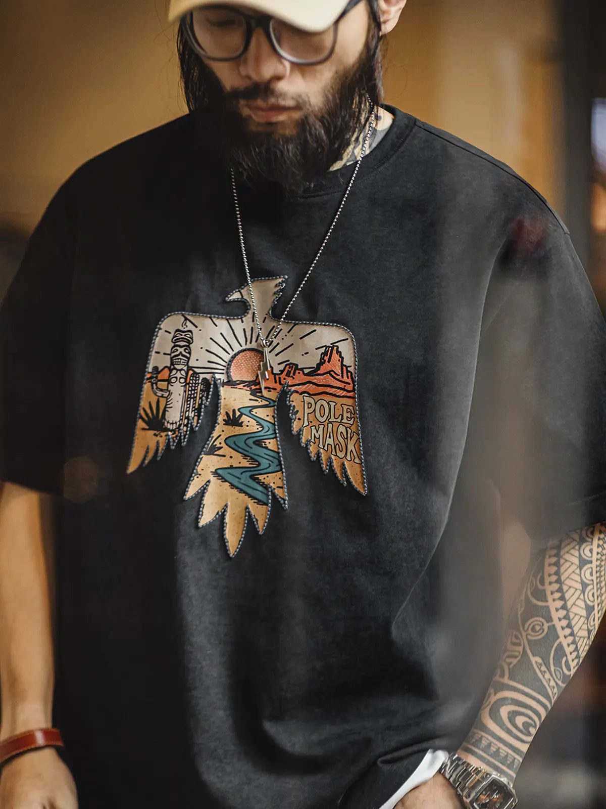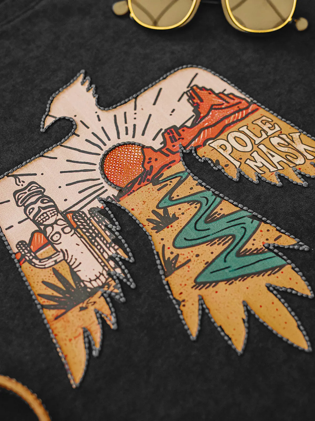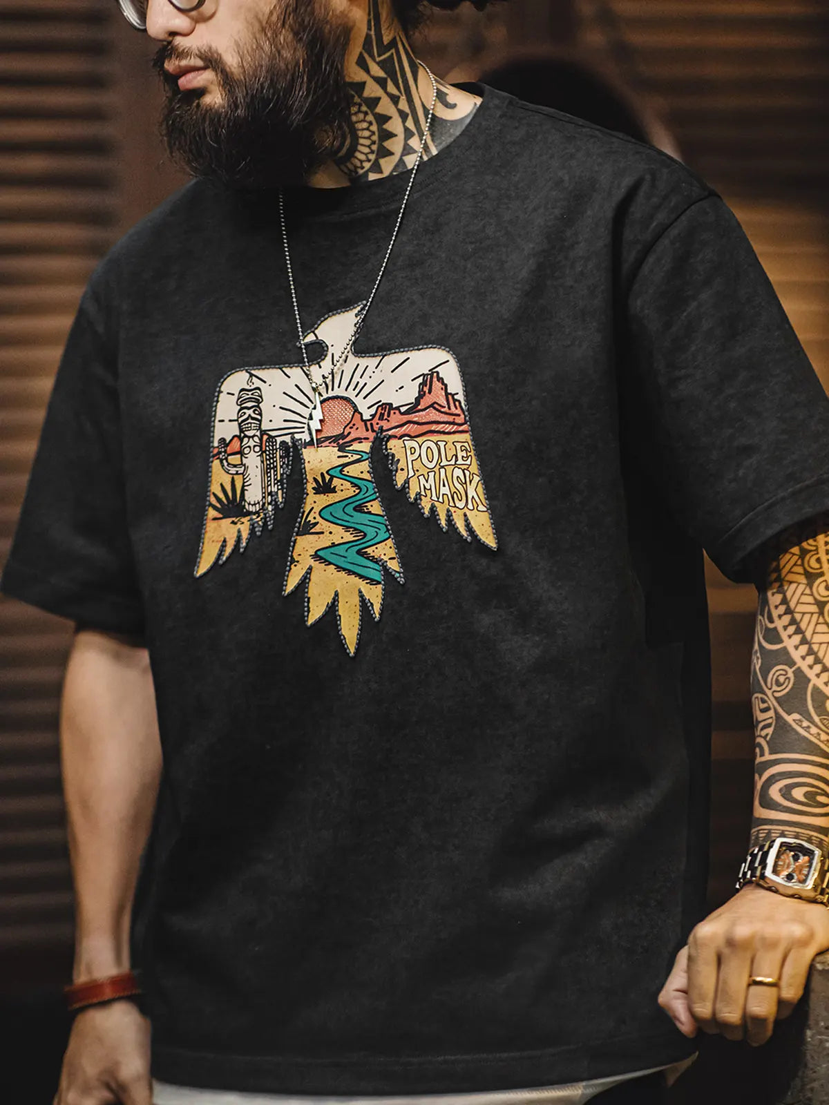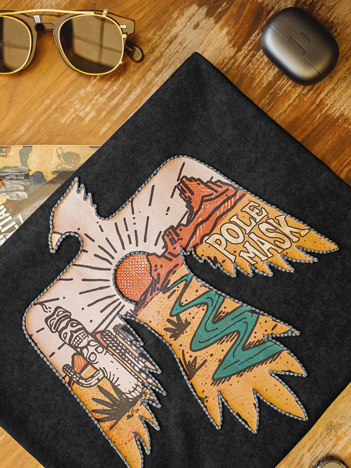 ナバホ族において雷鳥は太陽の化身であり、万物を守護する神聖な存在として崇められてきました。本作はその雷鳥を大胆に胸元に配し、周囲を立体的な刺繍で囲んだあと、内部にはモニュメントバレーの風景を高精細プリントで落とし込むことで、部族の歴史とアメリカ西部の荒野を一枚に融合。230g/m²重厚コットンを用いたジャージーが持つしっかりとした質感は、洗いを重ねるごとに味わい深く変化し、ワイドシルエットのルーズフィットは古着風のレイヤードやデニム、カーゴパンツと相性抜群。日常のカジュアルスタイルに独自の民族的エッセンスを添えます。