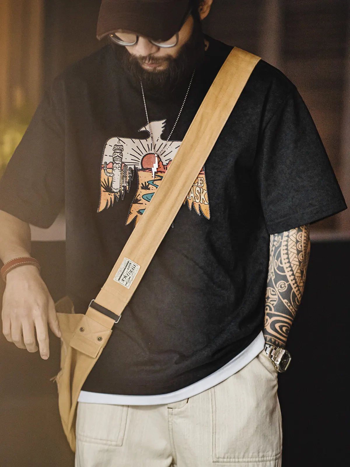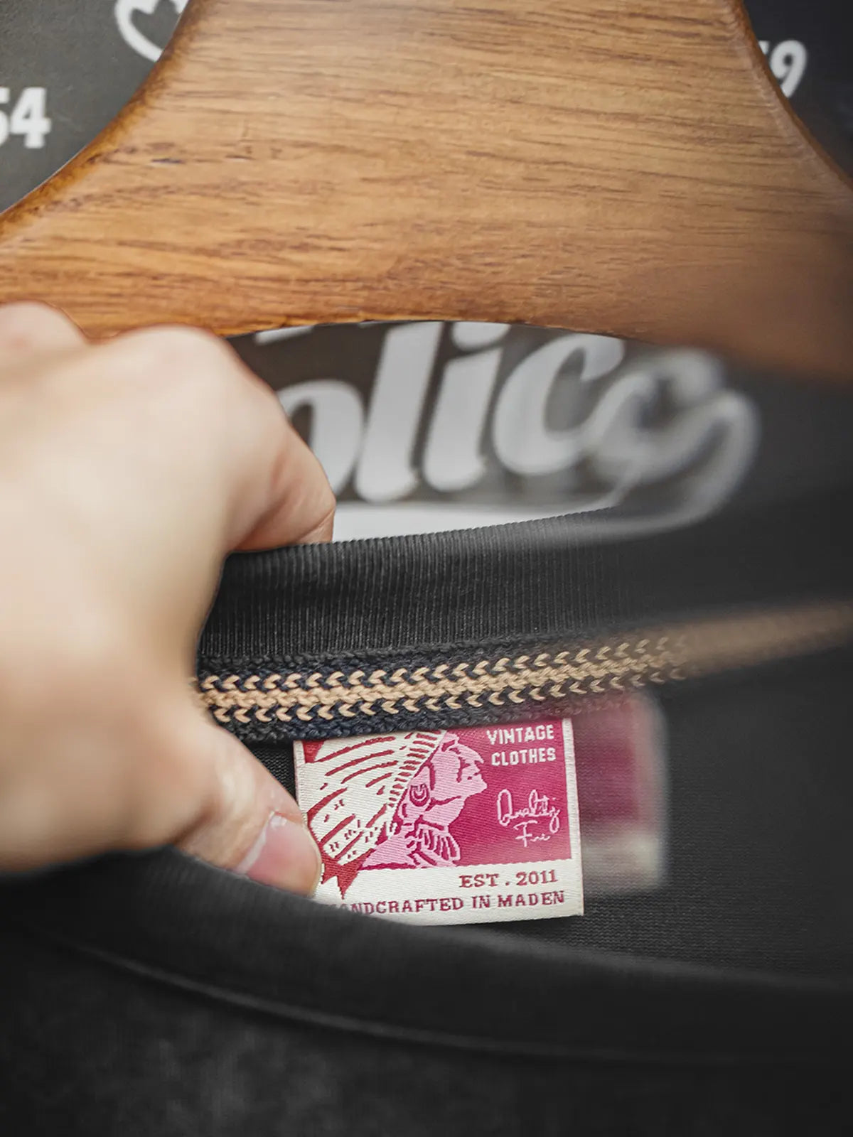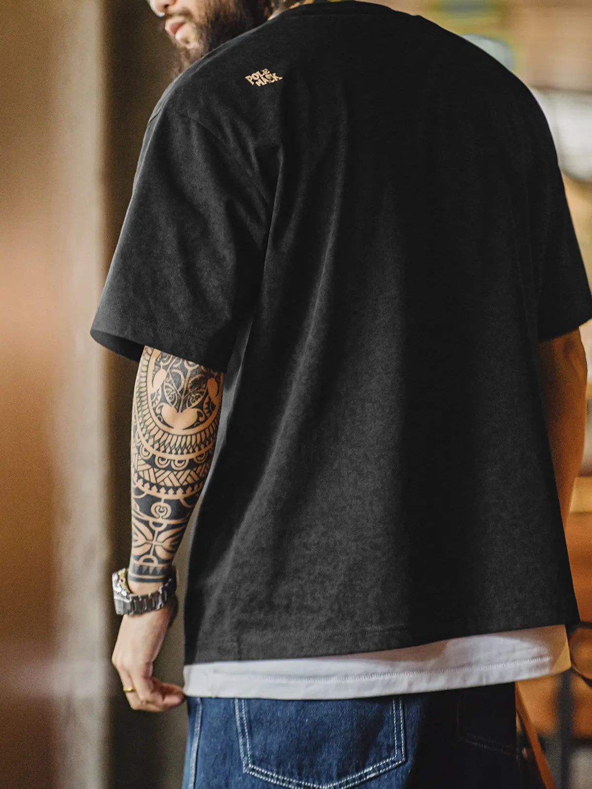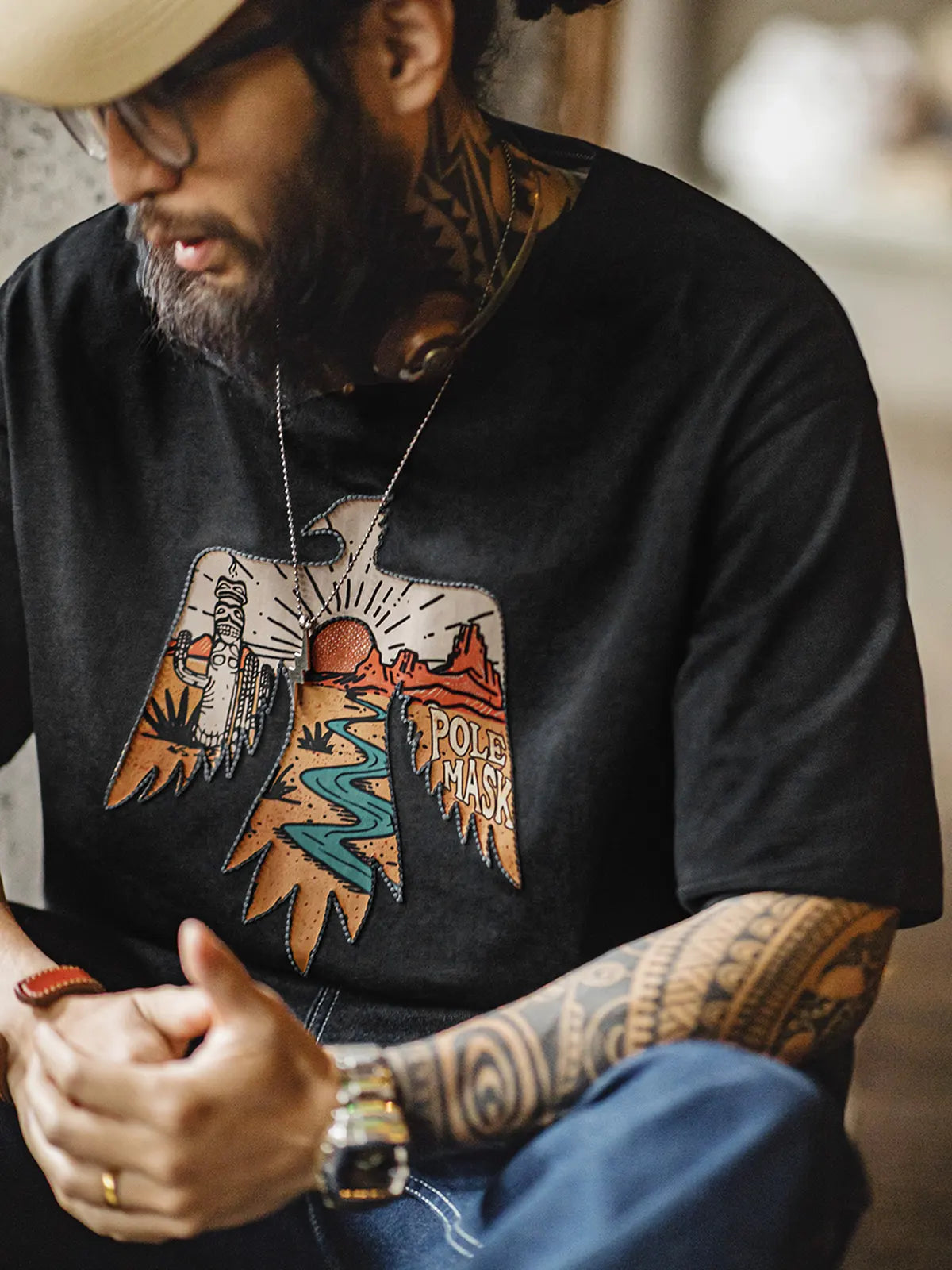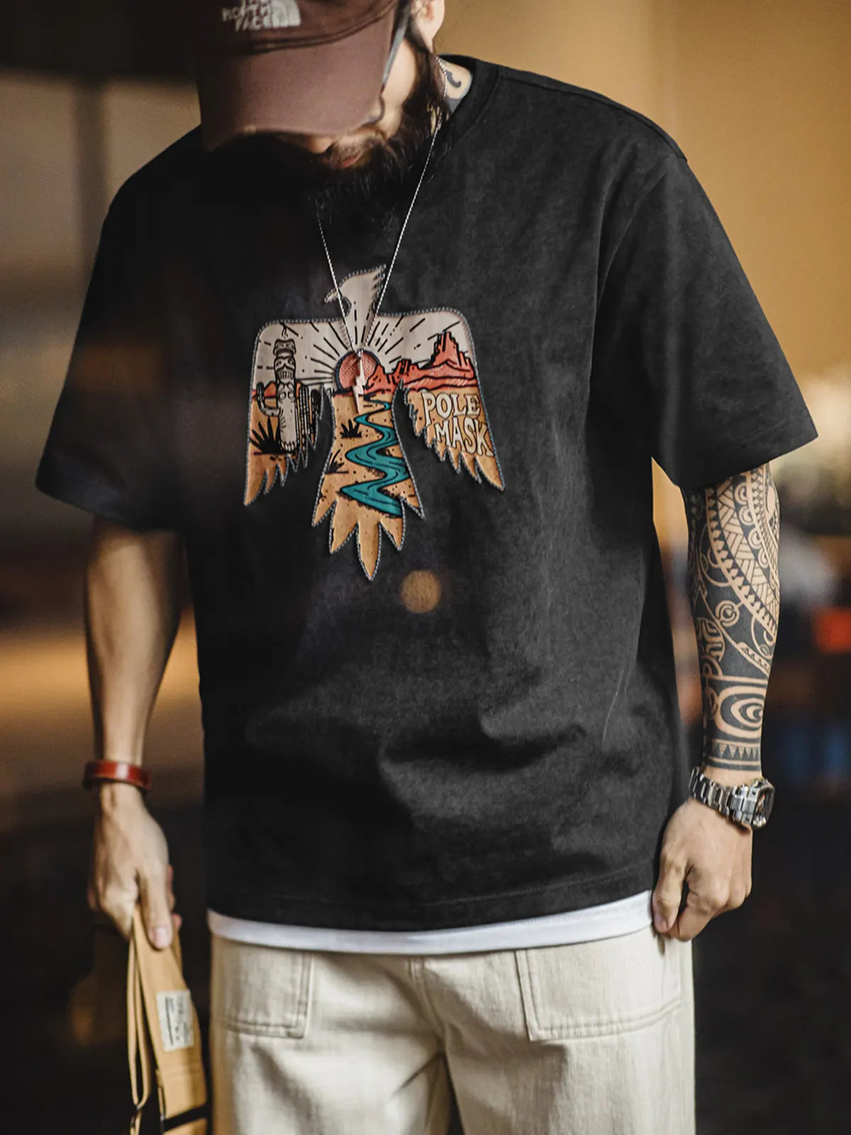 ナバホ族において雷鳥は太陽の化身であり、万物を守護する神聖な存在として崇められてきました。本作はその雷鳥を大胆に胸元に配し、周囲を立体的な刺繍で囲んだあと、内部にはモニュメントバレーの風景を高精細プリントで落とし込むことで、部族の歴史とアメリカ西部の荒野を一枚に融合。230g/m²重厚コットンを用いたジャージーが持つしっかりとした質感は、洗いを重ねるごとに味わい深く変化し、ワイドシルエットのルーズフィットは古着風のレイヤードやデニム、カーゴパンツと相性抜群。日常のカジュアルスタイルに独自の民族的エッセンスを添えます。