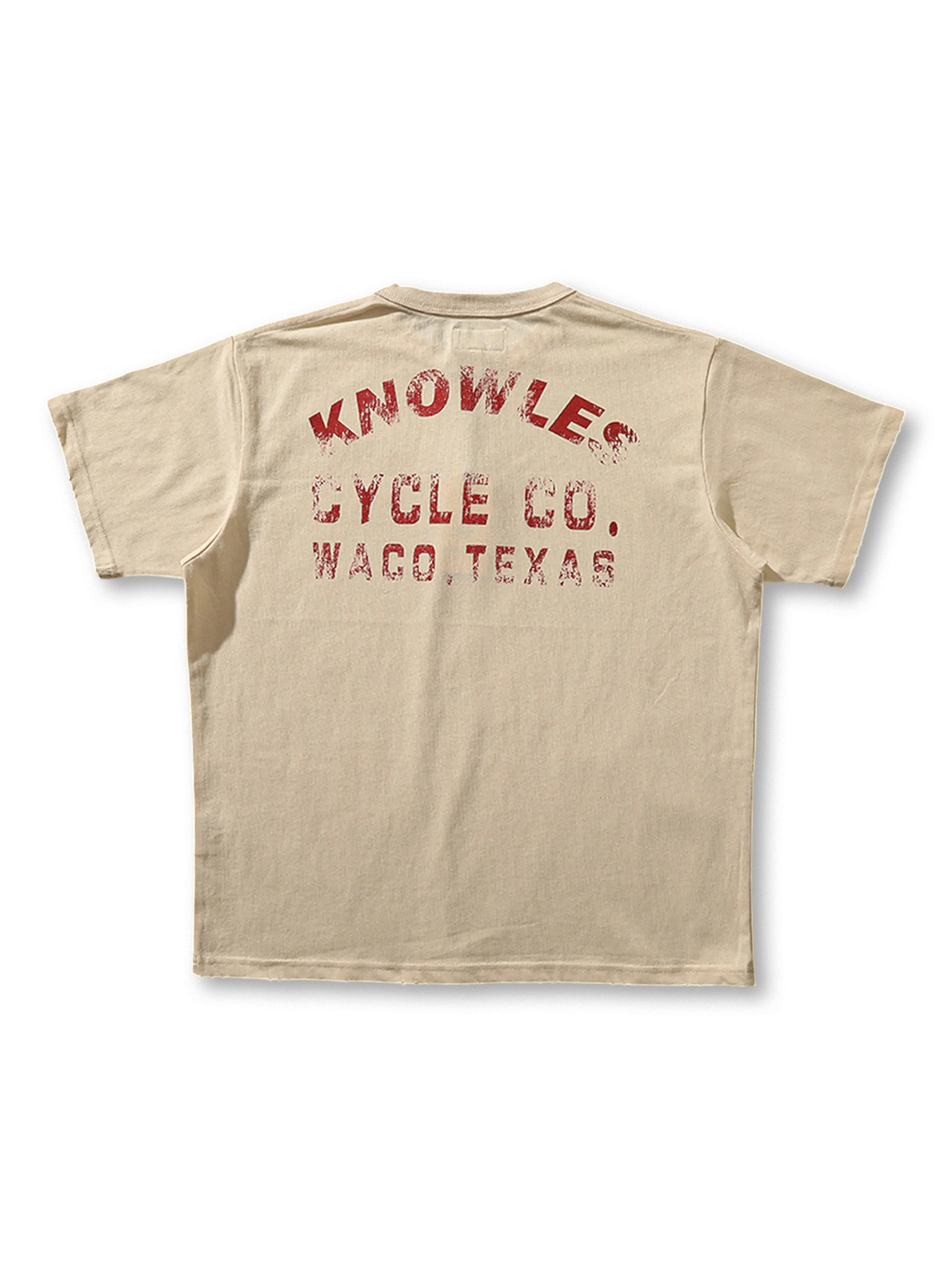 1950年代のバイクショップ広告を甦らせる、粗支綿糸のヴィンテージ風Tシャツ。