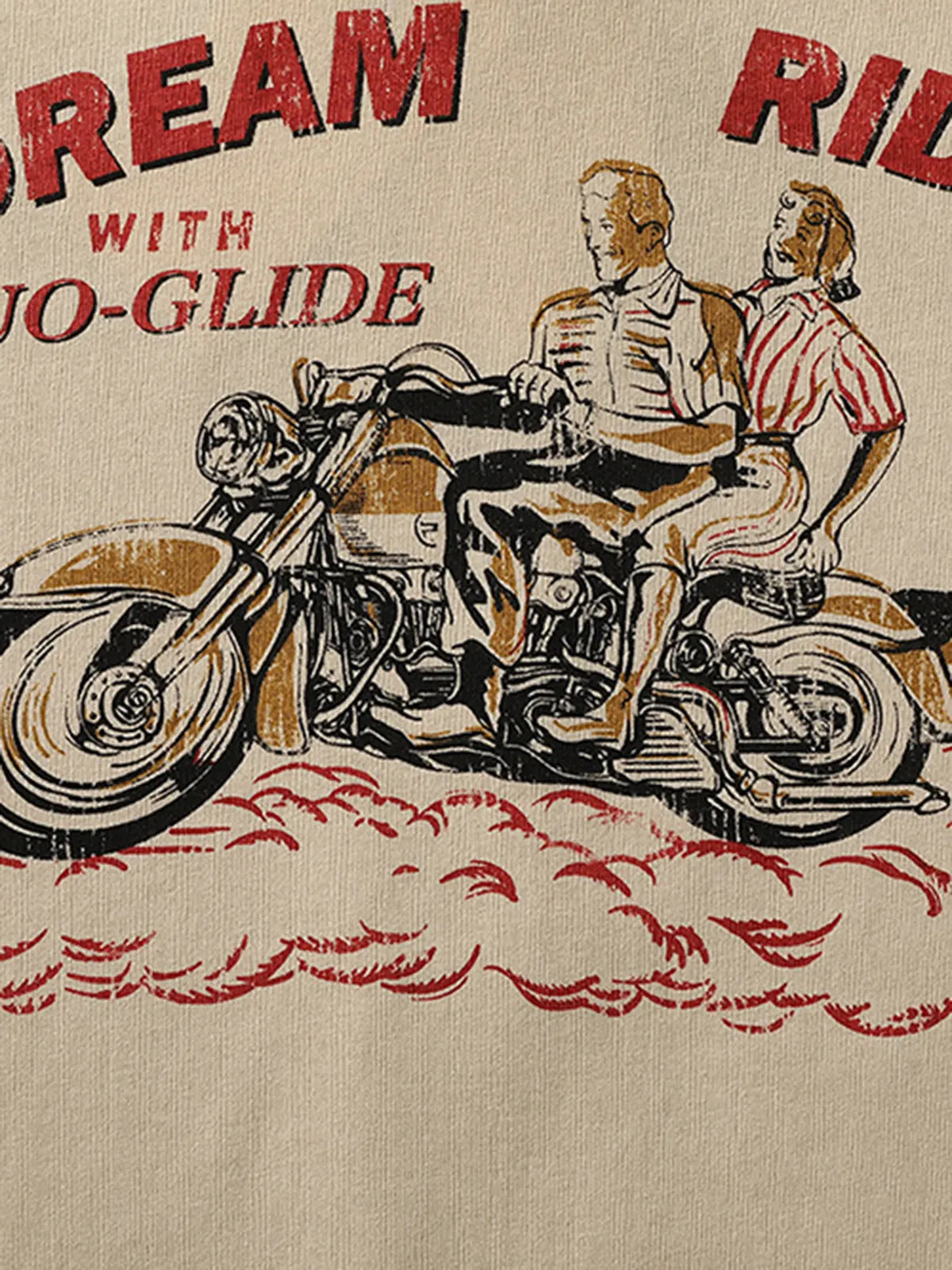 粗支定番コットン糸で織り上げた厚手ボディに、往年のハーレー店広告をモチーフとしたプリントを配し、当時のアメリカンロードムードを忠実に再現。英国製COATSラインの縫製が耐久性を支え、固色水洗加工で到着後すぐに着られるユーズド感を実現。狭幅の匠調整シルエットは、デニムジャケットやワークパンツと好相性で、ストリートにもツーリングにも映える一枚です。