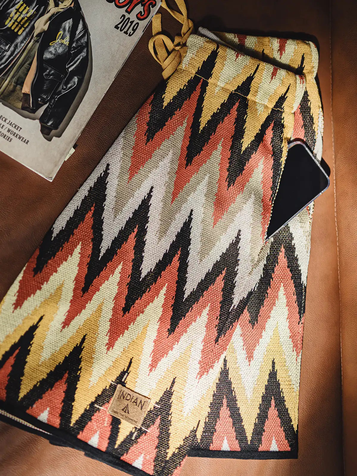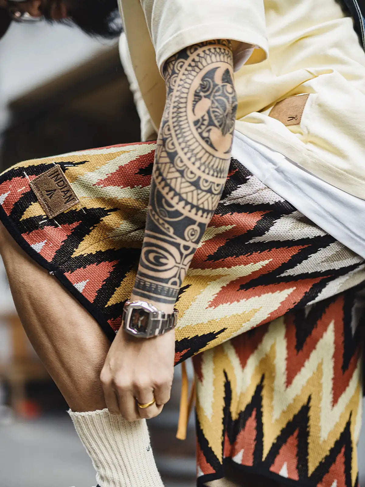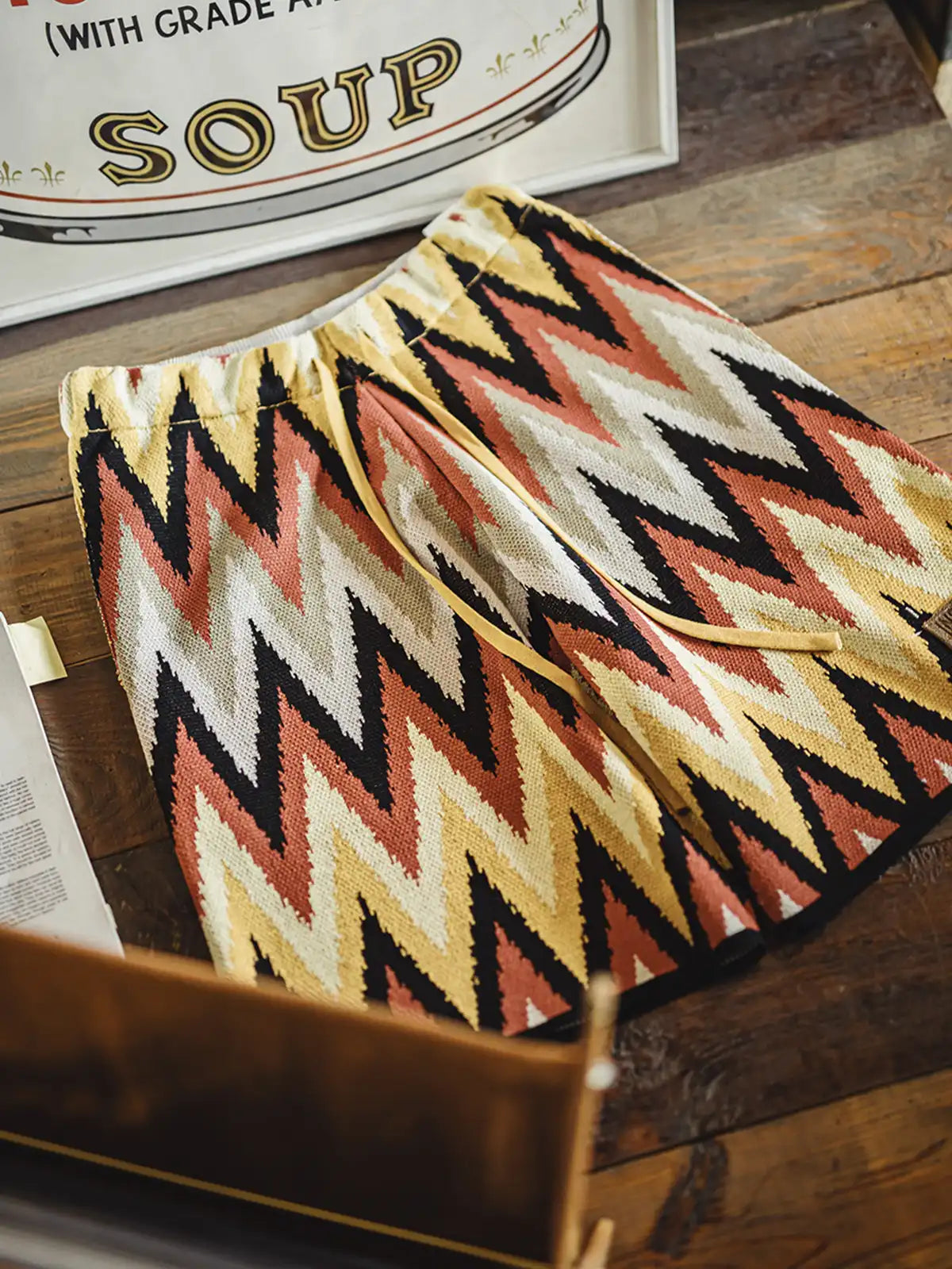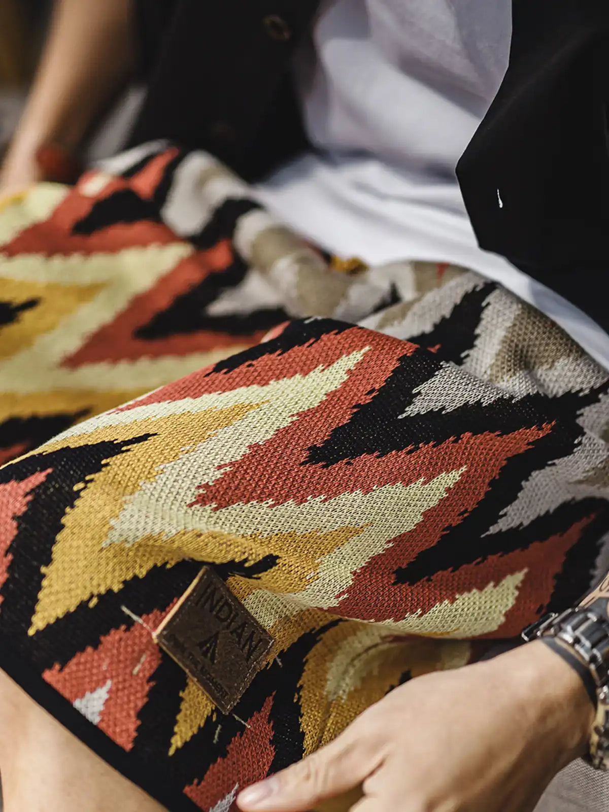 ナバホ族の伝統的なジグザグ柄は山脈や水流を象徴し、部族の自然信仰を表現するモチーフとして553gの重厚な粘纤/ナイロン混紡生地に立体的に編み込まれ、隠しポケットとヴィンテージ調のレザータグが機能性と歴史性を両立。イエローとエンジのアースカラーが大地との共生を示し、シンプルな無地Tシャツやサンダルと合わせるだけでリゾート感あふれるスタイリングが完成。