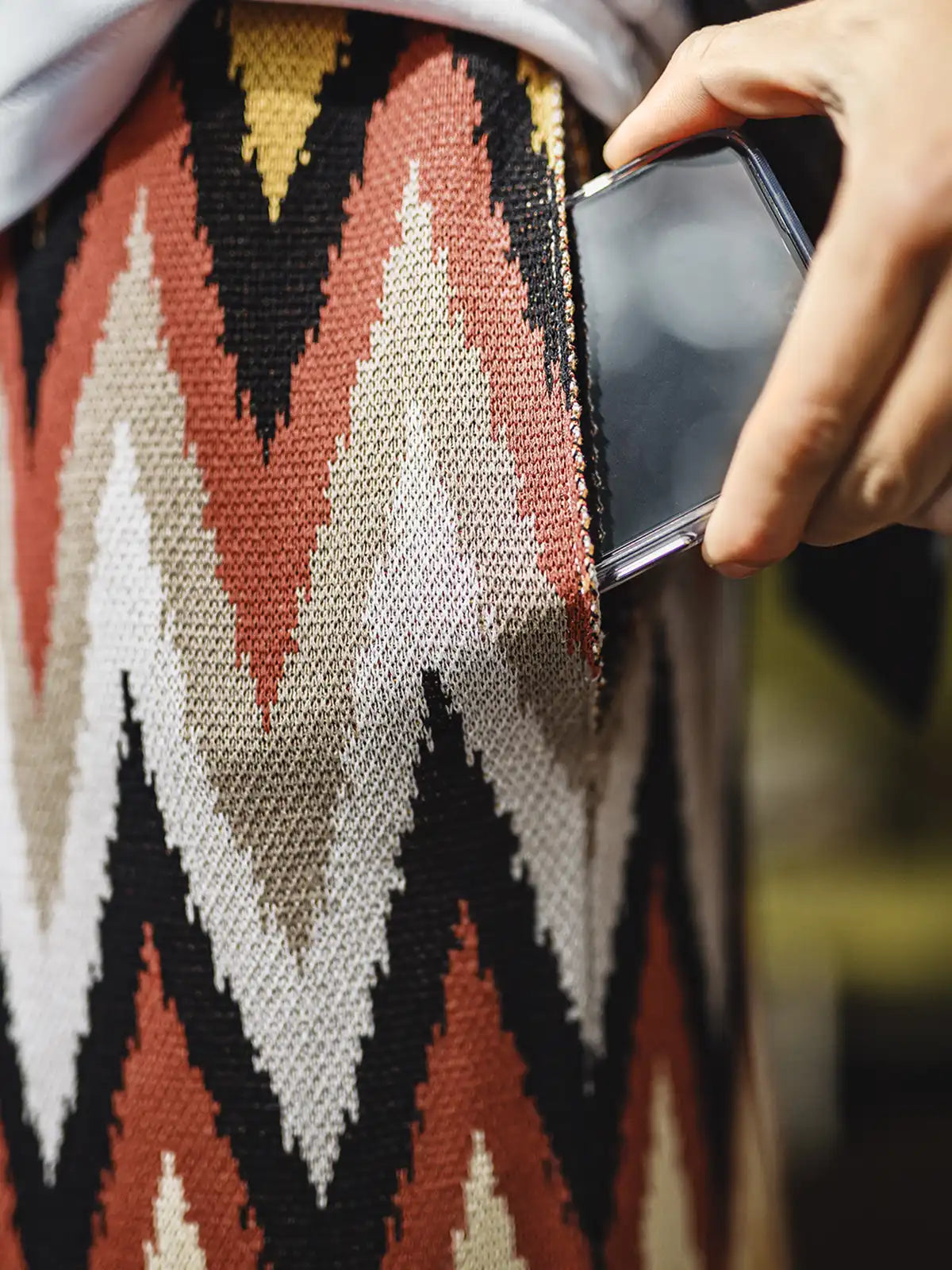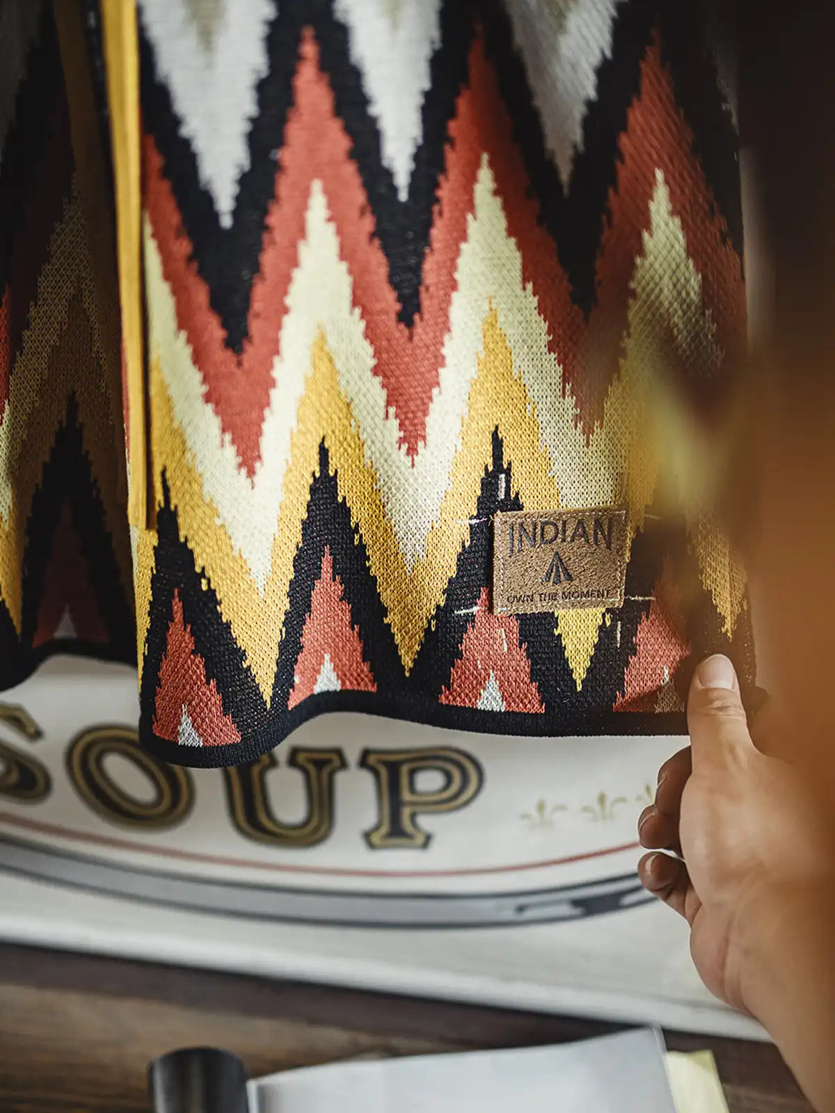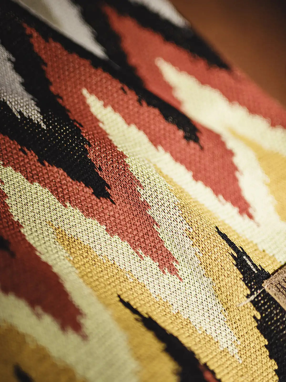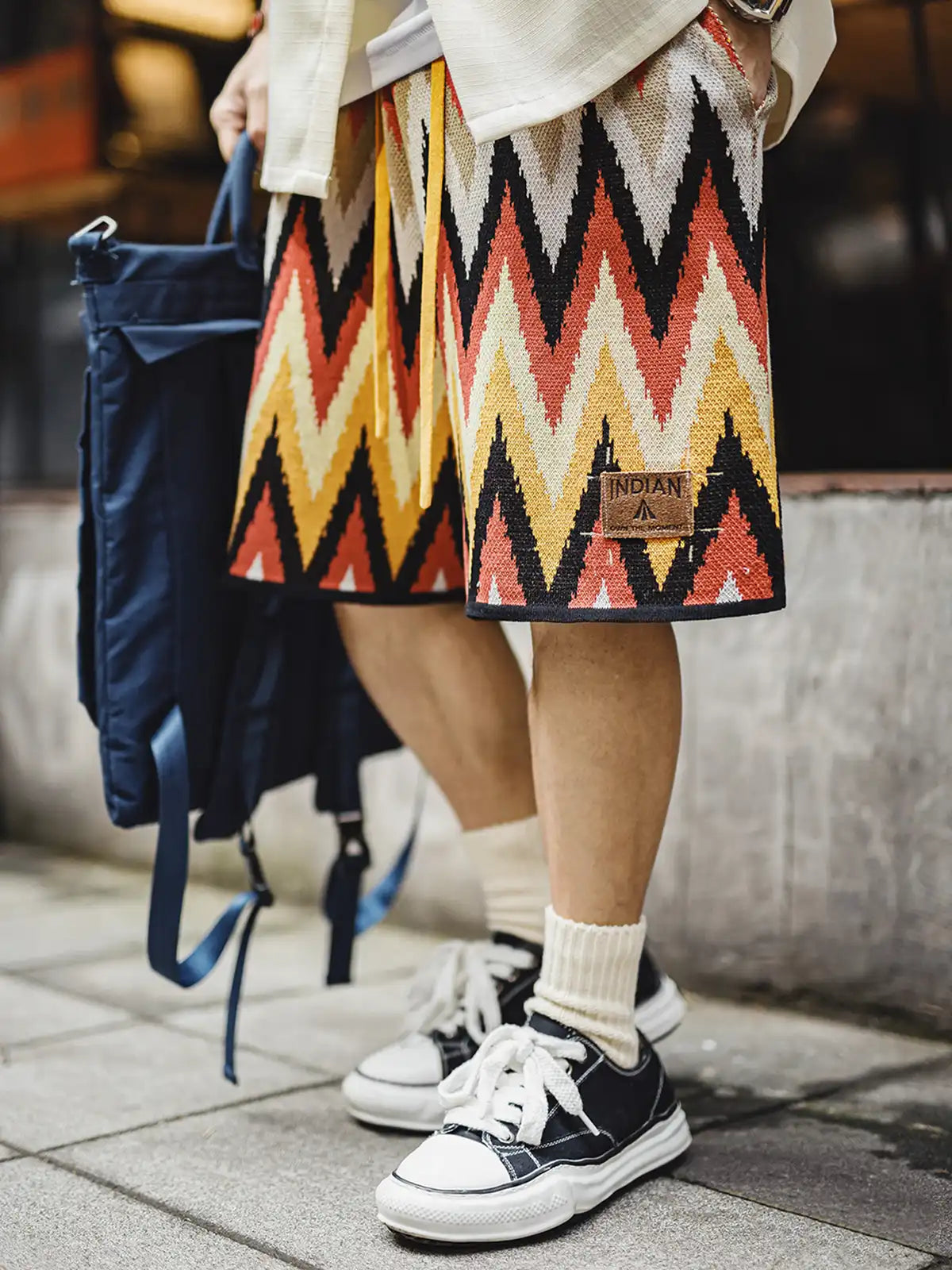 ナバホ族の伝統的なジグザグ柄は山脈や水流を象徴し、部族の自然信仰を表現するモチーフとして553gの重厚な粘纤/ナイロン混紡生地に立体的に編み込まれ、隠しポケットとヴィンテージ調のレザータグが機能性と歴史性を両立。イエローとエンジのアースカラーが大地との共生を示し、シンプルな無地Tシャツやサンダルと合わせるだけでリゾート感あふれるスタイリングが完成。