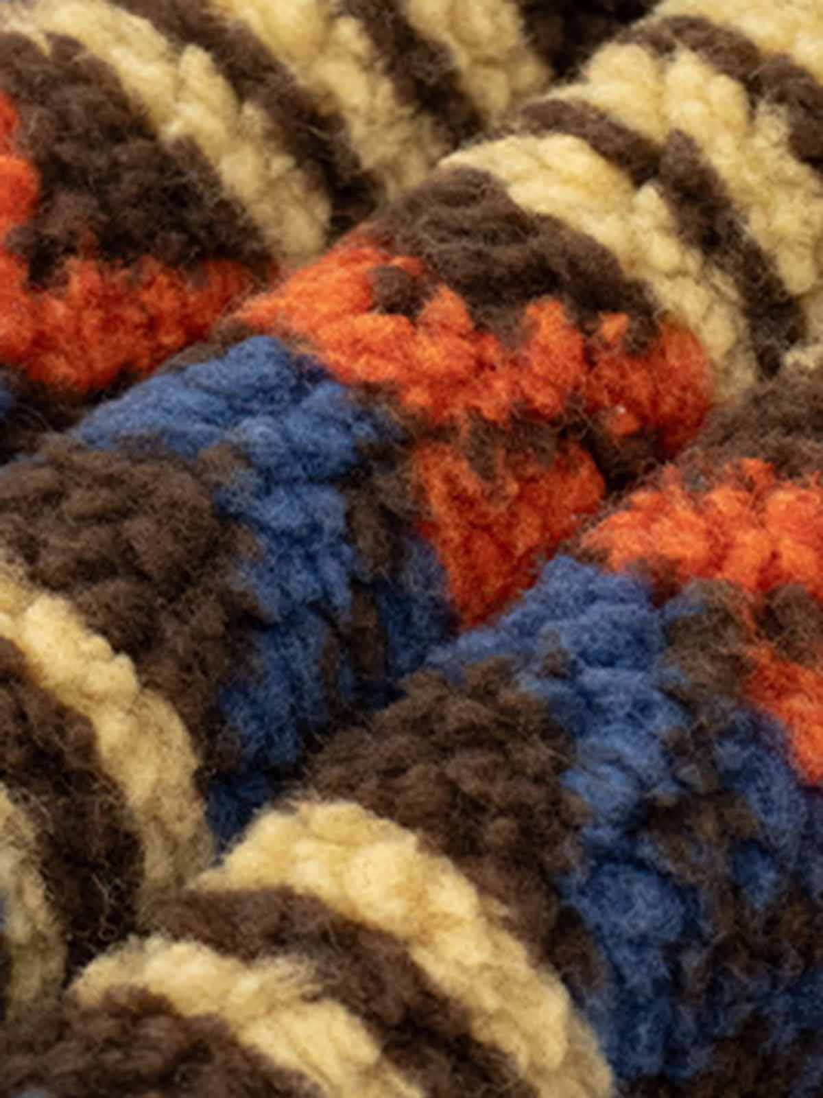 本ジャケットは柔らかくふんわりとしたシープフリース生地に、多彩な幾何学模様の織り加工を施し、エスニックなヴィンテージ感を表現します。半オープンなフロントデザインと胸部のパッチポケットがレイヤード感と実用性をプラスし、袖口はスナップボタンで調節可能なディテールを採用しているため、フィット感を自由にコントロールできます。カジュアルなデニムやワークパンツとのコーディネートで、アメリカンカジュアルな個性と温もりを演出する、幅広いシーンにマッチする一着です。