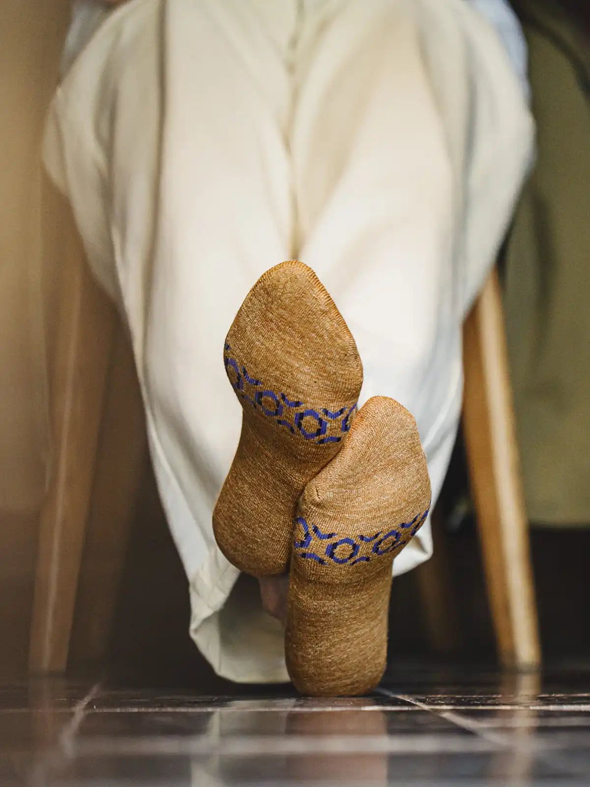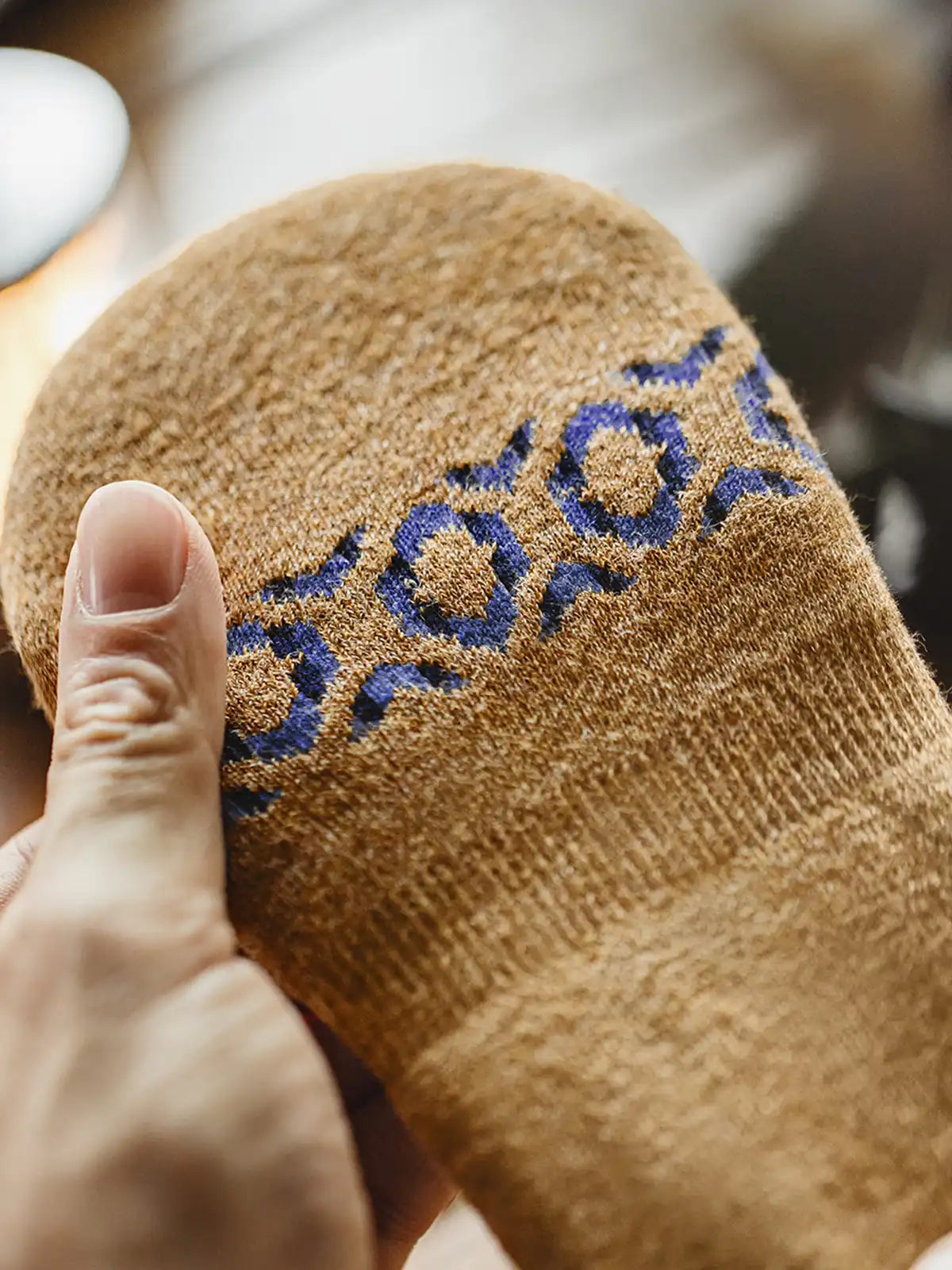 32gの高コットン含有率と定比混紡素材(コットン80.7%、ポリエステル18.2%、ポリウレタン1.1%)が耐久性とストレッチ性を両立し、168本毛圈編み+32番手精紡綿による内外一体の滑らかな肌触りを実現。ナバホ族の伝統菱形モチーフをミッドバンドに配し、シューズを脱いでもスタイルを崩さず、かかとには3Dシリコーン滑り止めを装備して脱げにくいホールド感を提供。2足セットで日替わりコーデにも対応します。