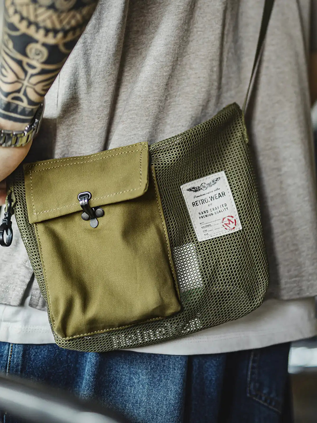40年代米軍ツールポーチから着想を得た独立ポケットと軽量メッシュ素材が機能性と携行性を両立するサマーショルダーバッグ。