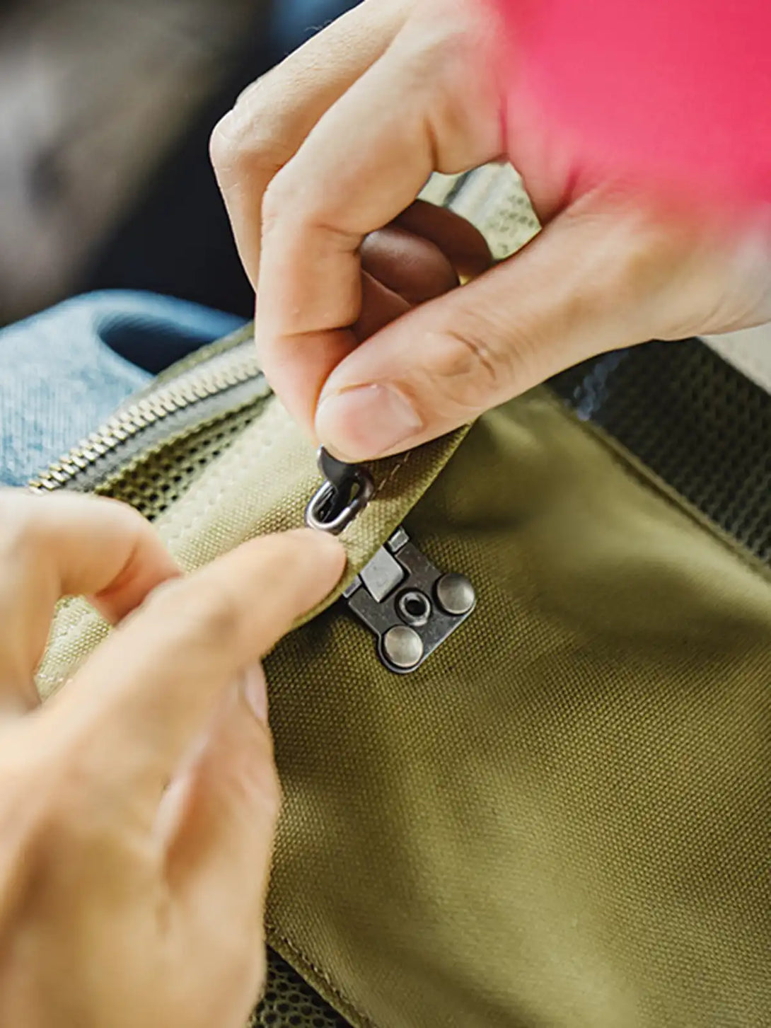 - メイン収納は通気性と視認性に優れるメッシュコンパートメントを採用し、前面のフラップポーチは真鍮留め具で素早く開閉可能。日常の必需品をスマートに整理できます。